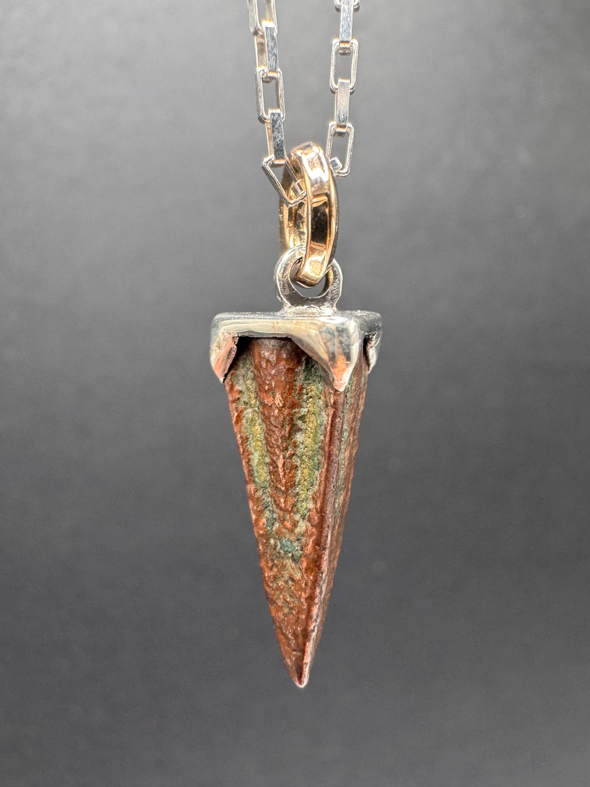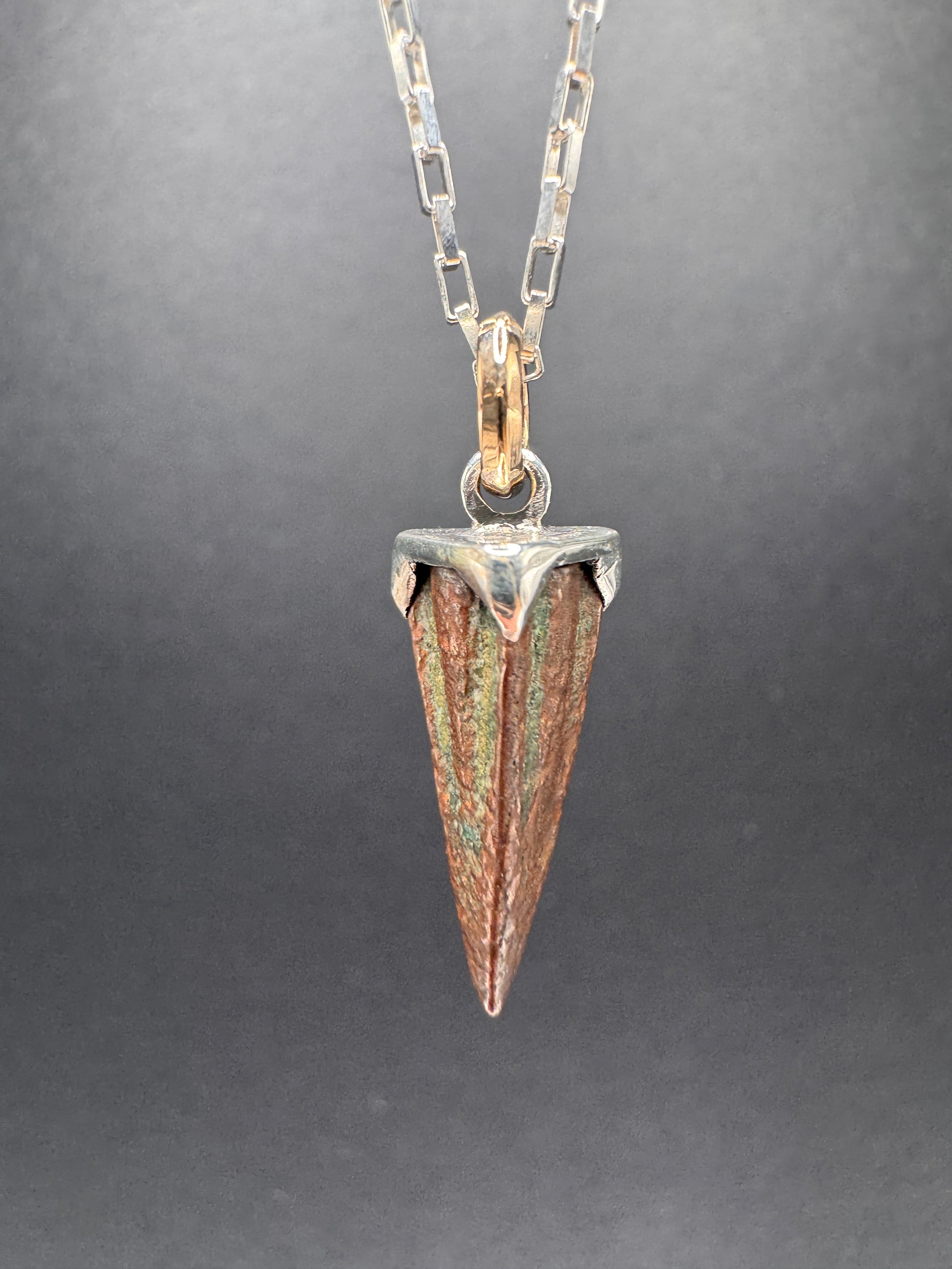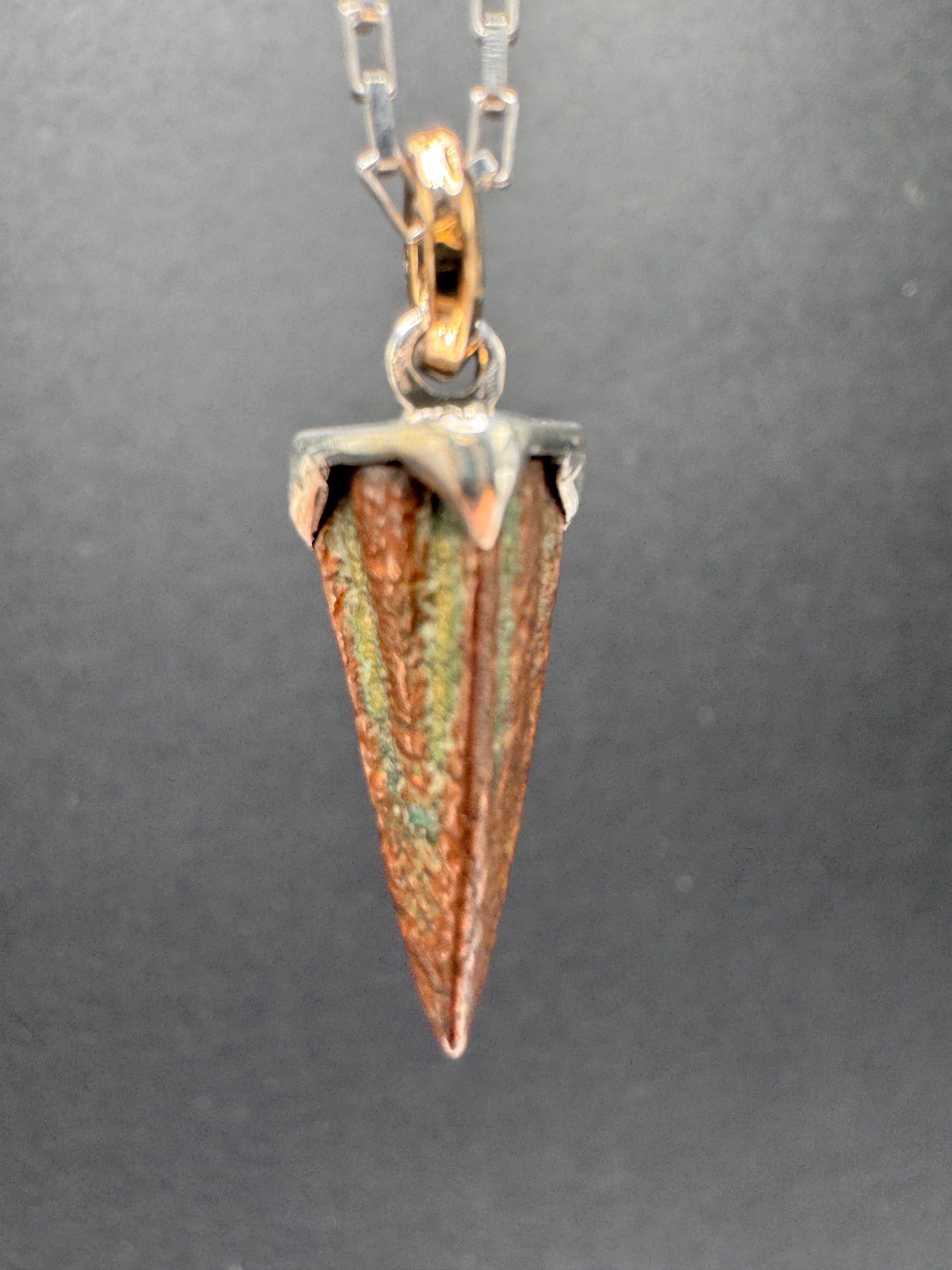 Touch a piece of history with this ancient Scythian arrowhead set in silver and gold. This bronze arrowhead dates from 6th century BC, making it 2600 years old 🤯 The Scythian’s were a nomadic tribe from the area of present day Siberia known for their skill in mounted warfare. When you hold it it’s easy to imagine the hands that made it, the lives it may have ended, and its long slumber in the earth where it became something different again. Comes on 17 inch sterling silver chain.Â