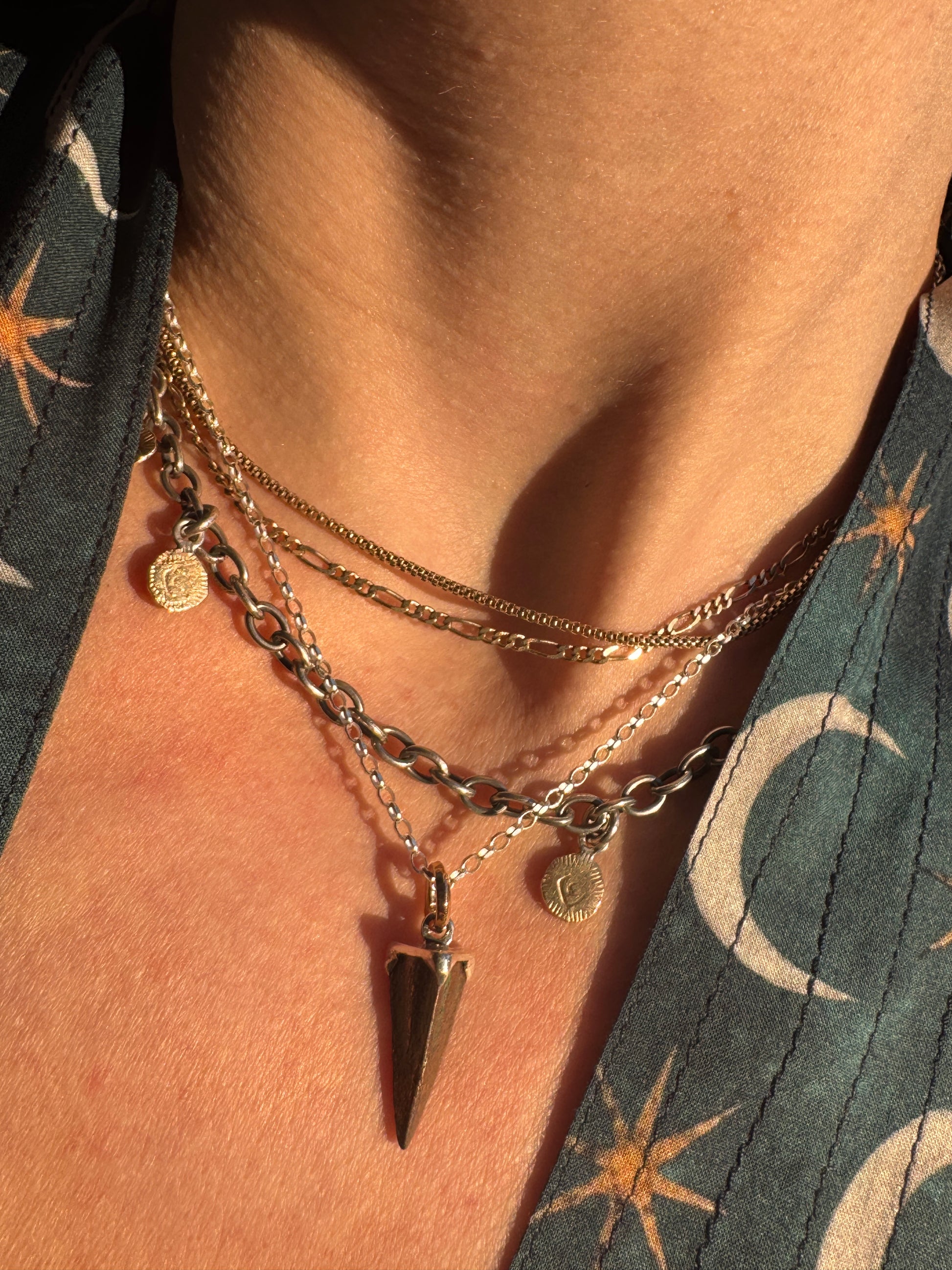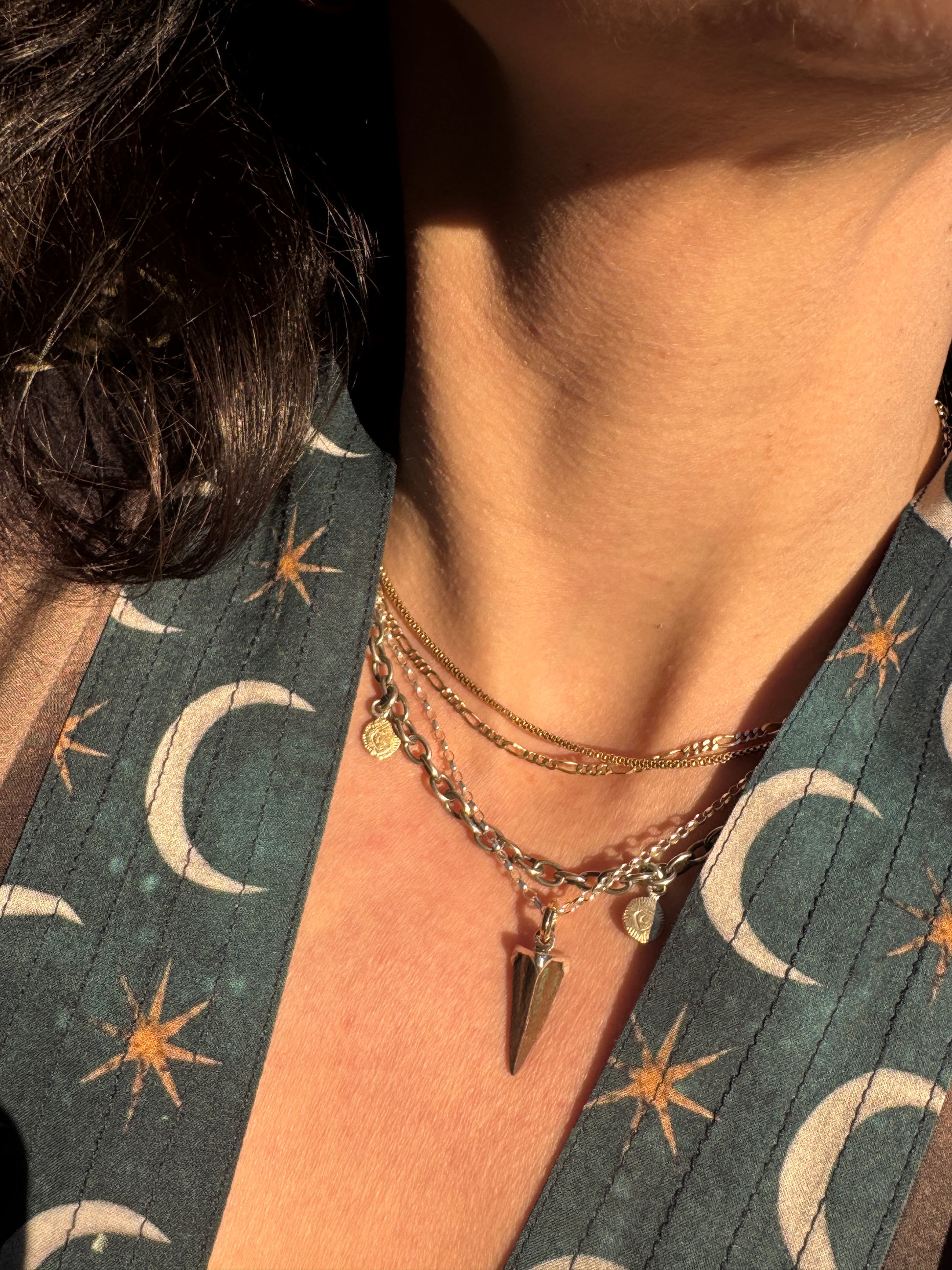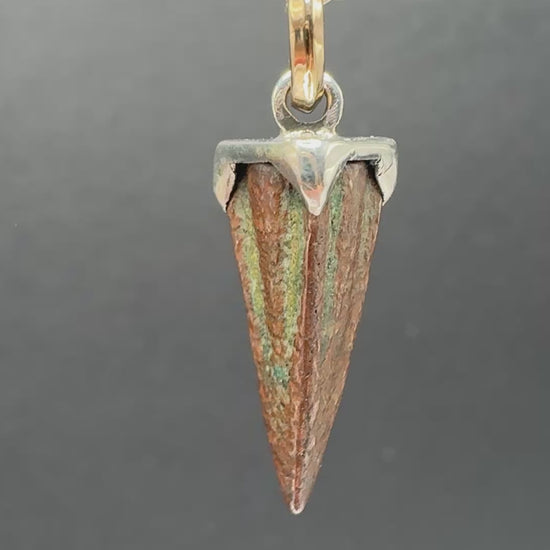 Touch a piece of history with this ancient Scythian arrowhead set in silver and gold. This bronze arrowhead dates from 6th century BC, making it 2600 years old 🤯 The Scythian’s were a nomadic tribe from the area of present day Siberia known for their skill in mounted warfare. When you hold it it’s easy to imagine the hands that made it, the lives it may have ended, and its long slumber in the earth where it became something different again. Comes on 17 inch sterling silver chain.Â
