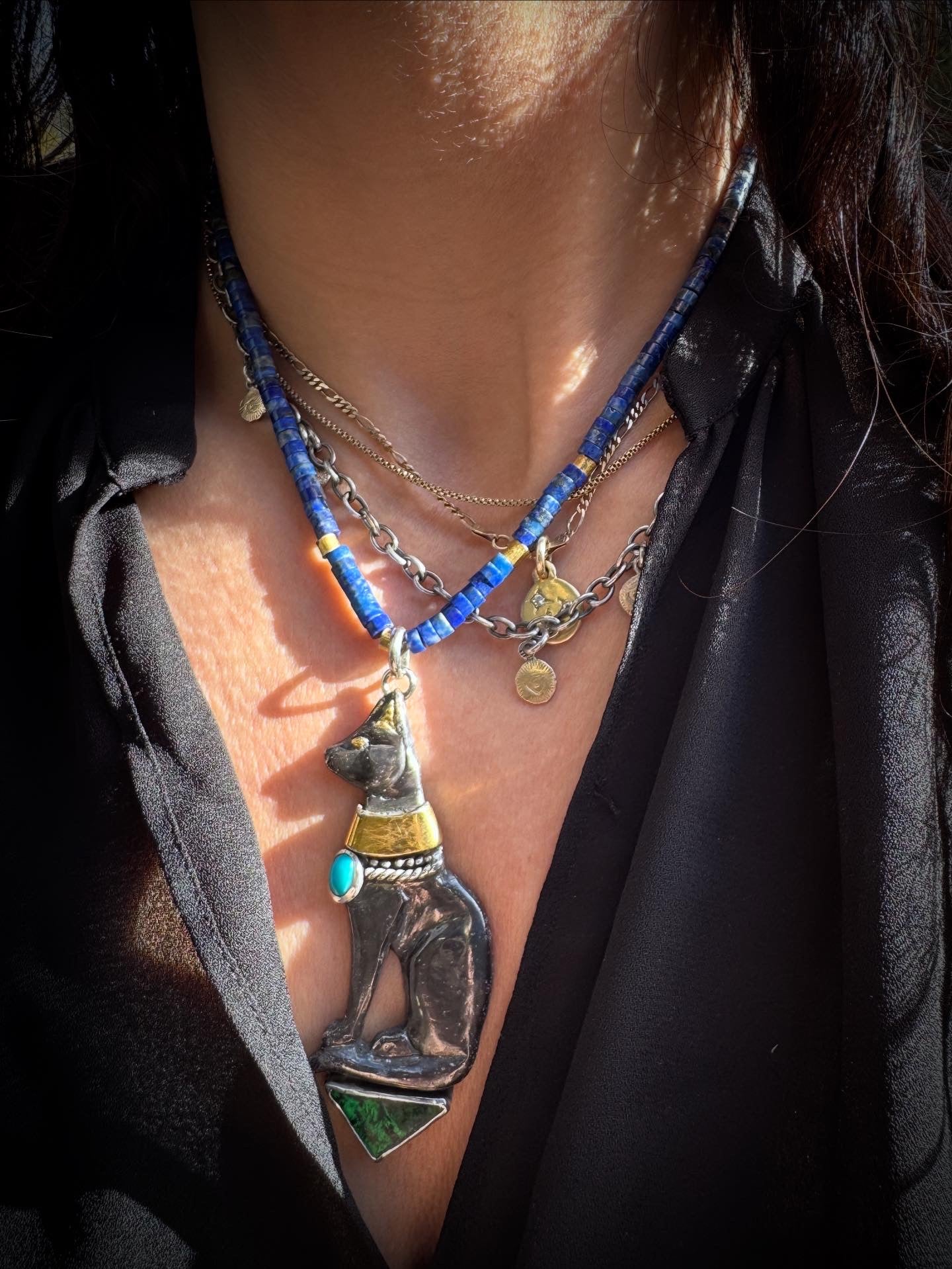 Silver, fused 24k gold, sleeping beauty turquoise and Maw sit sit jade from @coloradogemworks . Comes on 18 inch strand of lapis from @sunstonesbeads with silver and 24k gold accent beads made by myself. Bead strand length can be adjusted at buyers request and be worn separately from the pendant.