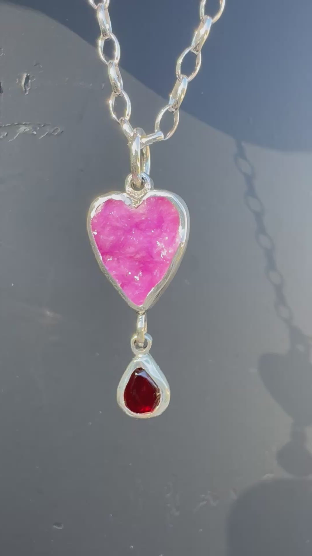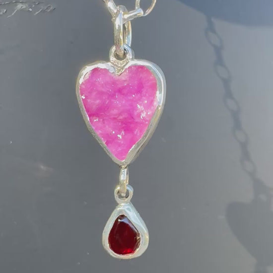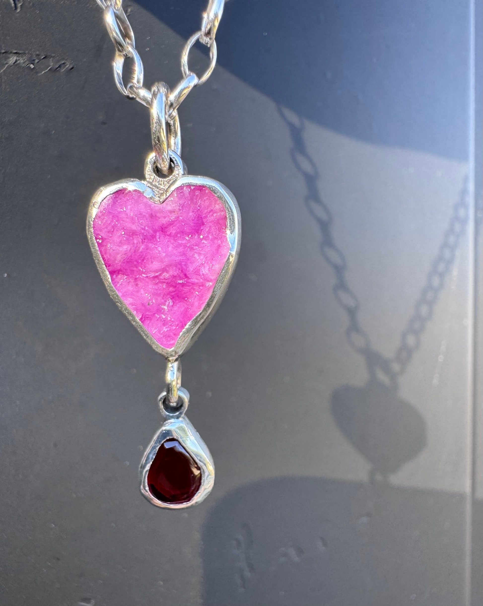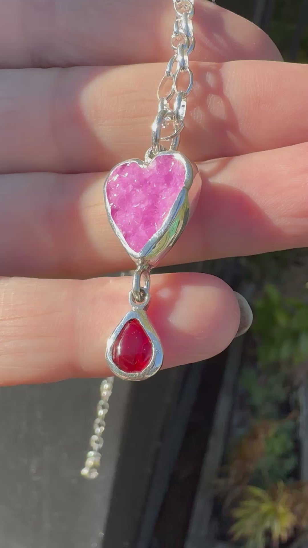 Natural pink cobalto calcite druzy heart carved by myself with red garnet blood drop. Comes on 18 inch adjustable sterling silver chain.