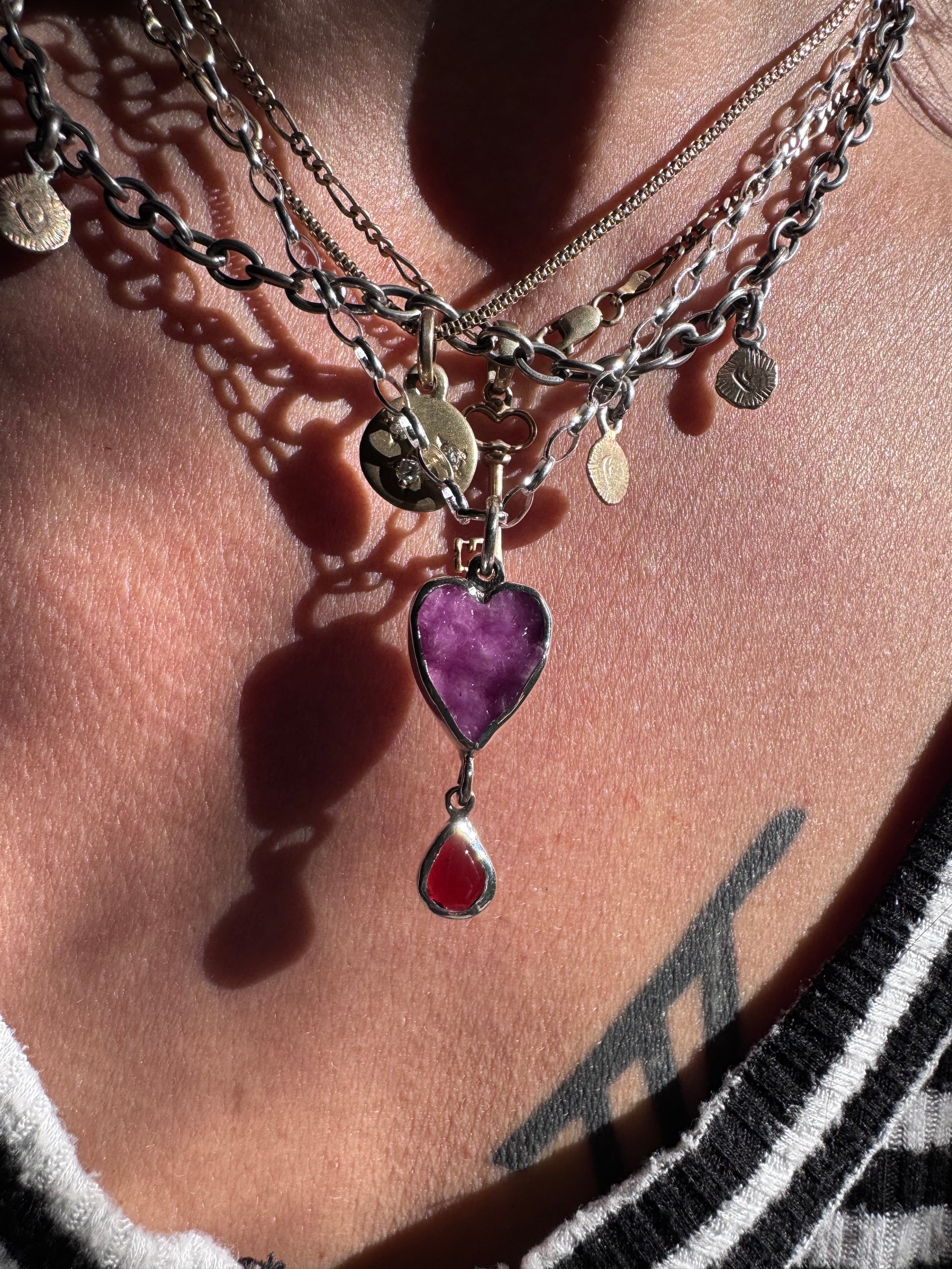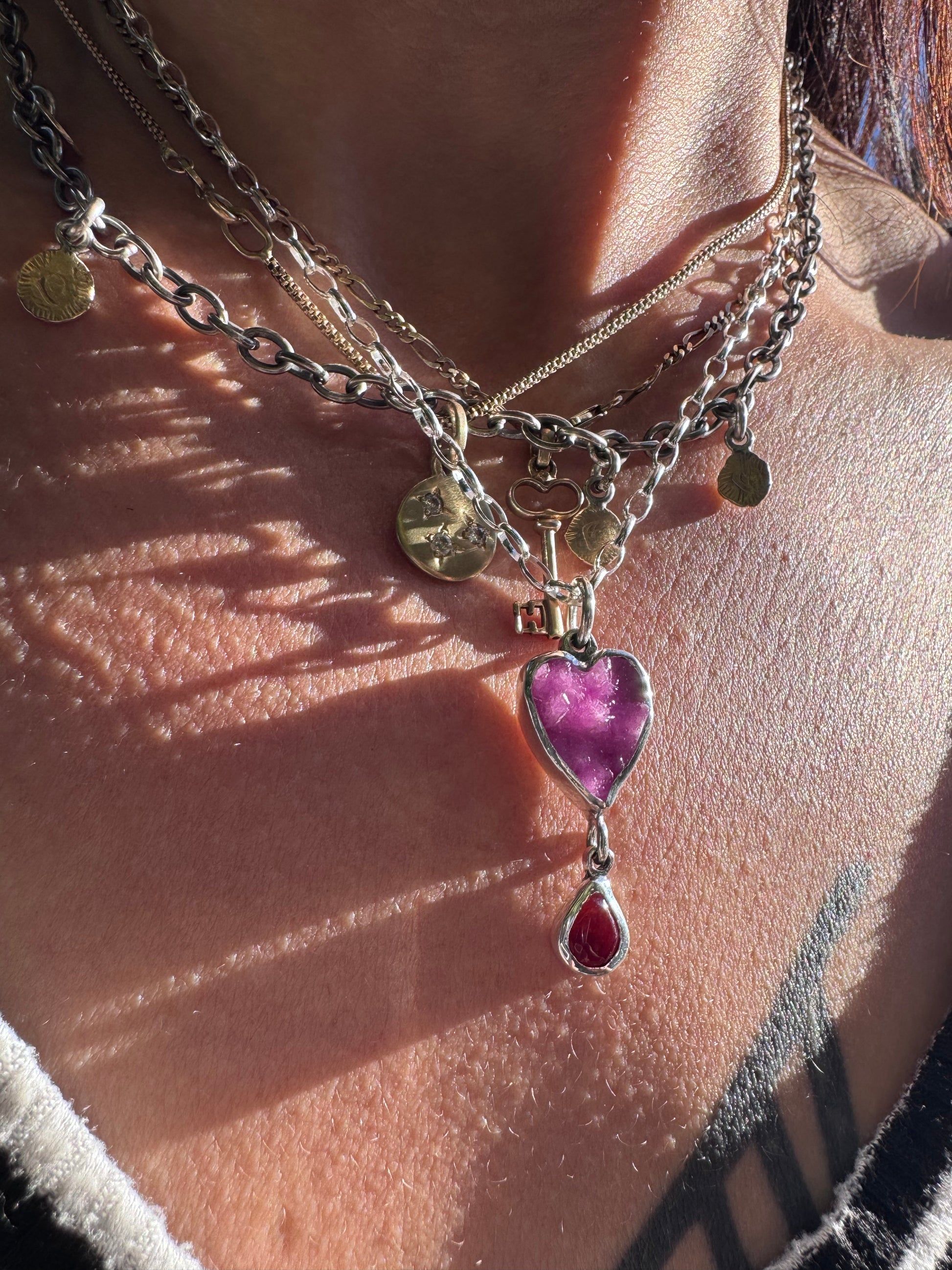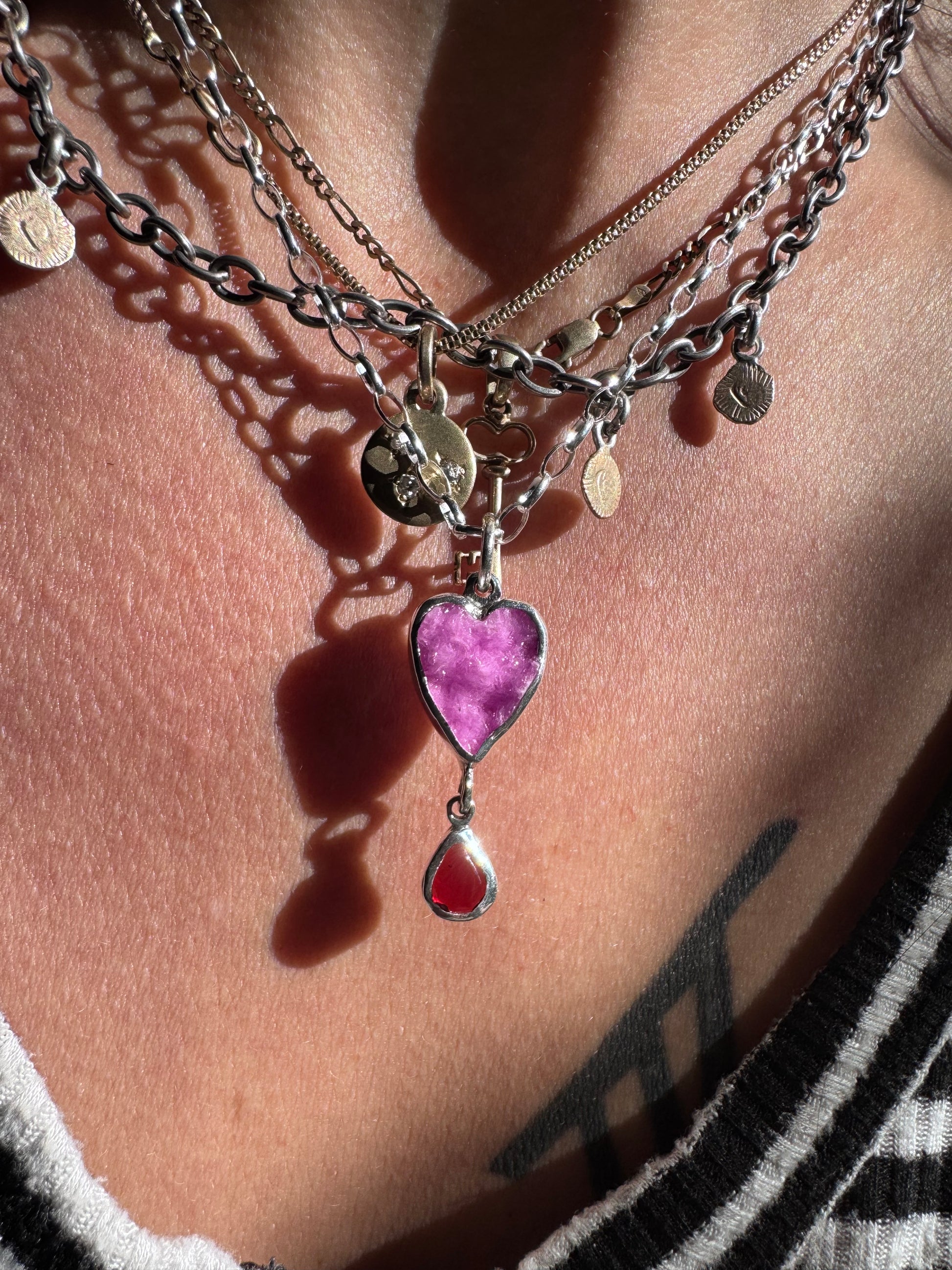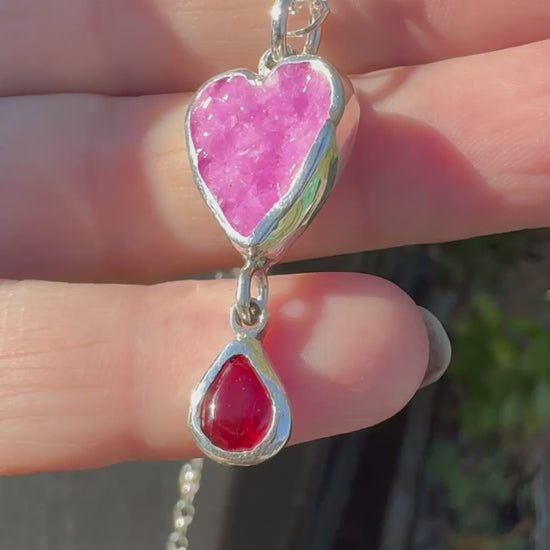 Natural pink cobalto calcite druzy heart carved by myself with red garnet blood drop. Comes on 18 inch adjustable sterling silver chain.