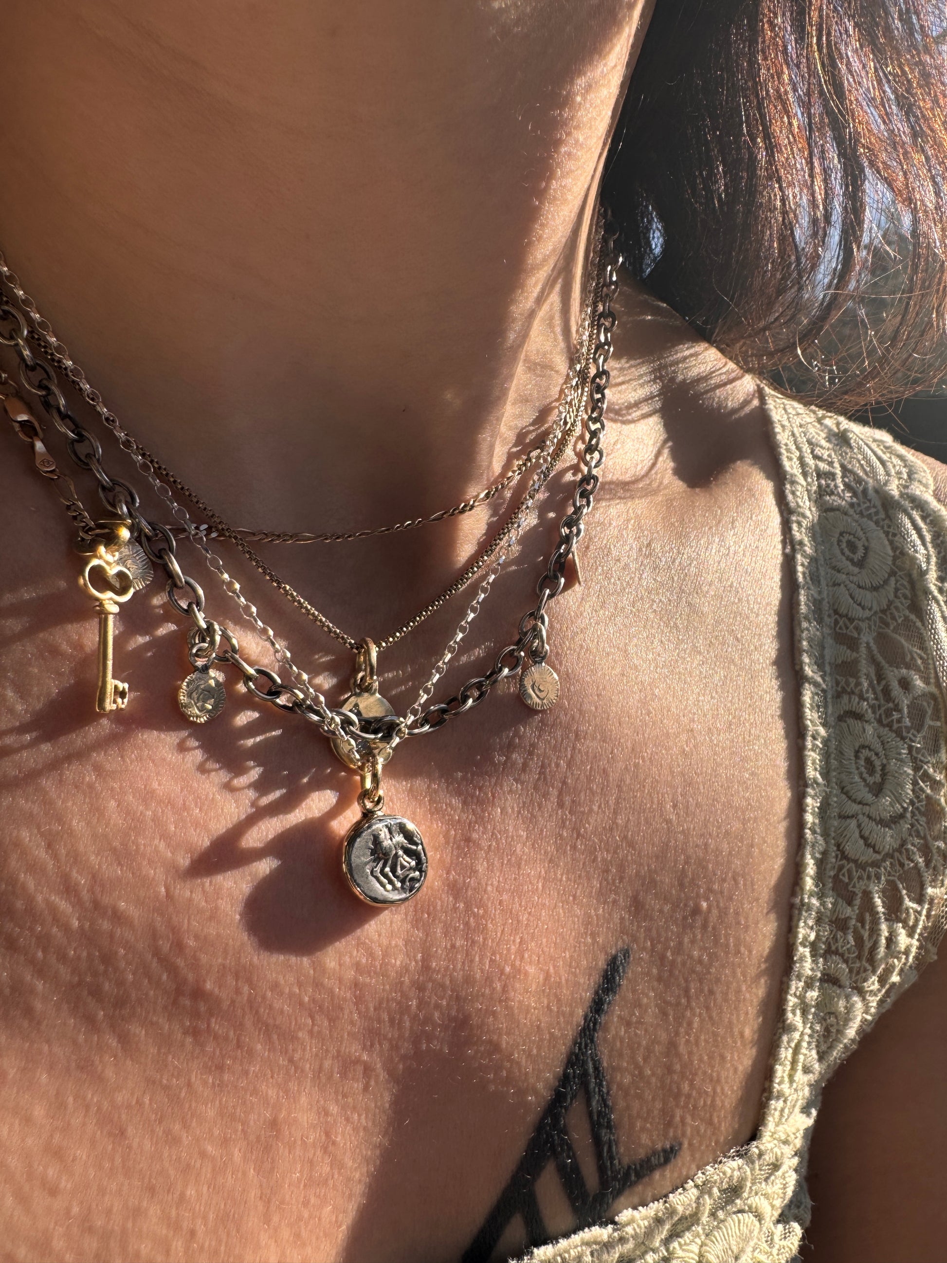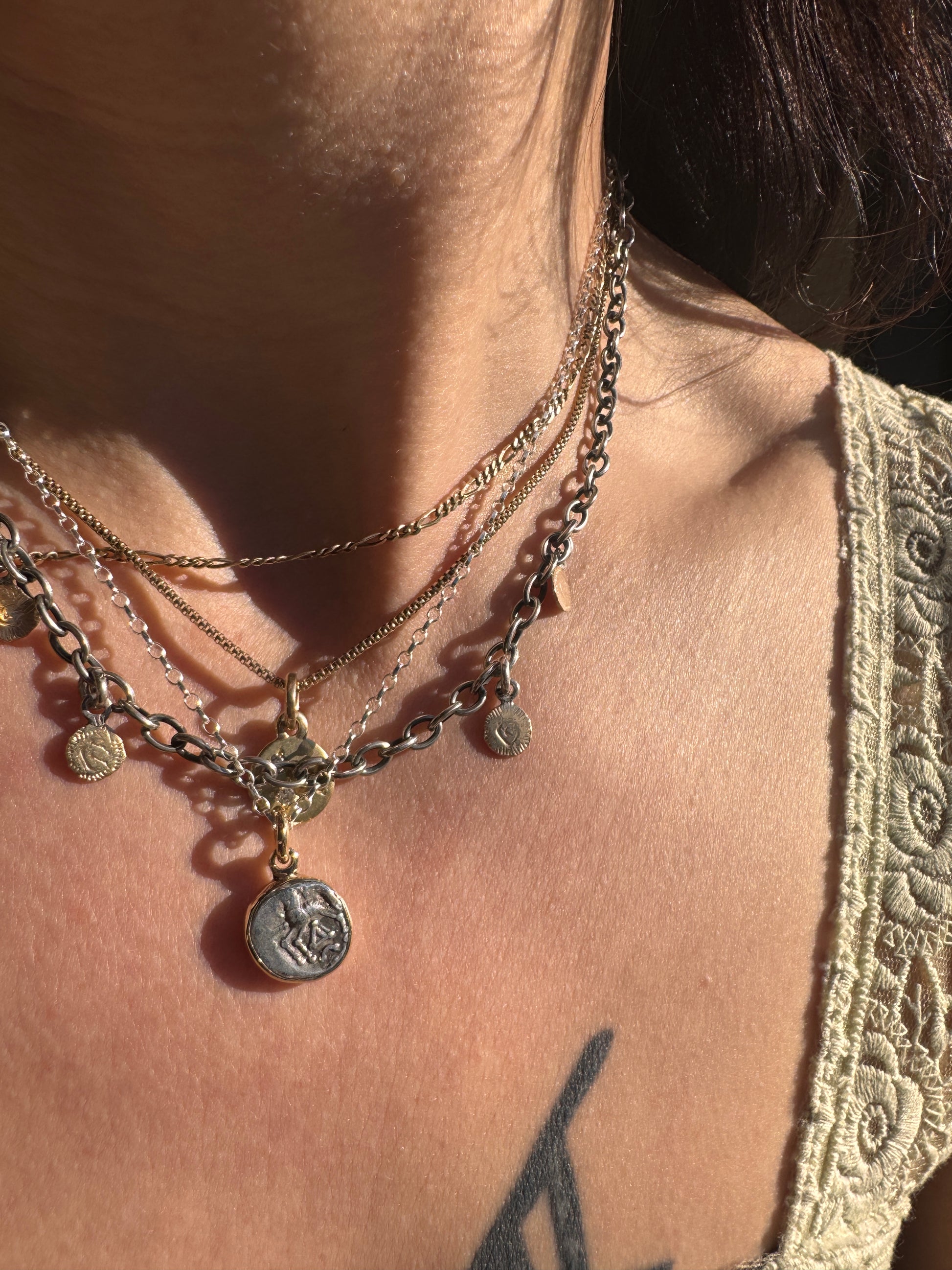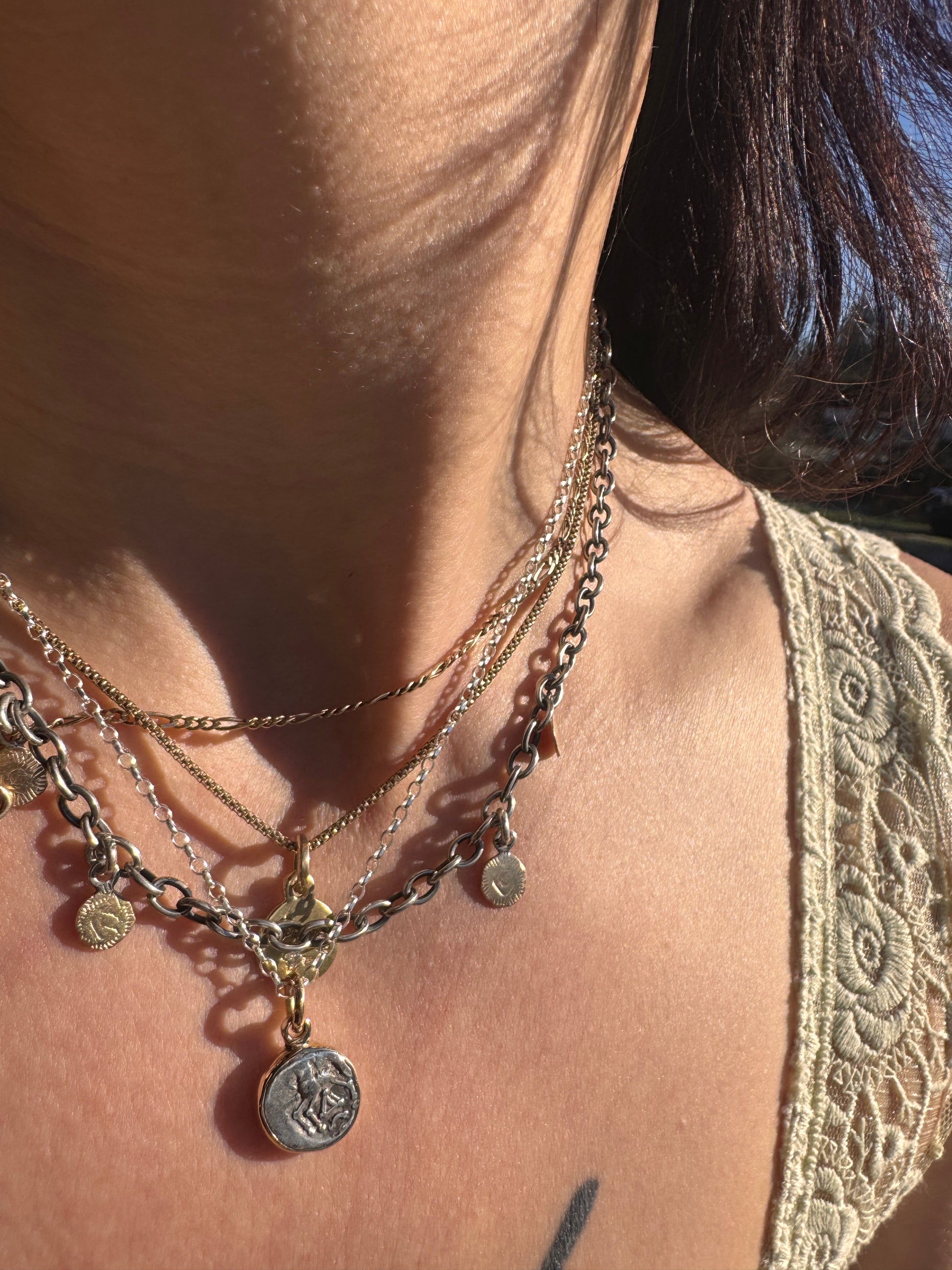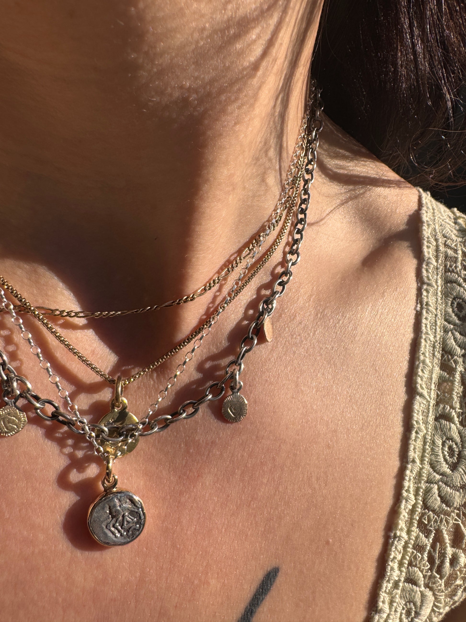 Set in 22k gold and silver. Comes on 17 inch long sterling silver chain.