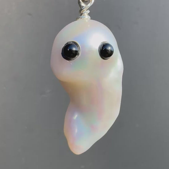 Hand carved baroque freshwater flame pearl with inlaid black onyx eyes. Comes on 18 inch sterling silver chain.