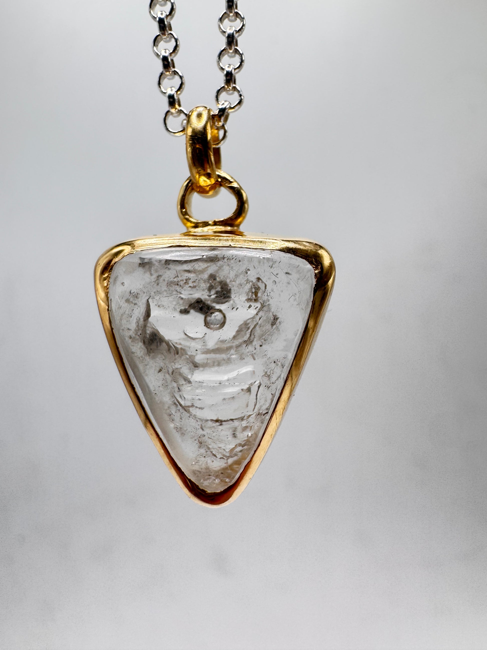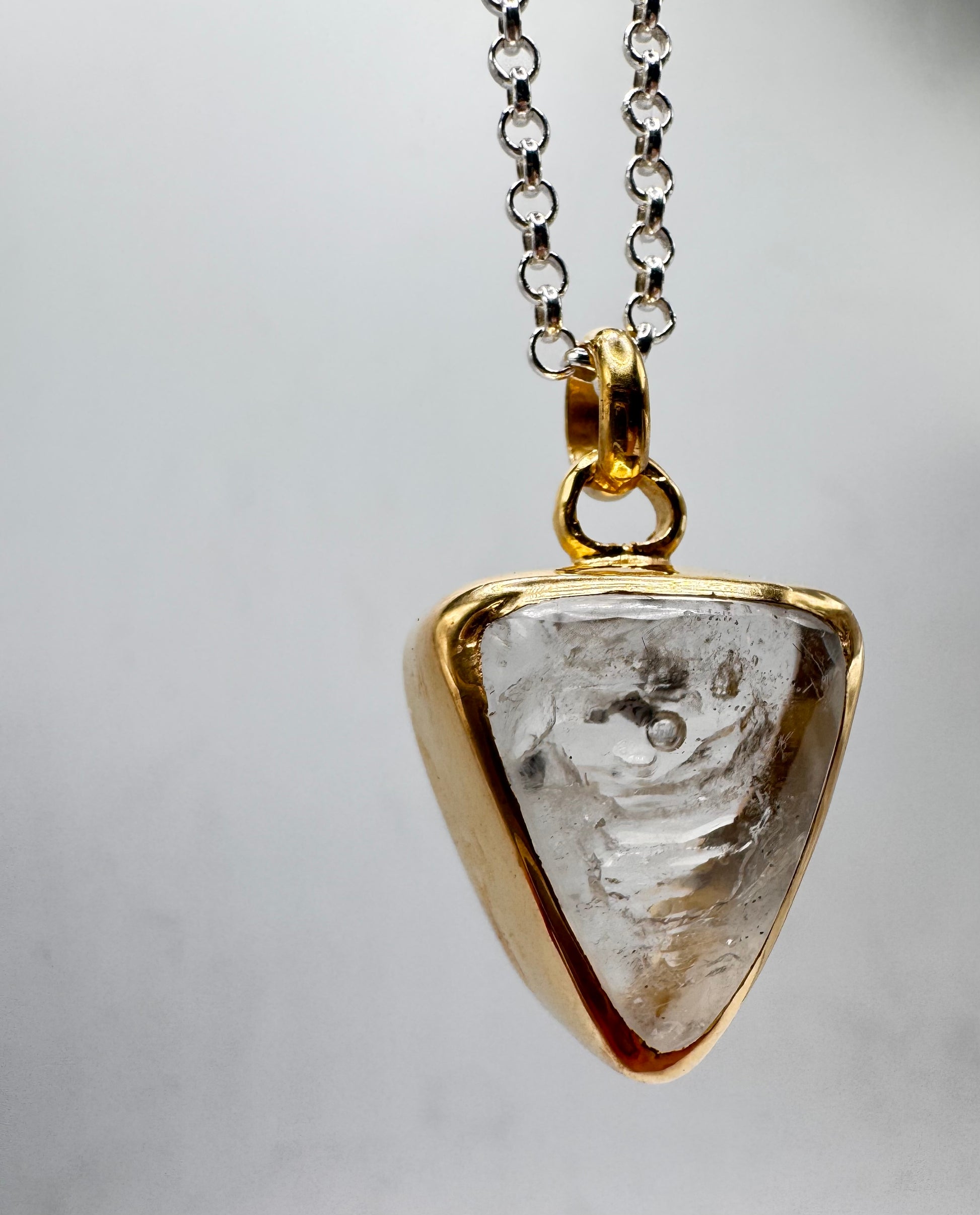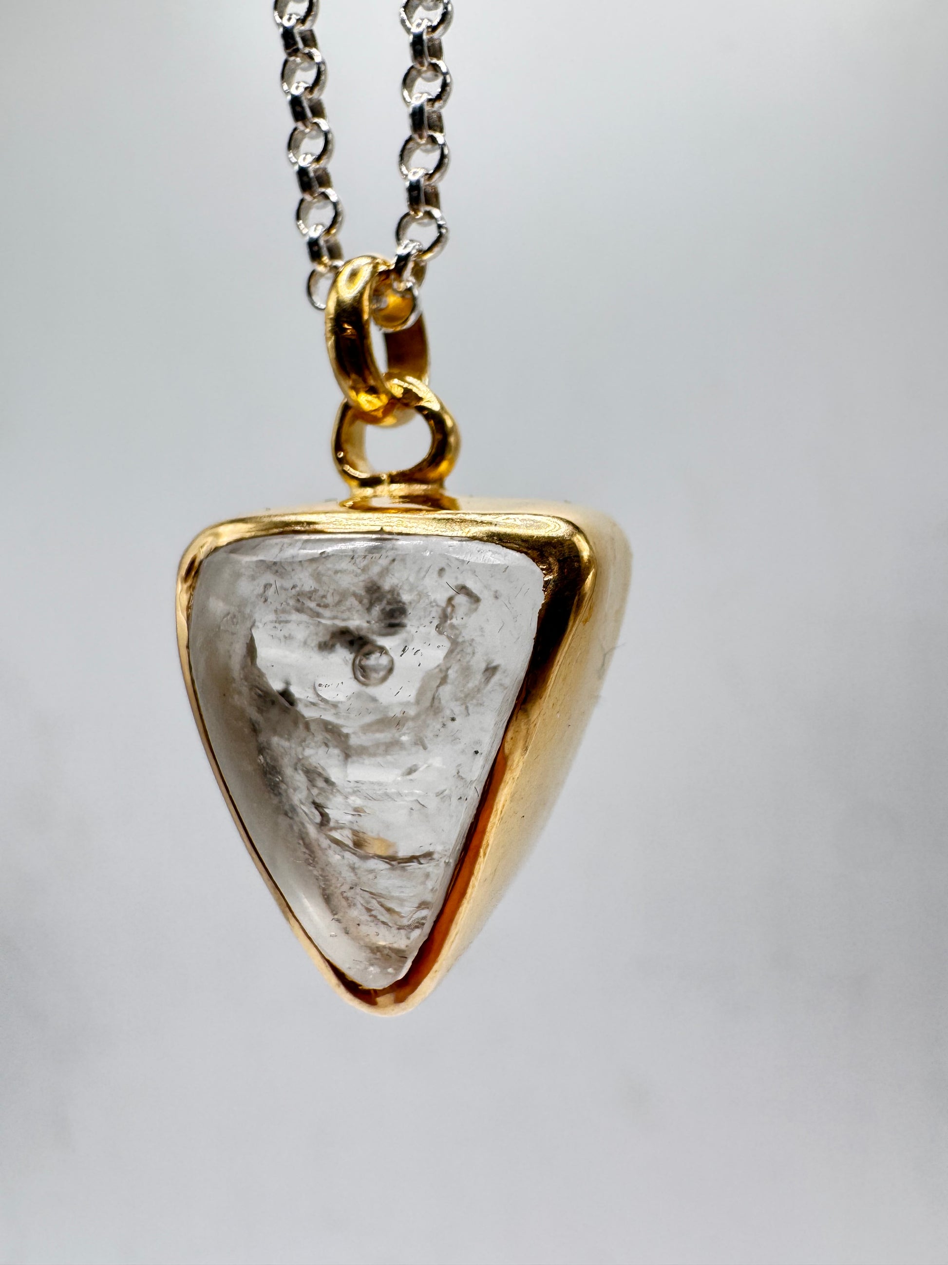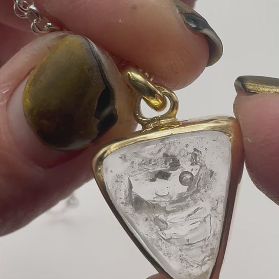 Gold plated silver with fluid inclusion quartz and moving bubble. Comes on 18 inch sterling silver.