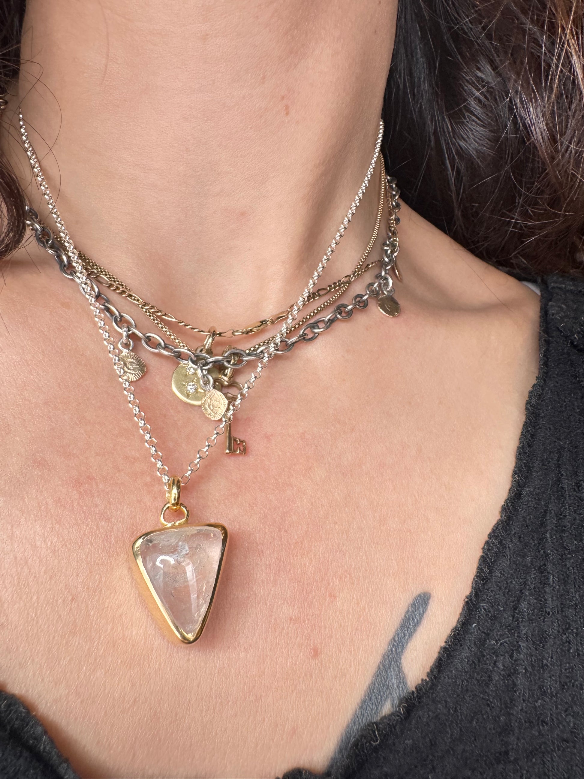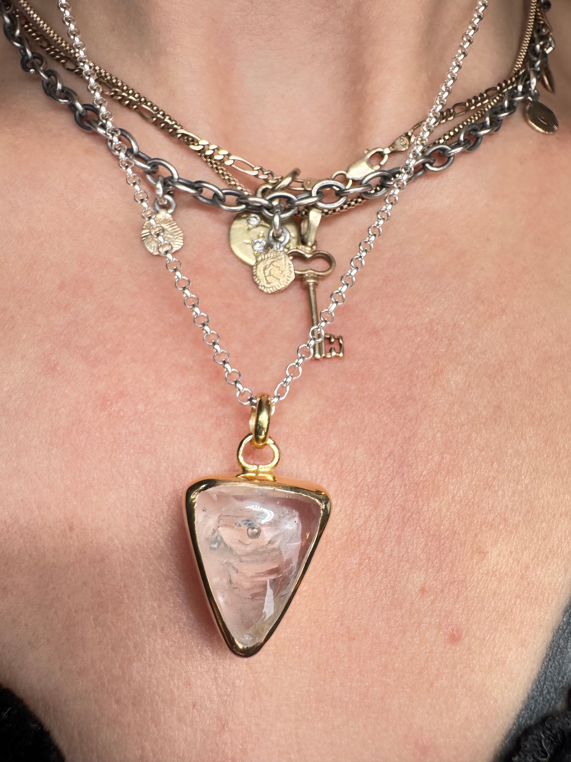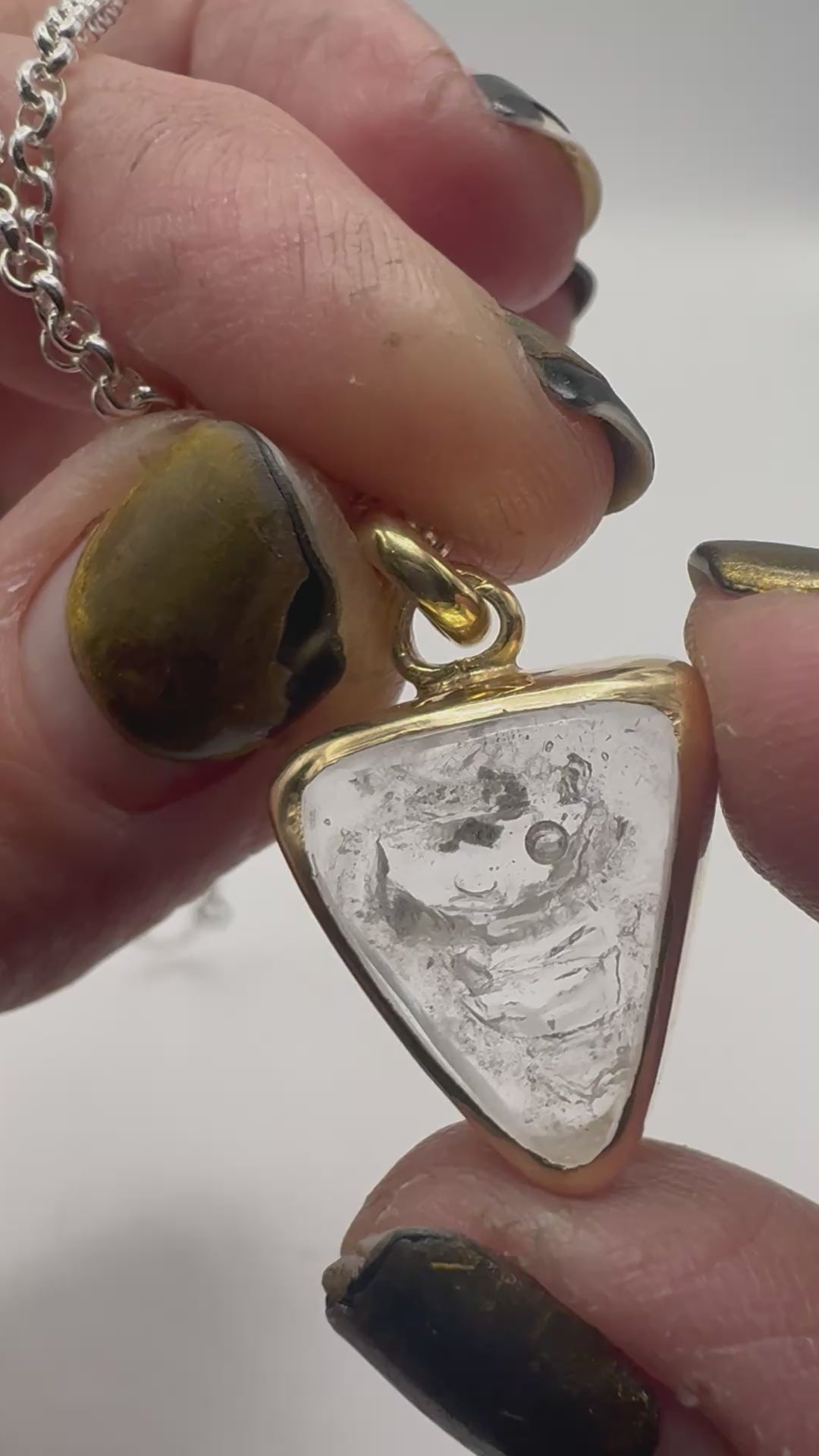 Gold plated silver with fluid inclusion quartz and moving bubble. Comes on 18 inch sterling silver.