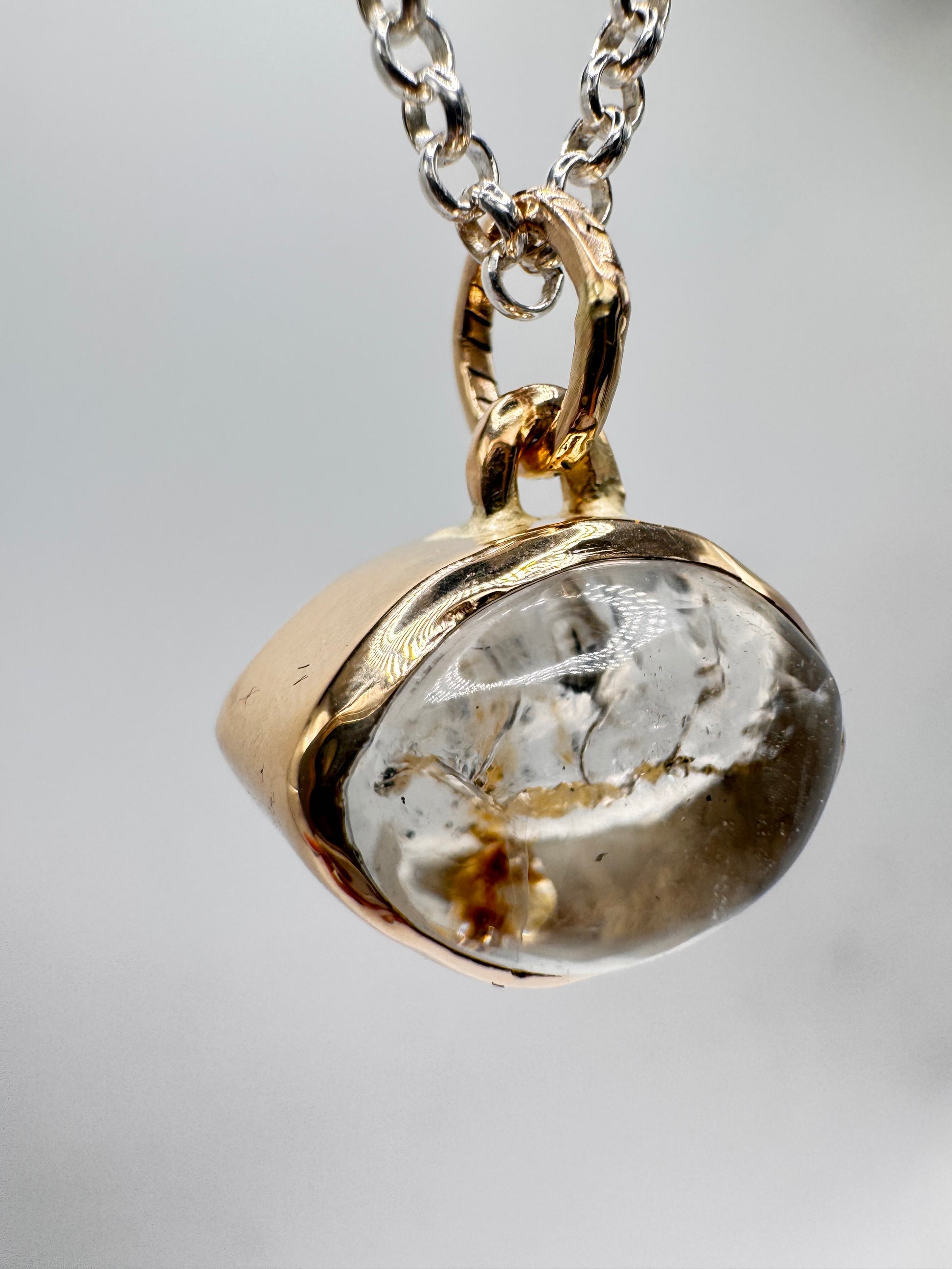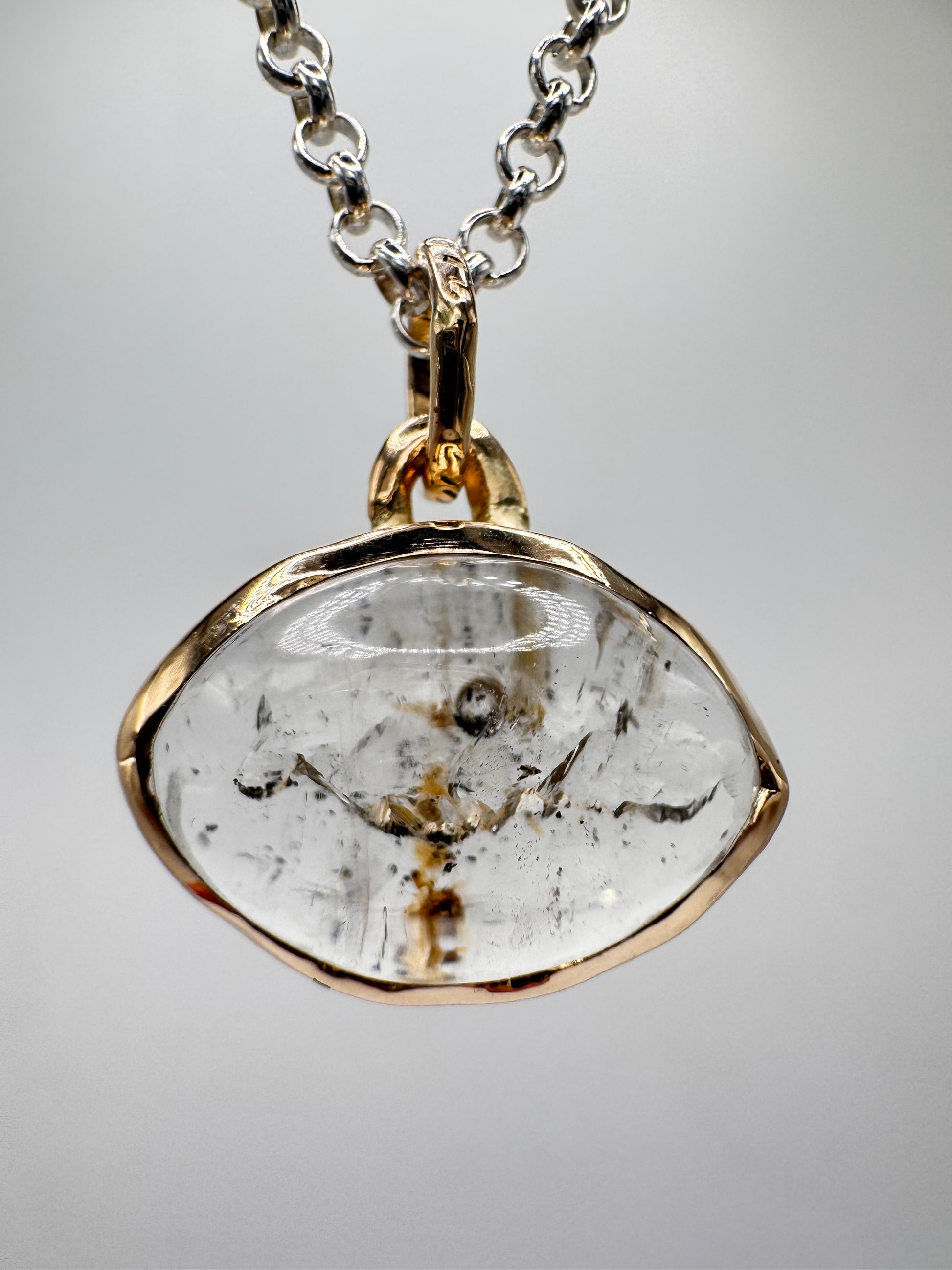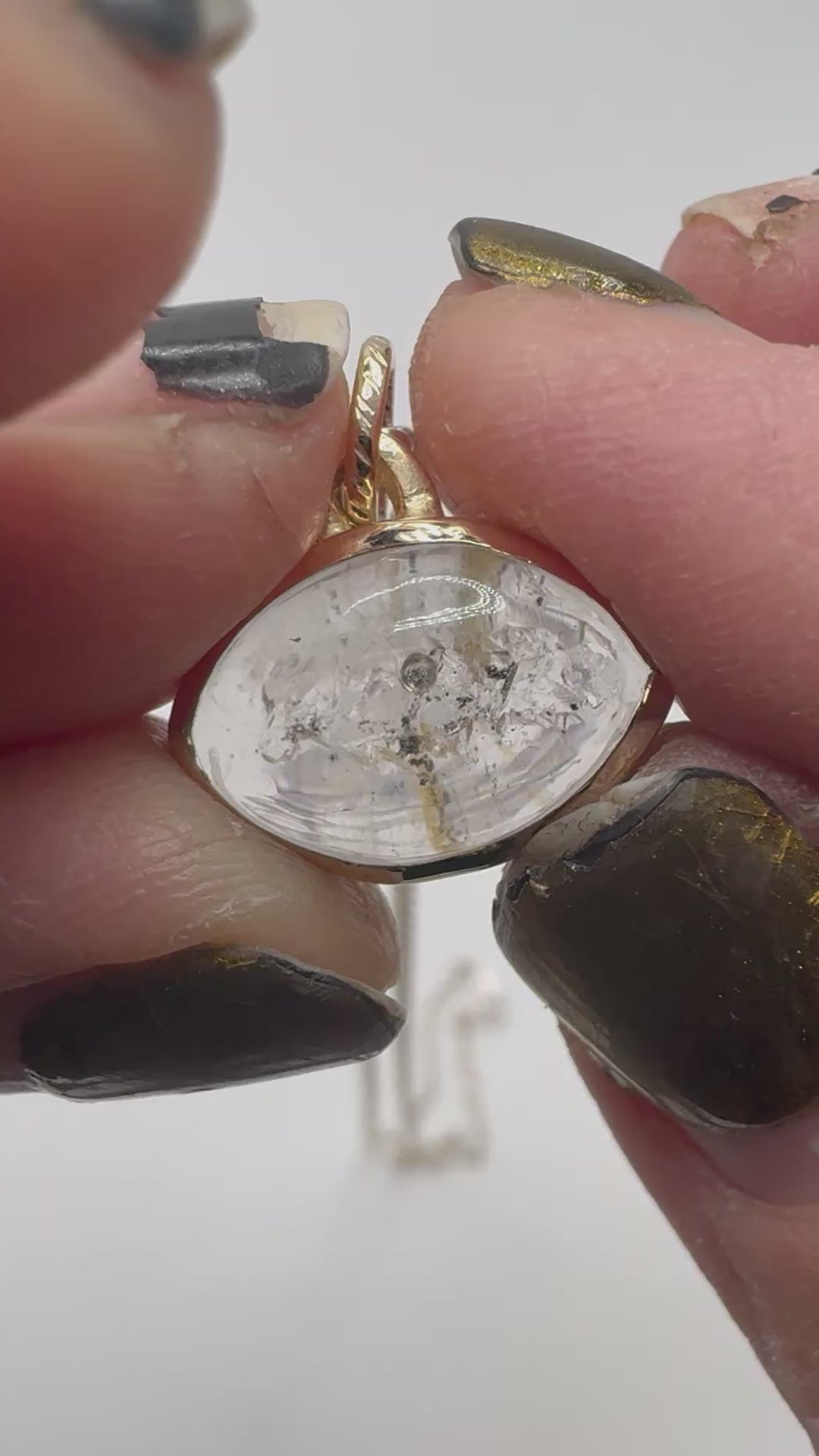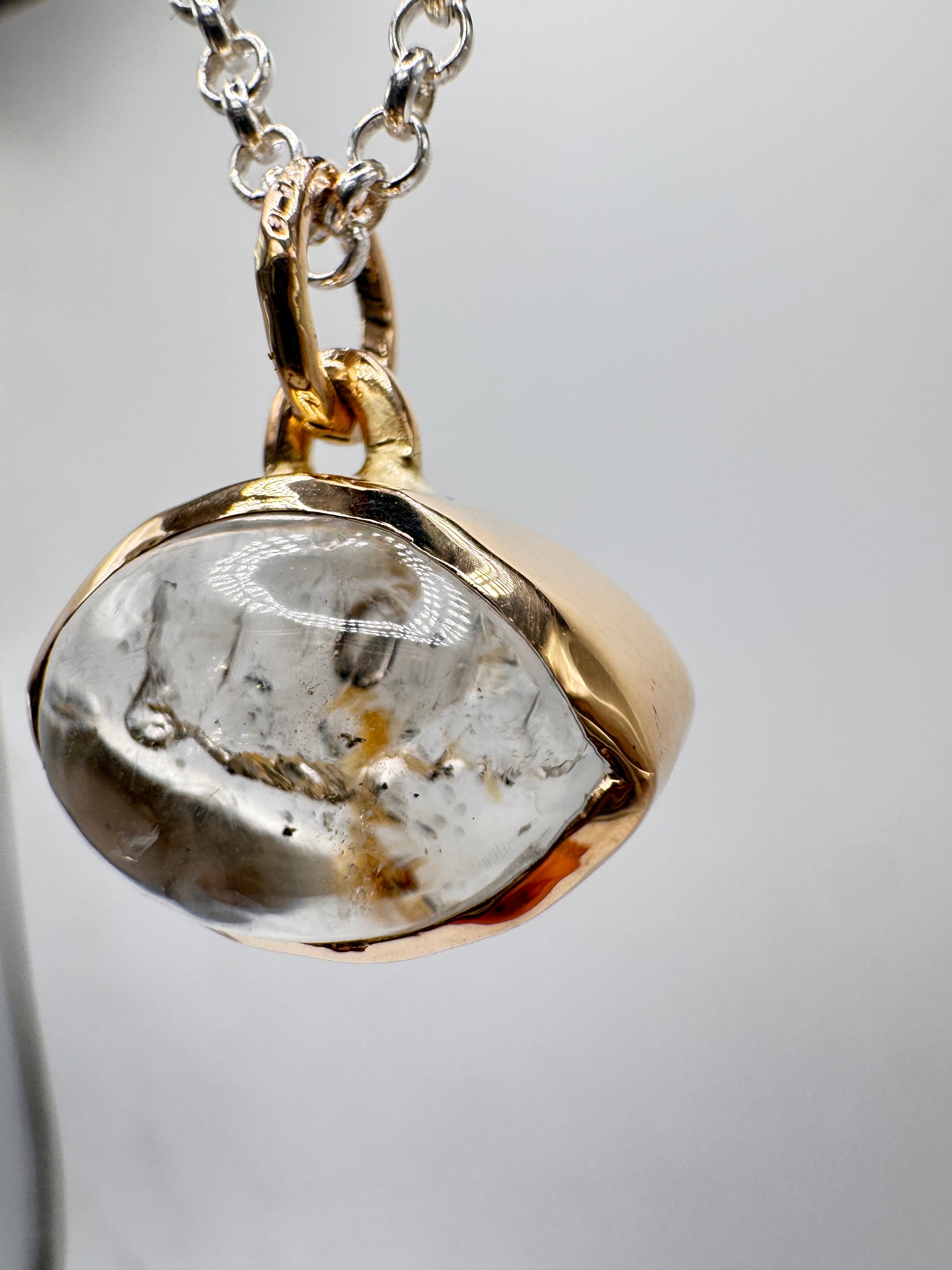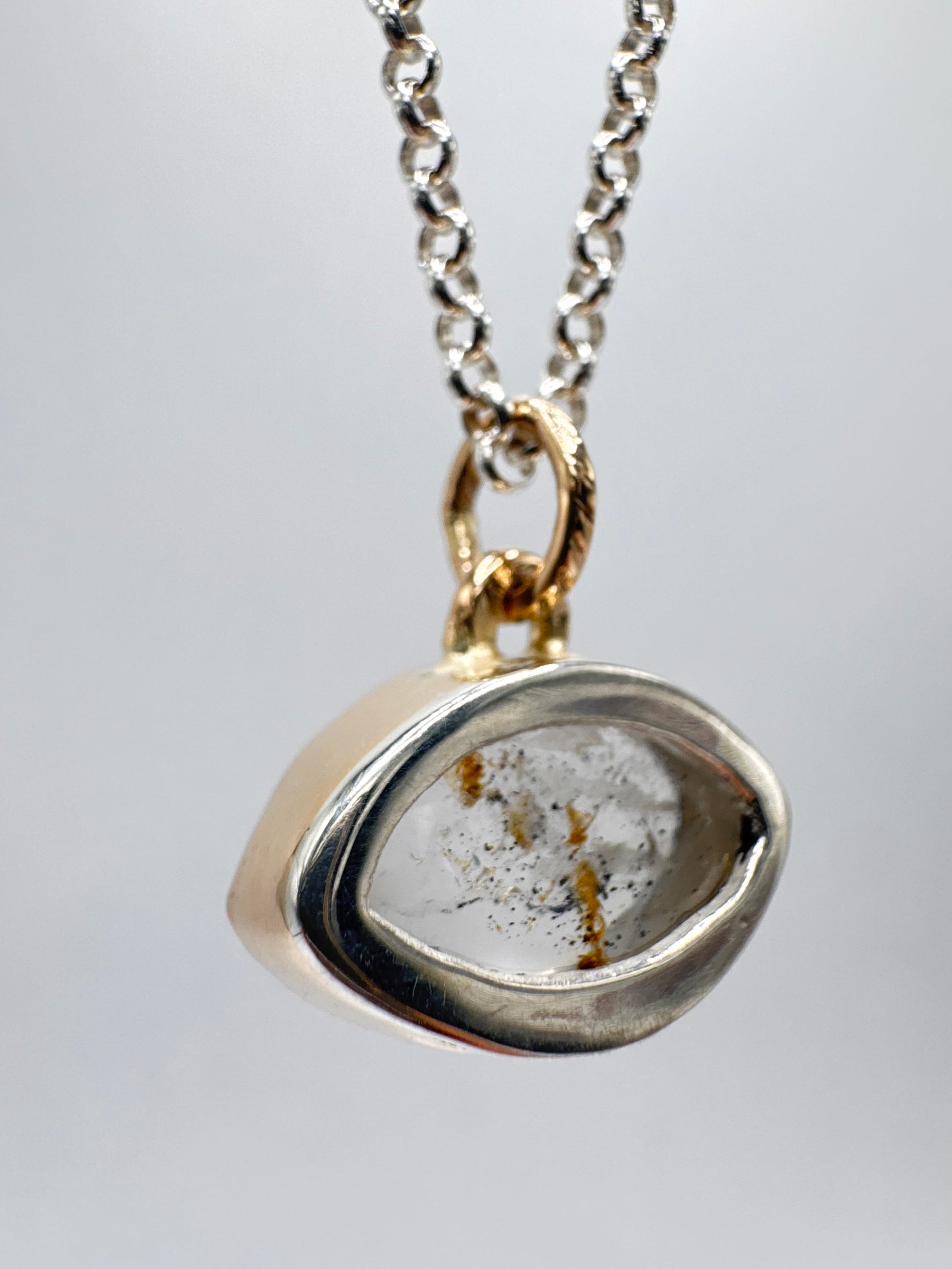 Fluid inclusion quartz crystal with moving bubble set in 14k gold with sterling silver backing. Comes on 18 inch sterling silver chain.