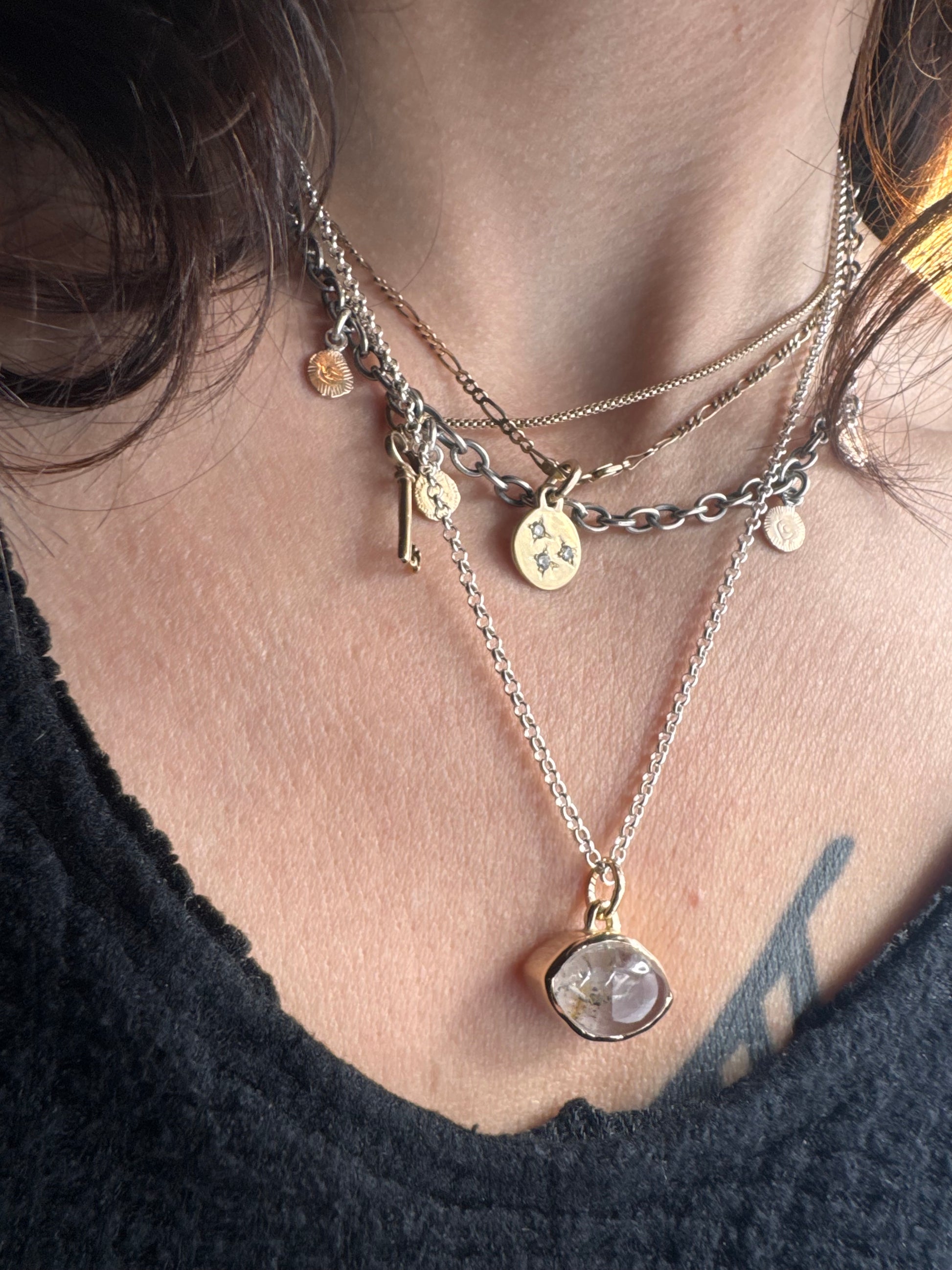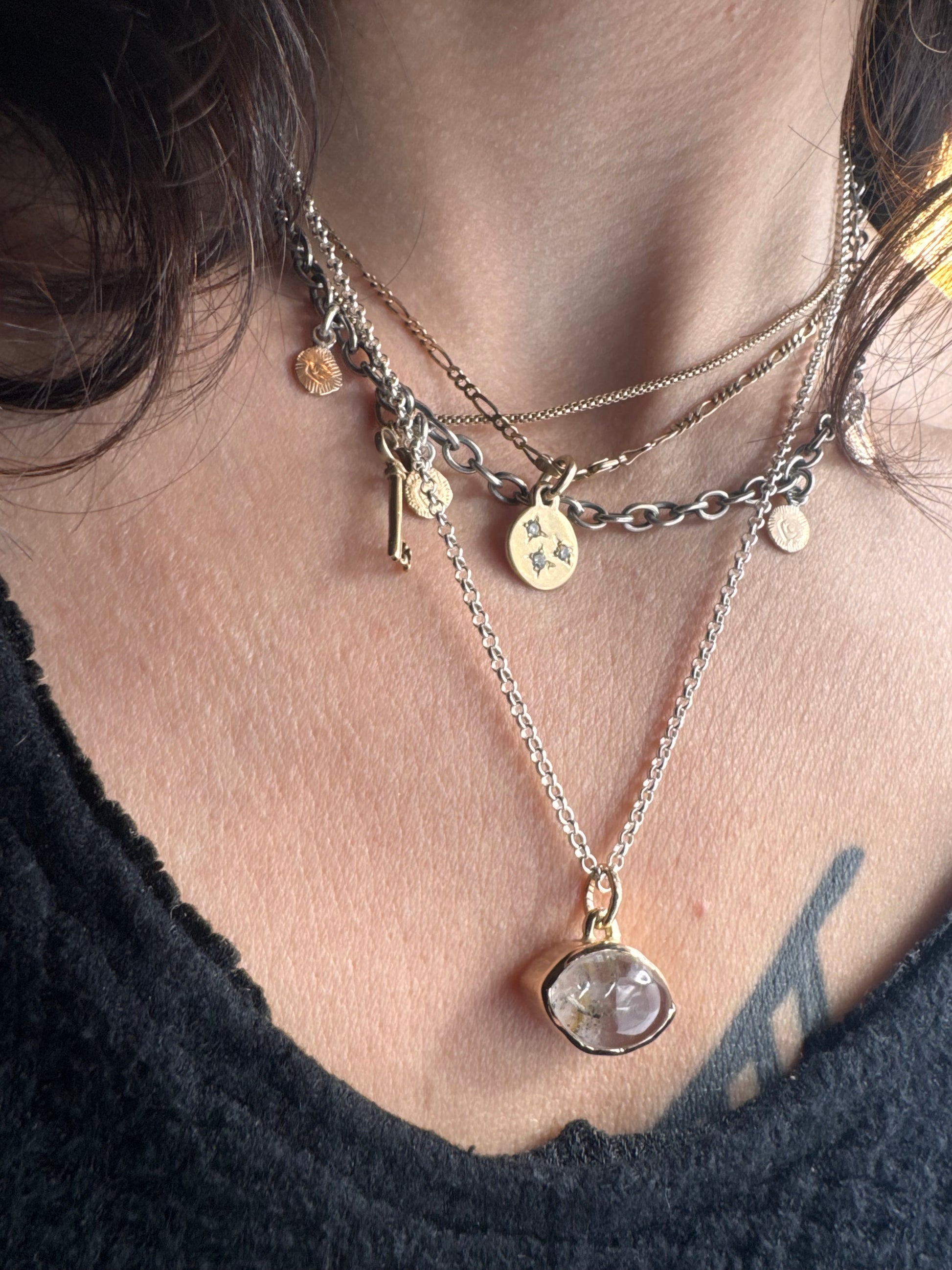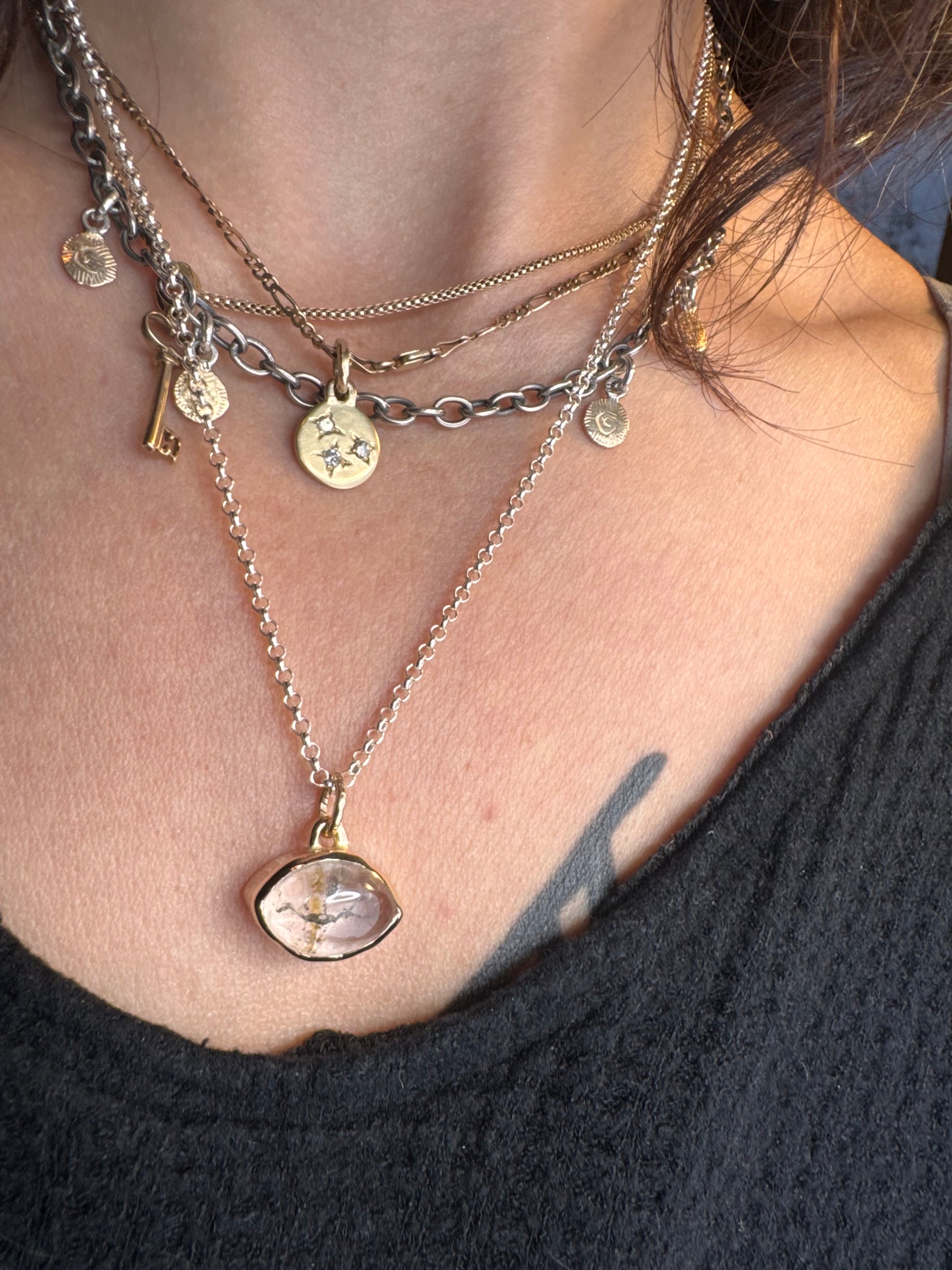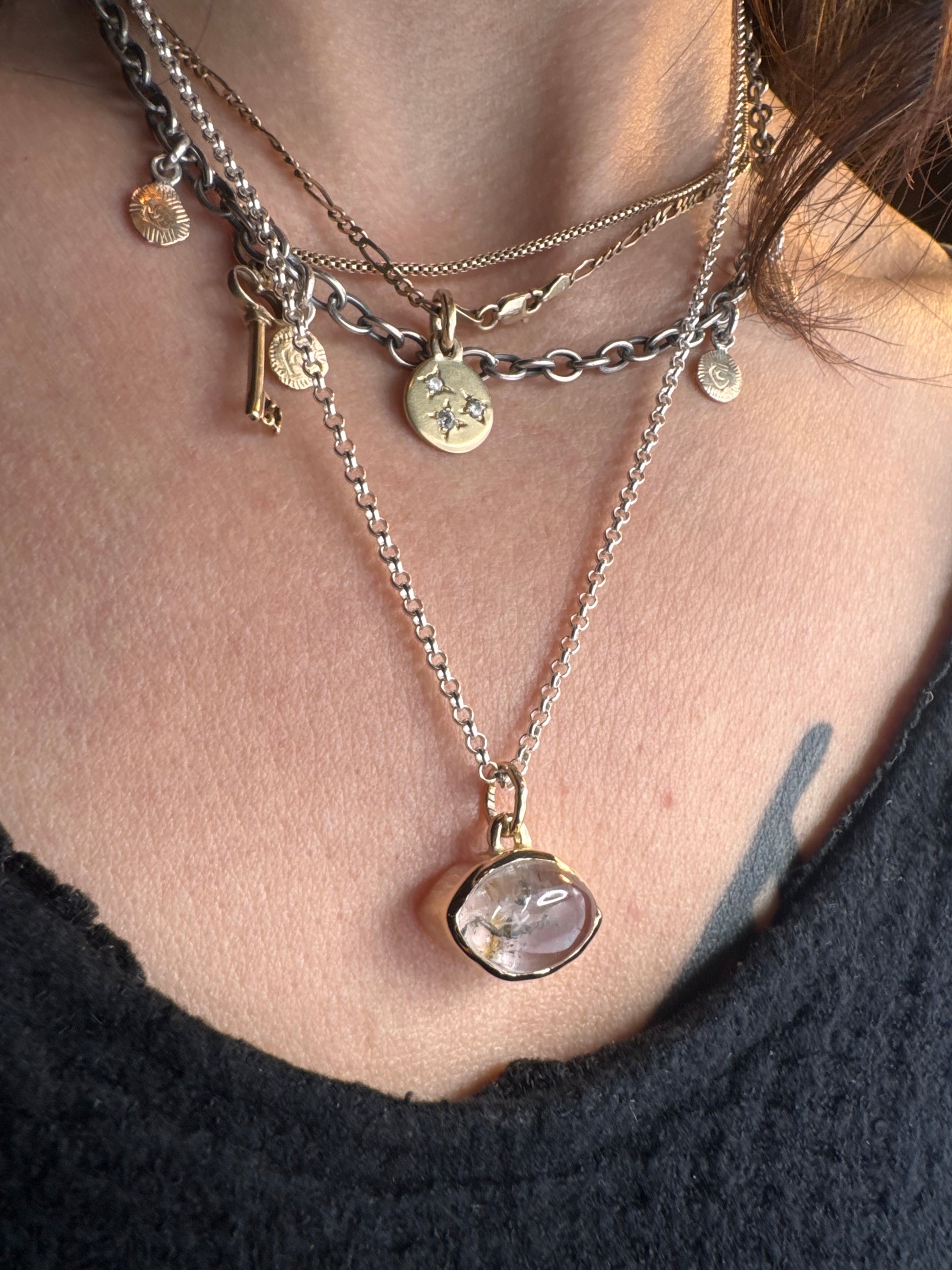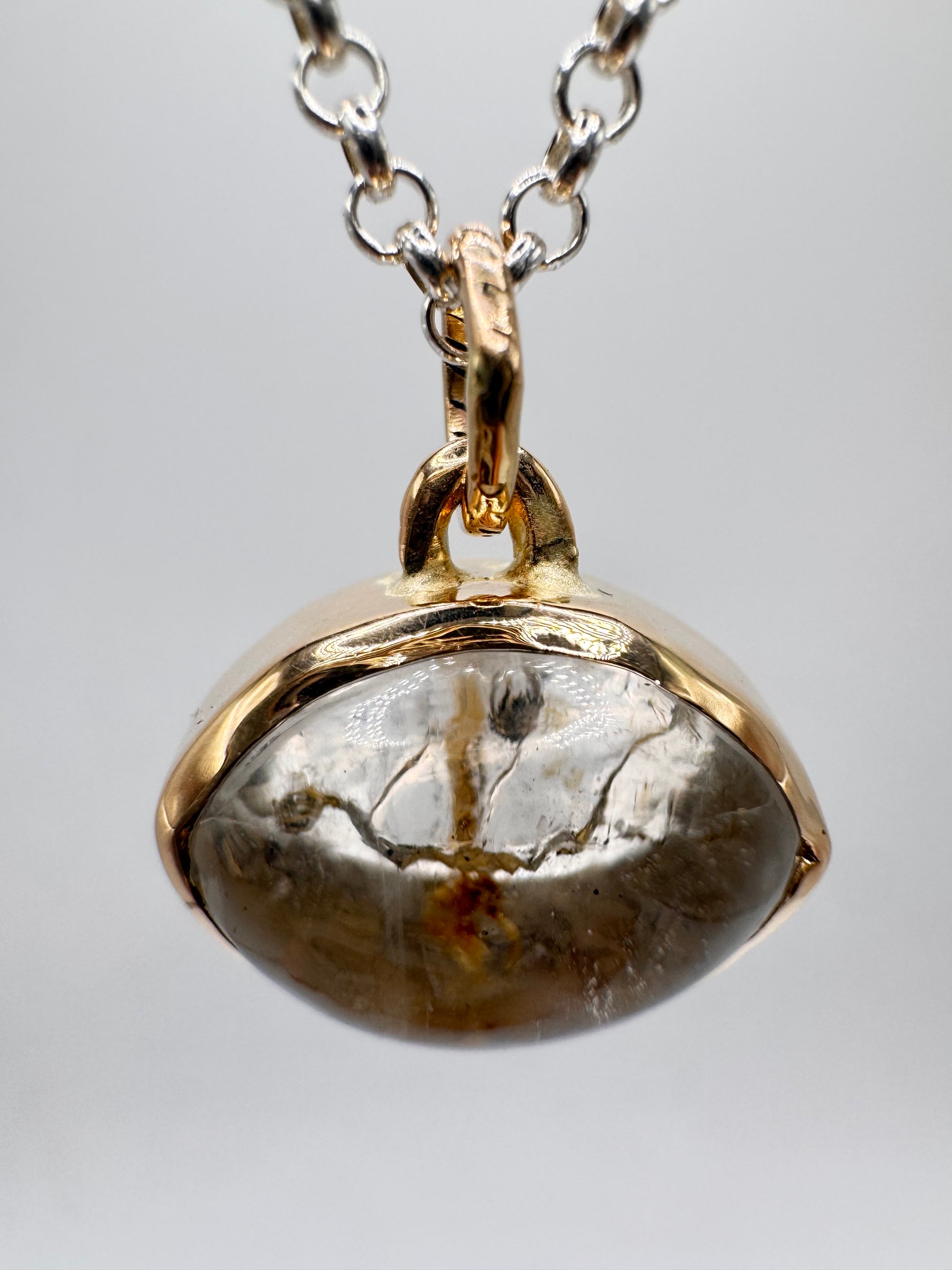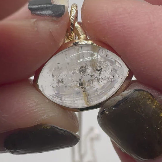 Fluid inclusion quartz crystal with moving bubble set in 14k gold with sterling silver backing. Comes on 18 inch sterling silver chain.
