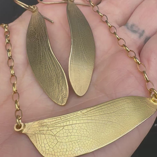 24k gold plated sterling silver dragonfly wing set, includes necklace and earrings. Chain length is approx 18 inches.
