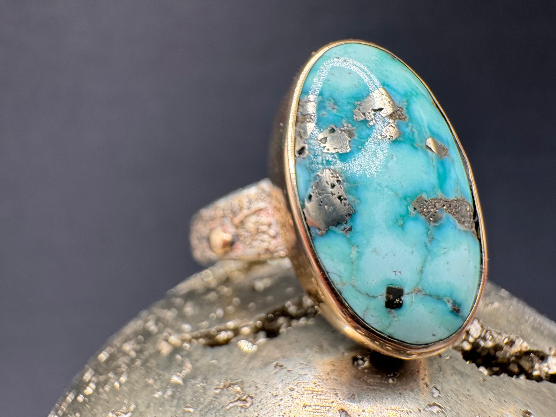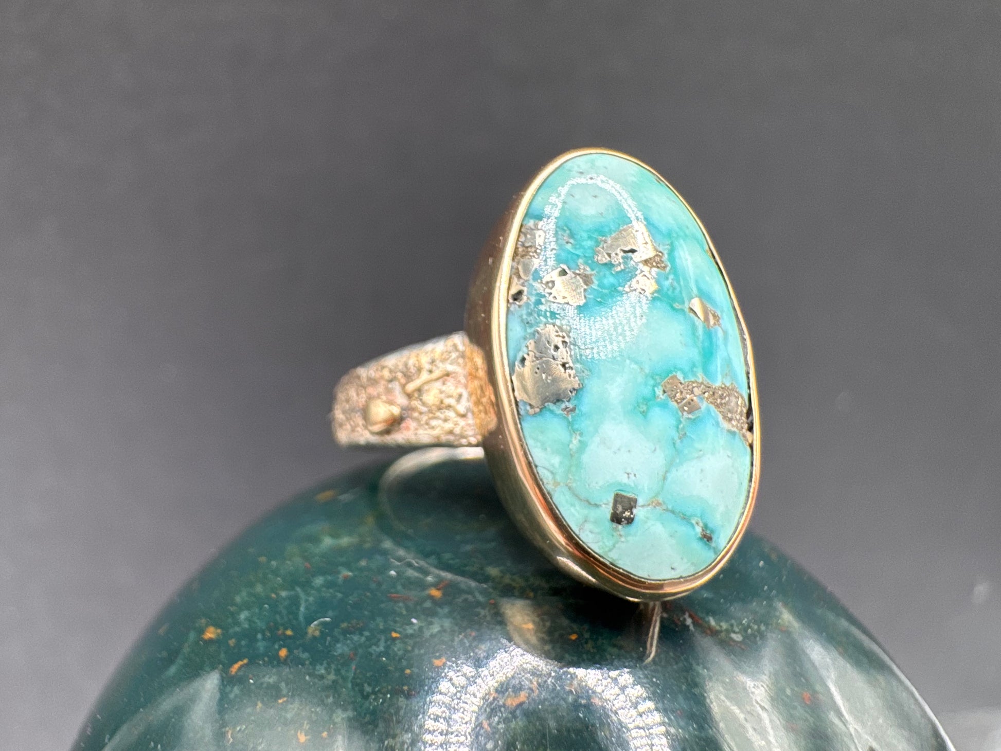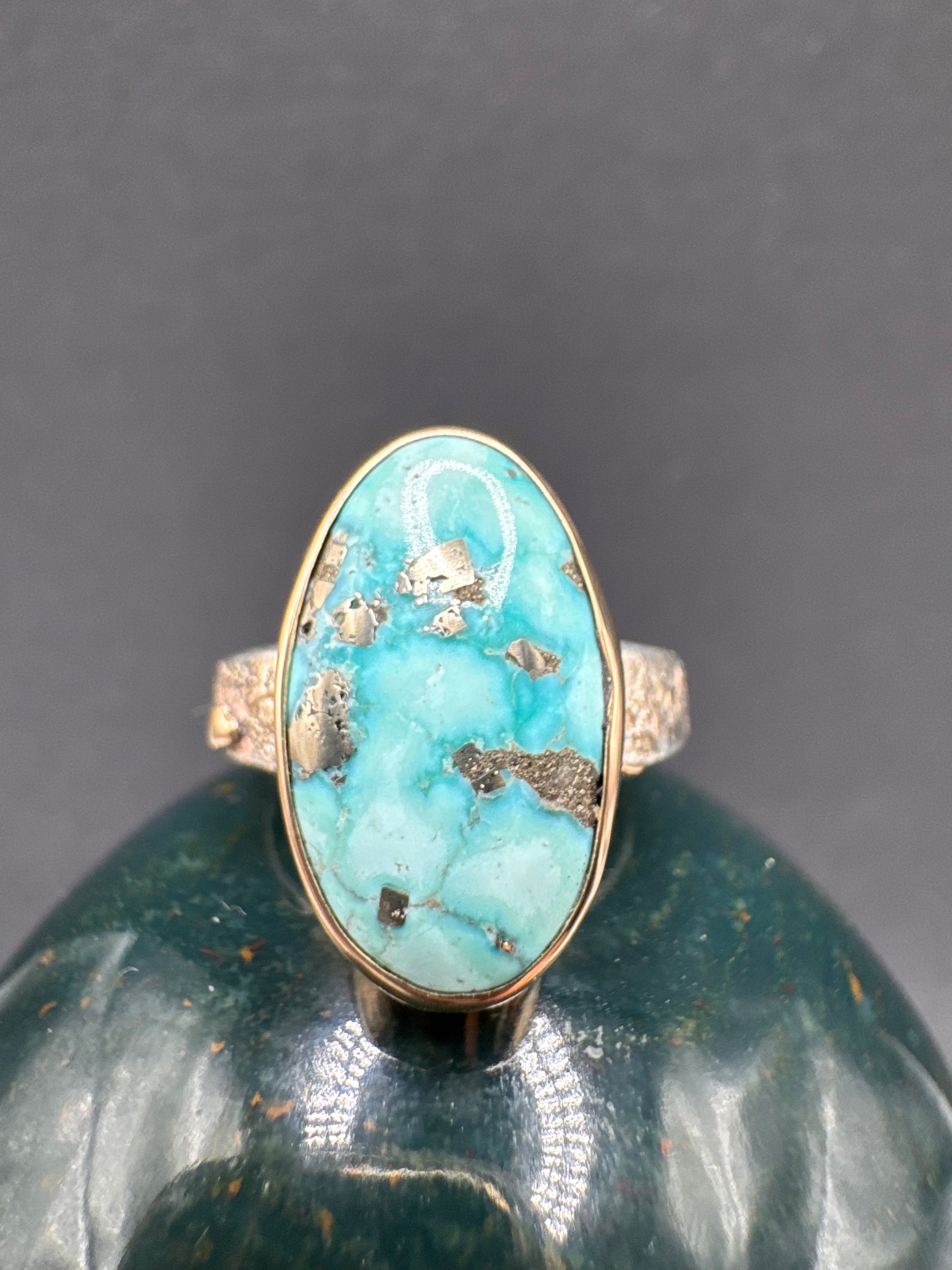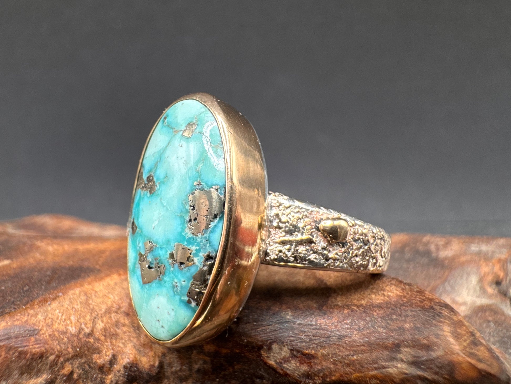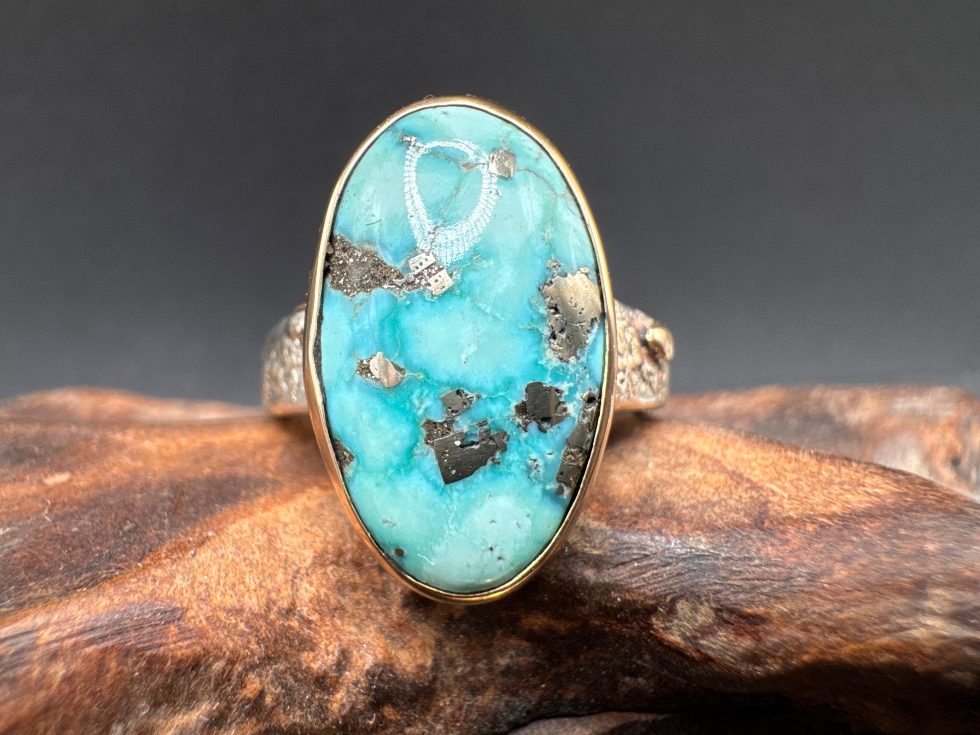 Size 7.25, may be sized up to size 8 at buyers request. 14k gold and sterling silver with pyrite included turquoise. Hidden on the back of the stone is a secret reptile skin impression to reinforce your metaphysical armour.