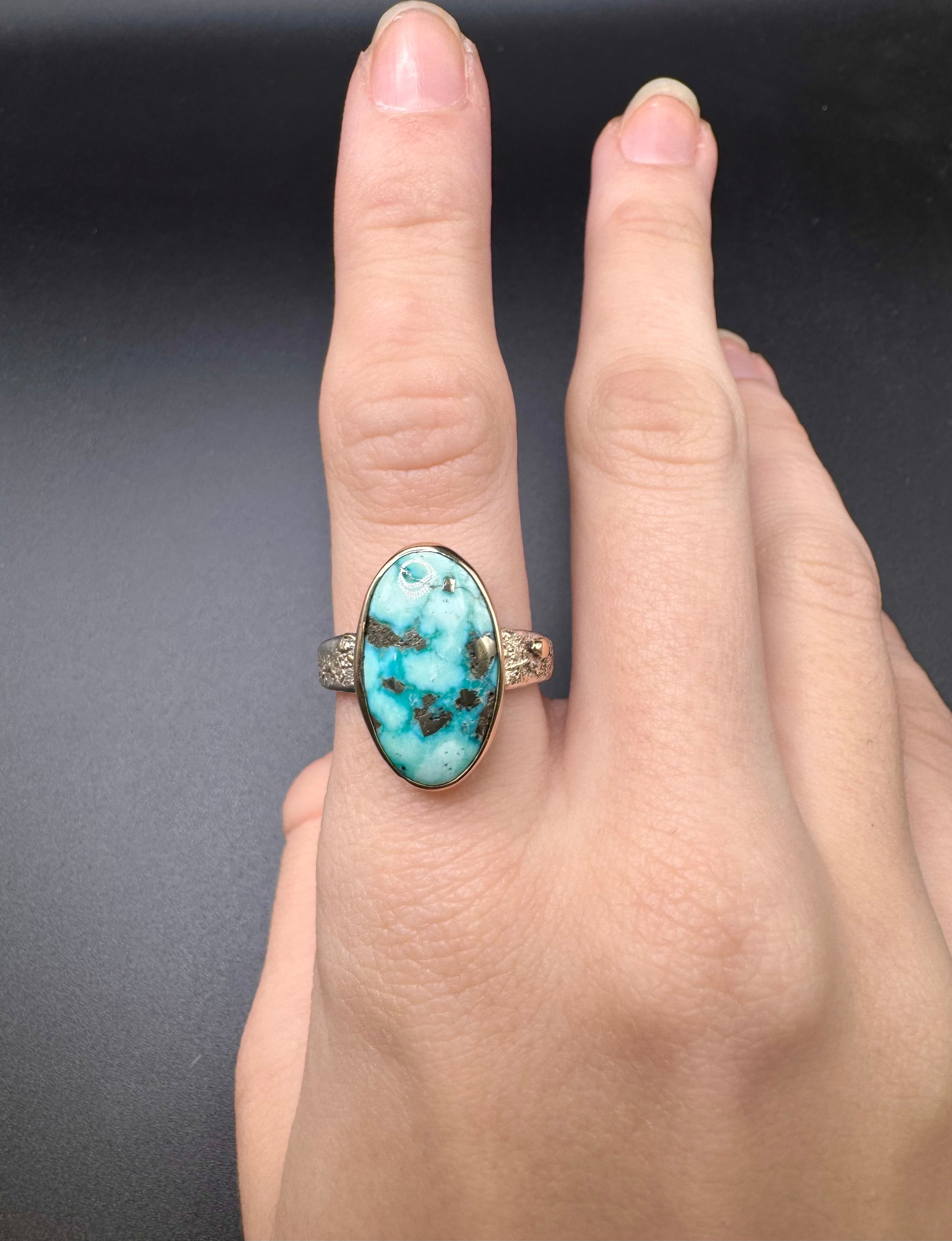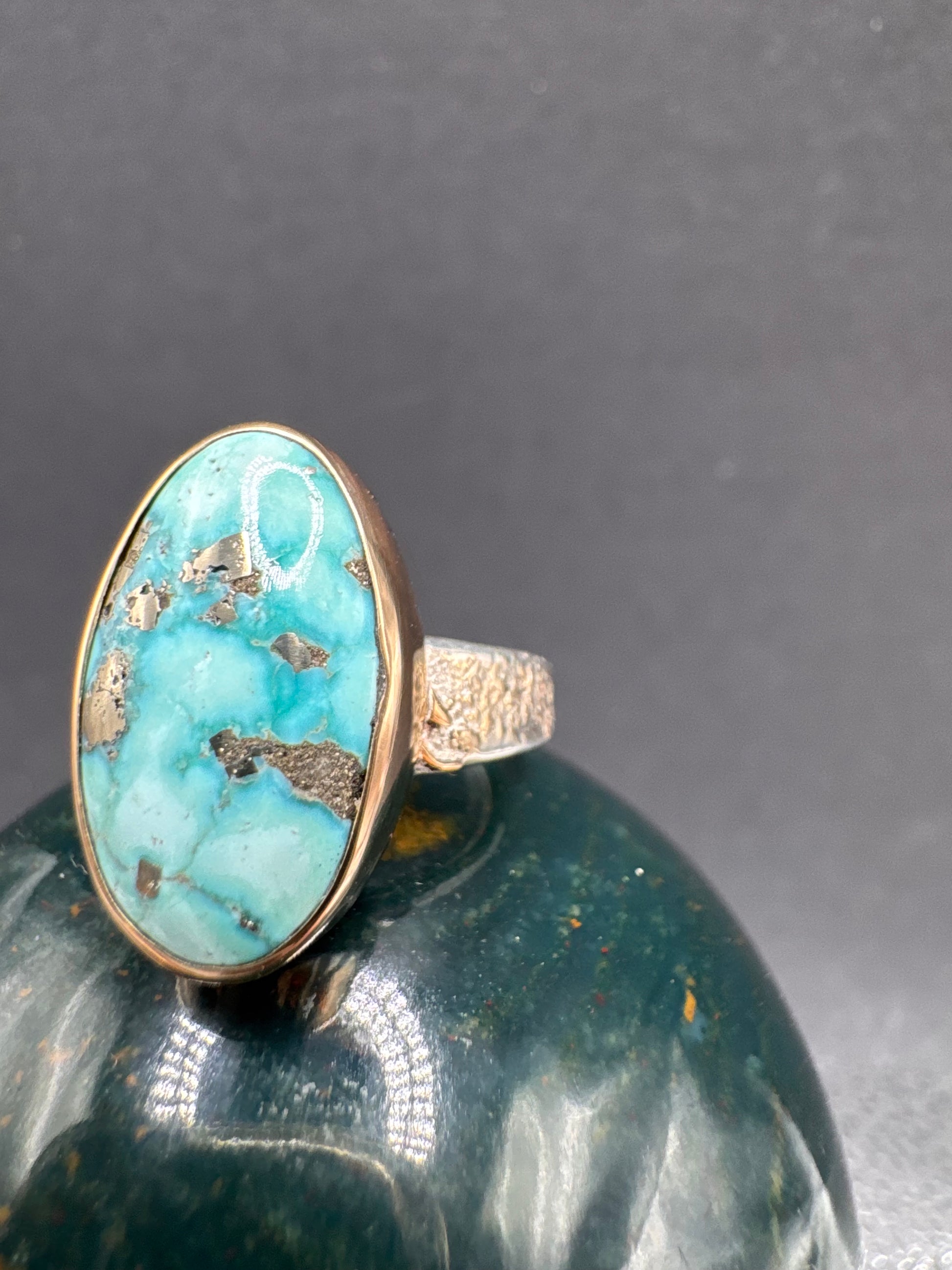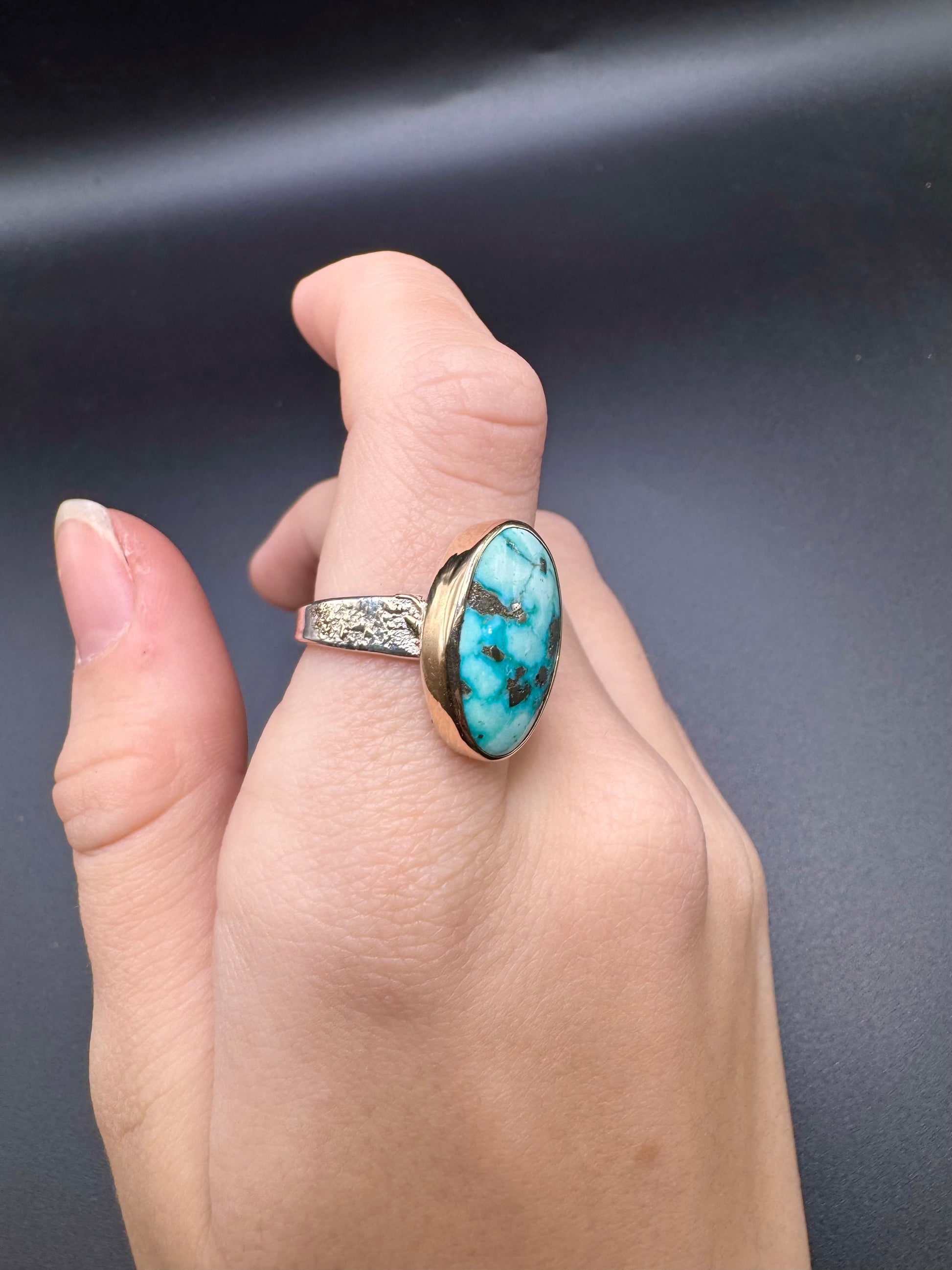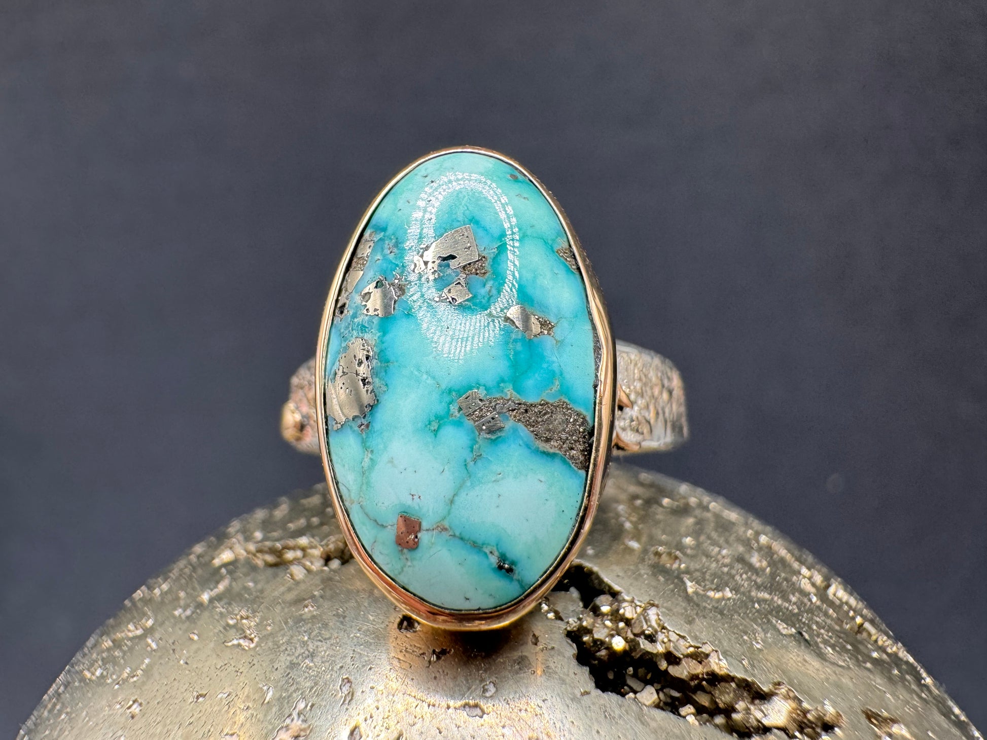 Size 7.25, may be sized up to size 8 at buyers request. 14k gold and sterling silver with pyrite included turquoise. Hidden on the back of the stone is a secret reptile skin impression to reinforce your metaphysical armour.