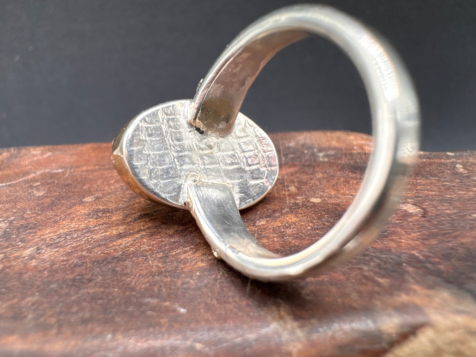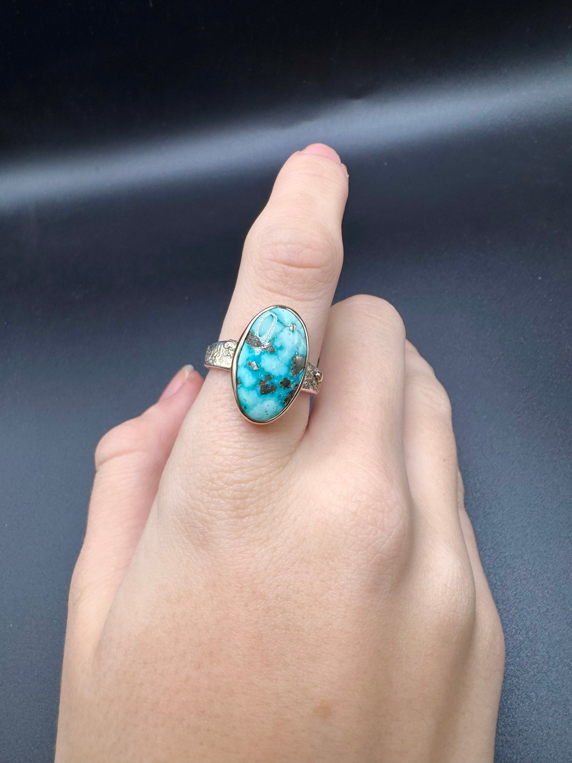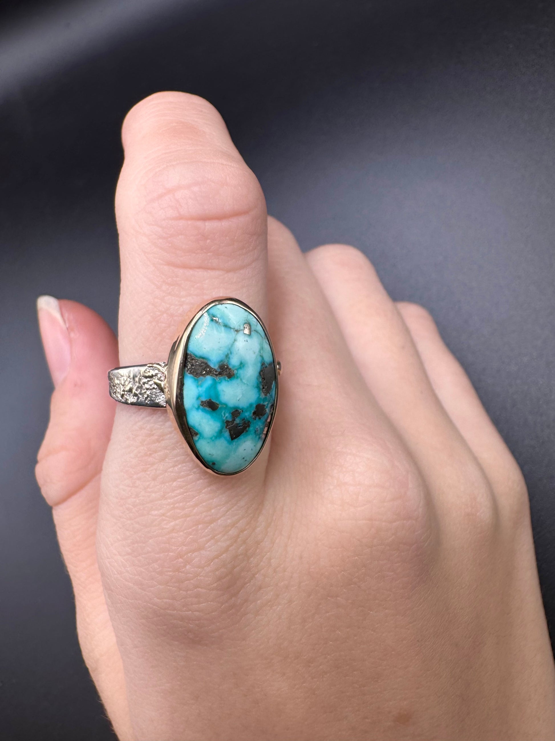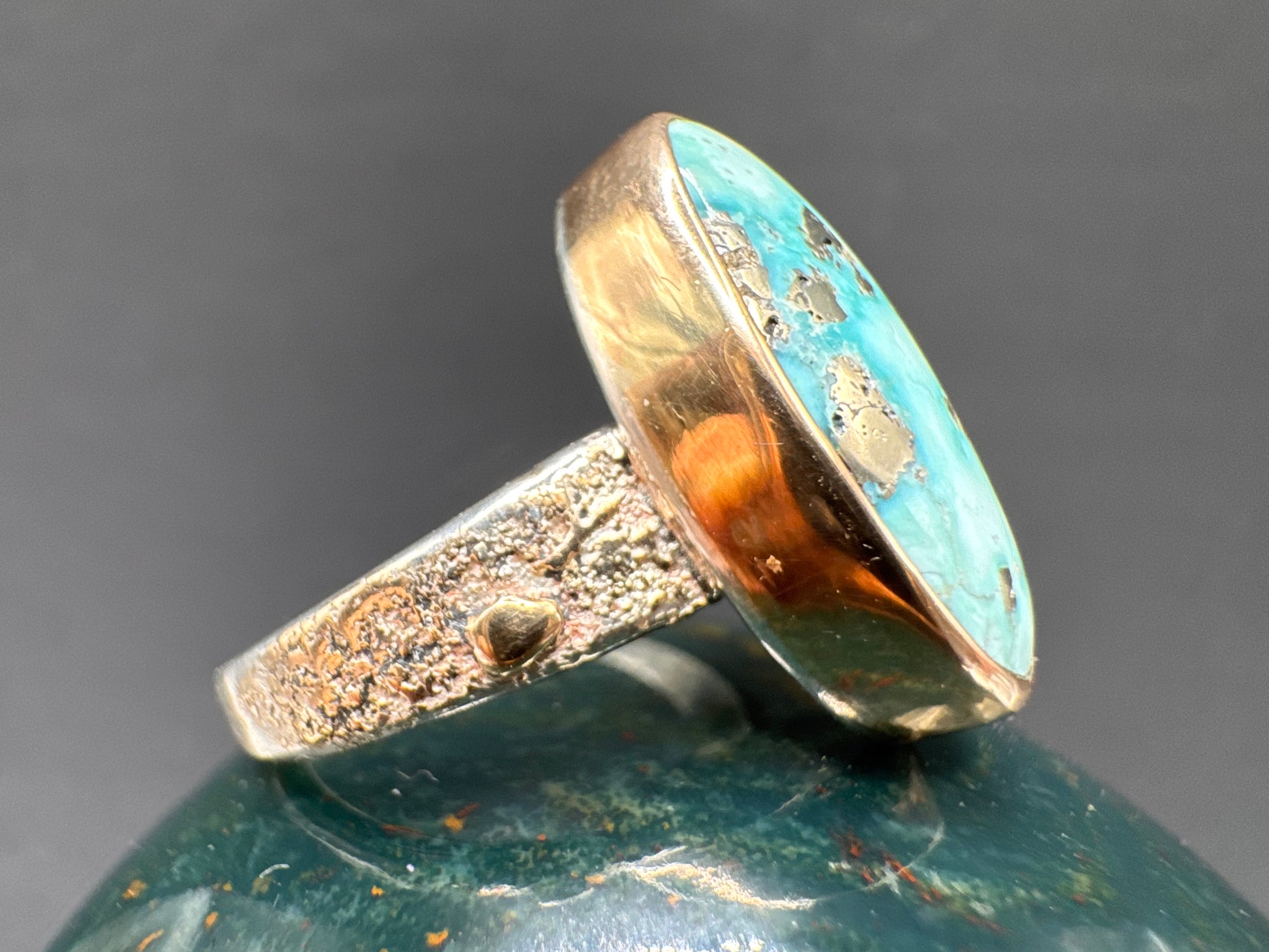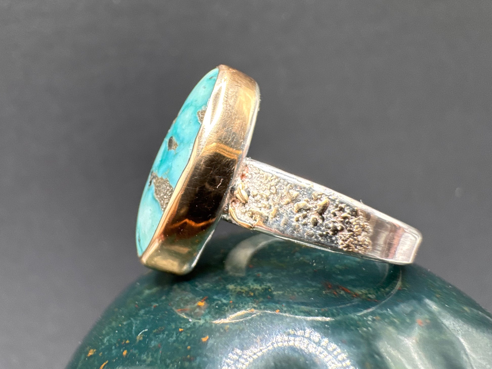 Size 7.25, may be sized up to size 8 at buyers request. 14k gold and sterling silver with pyrite included turquoise. Hidden on the back of the stone is a secret reptile skin impression to reinforce your metaphysical armour.