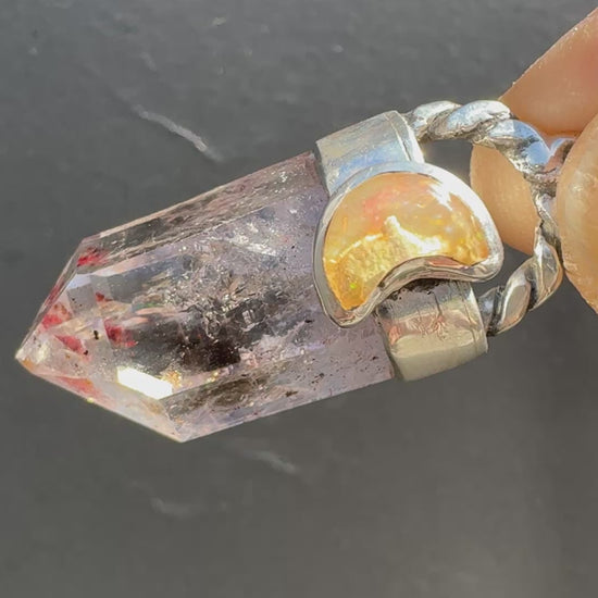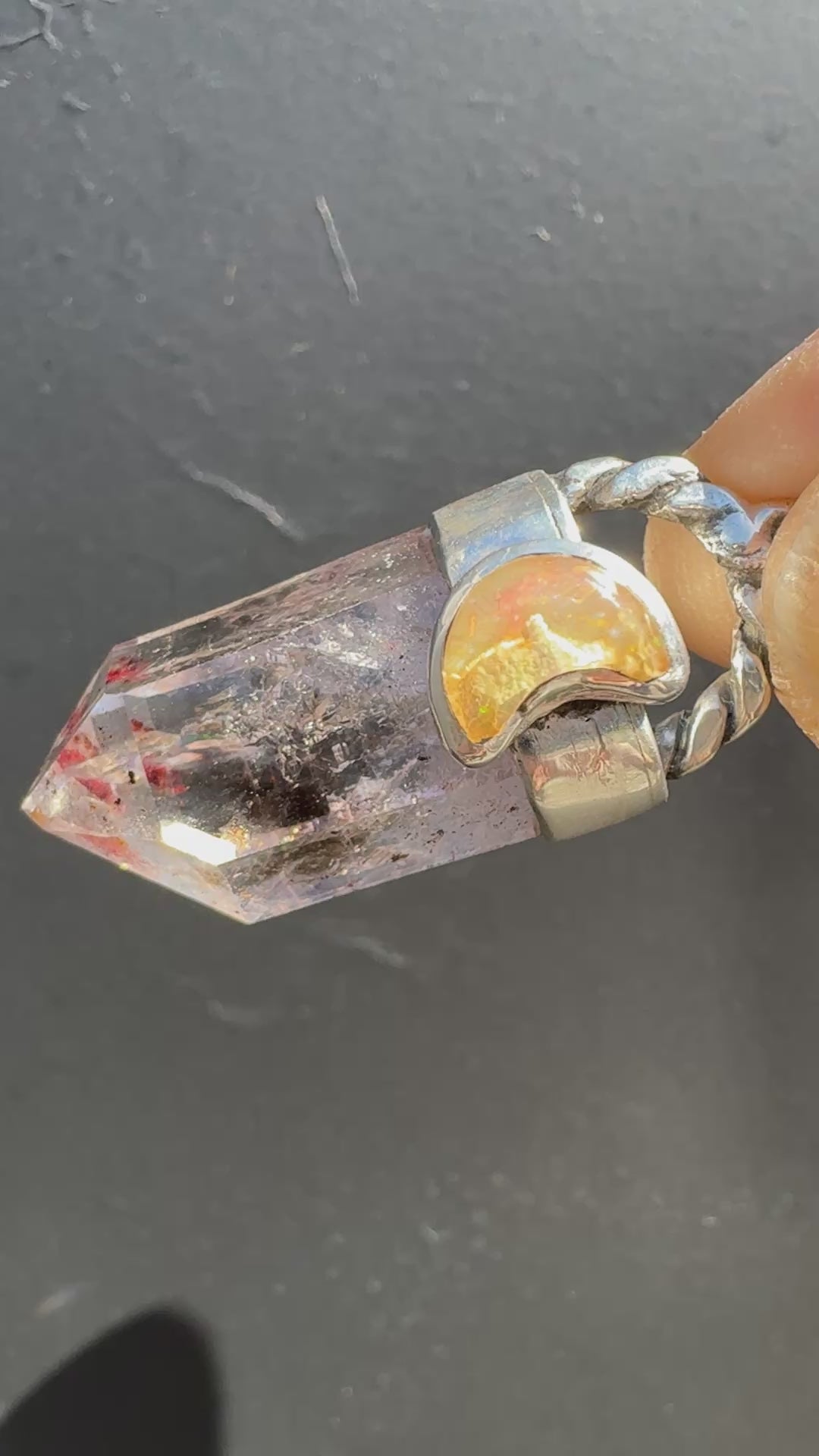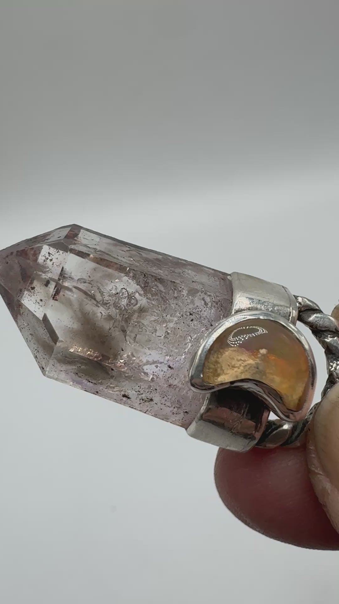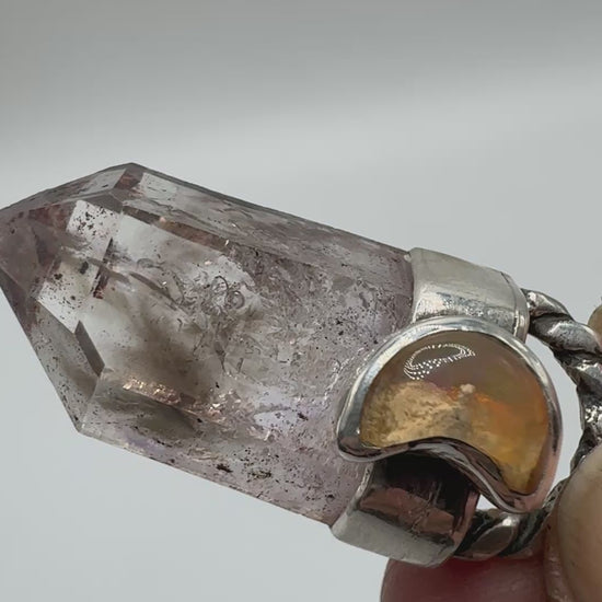 Sterling/fine silver with Mexican opal and enhydro smoky amethyst containing moving bubble and hematite inclusions. Comes on 24 inch sterling silver chain.