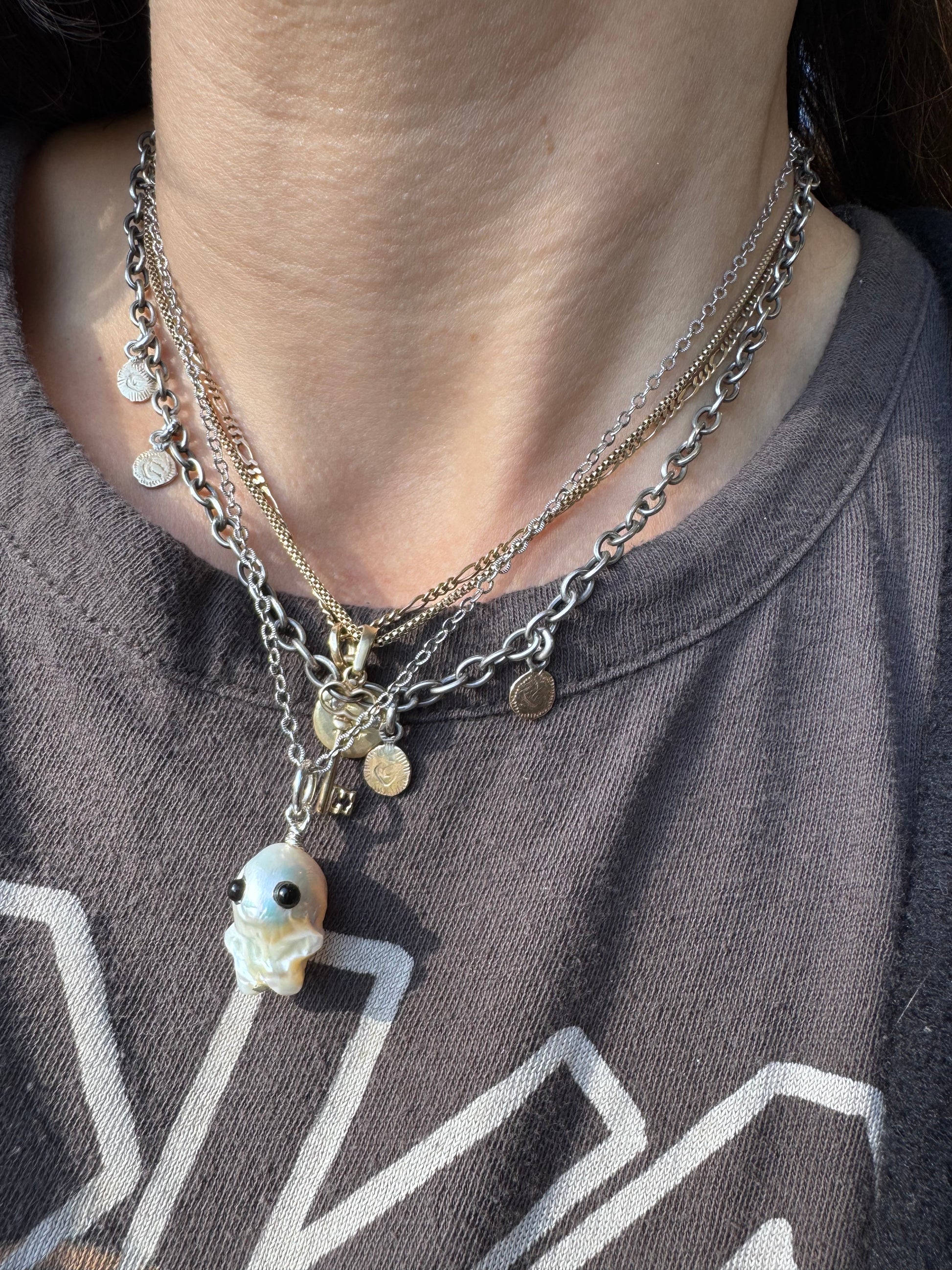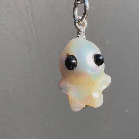 Hand carved baroque freshwater flame pearl with inlaid black onyx eyes. Comes on 18 inch sterling silver chain.