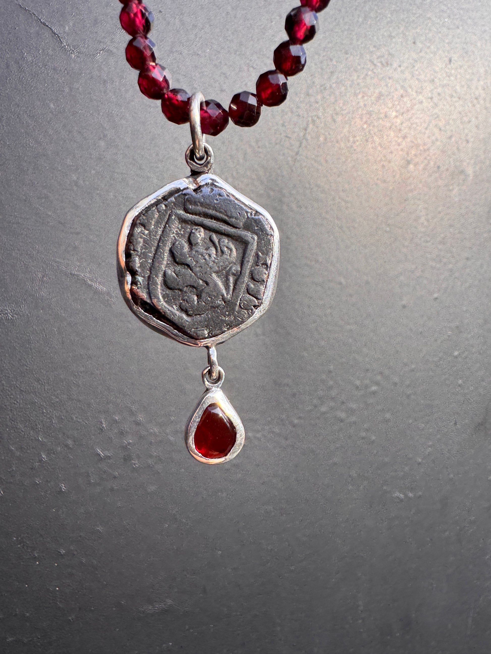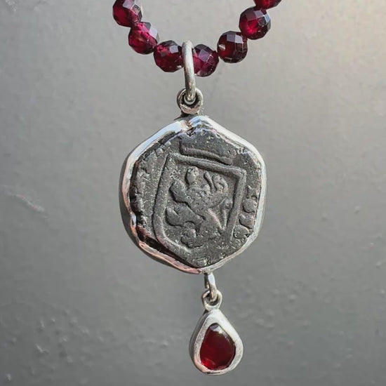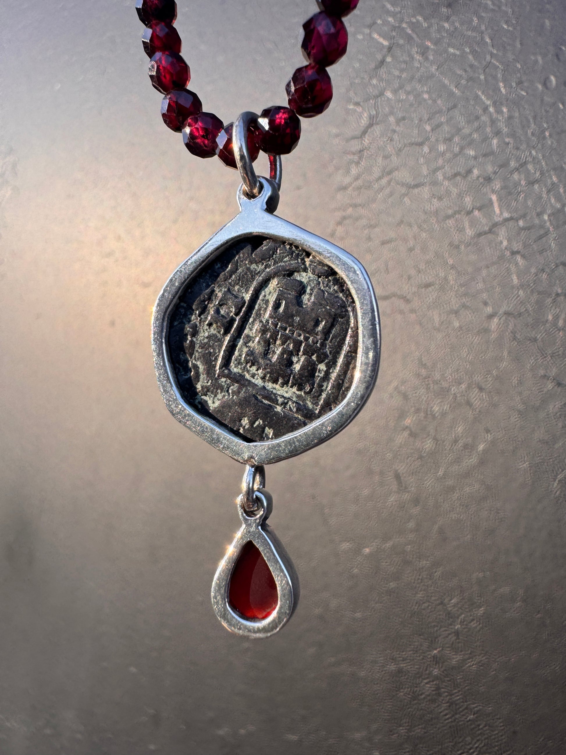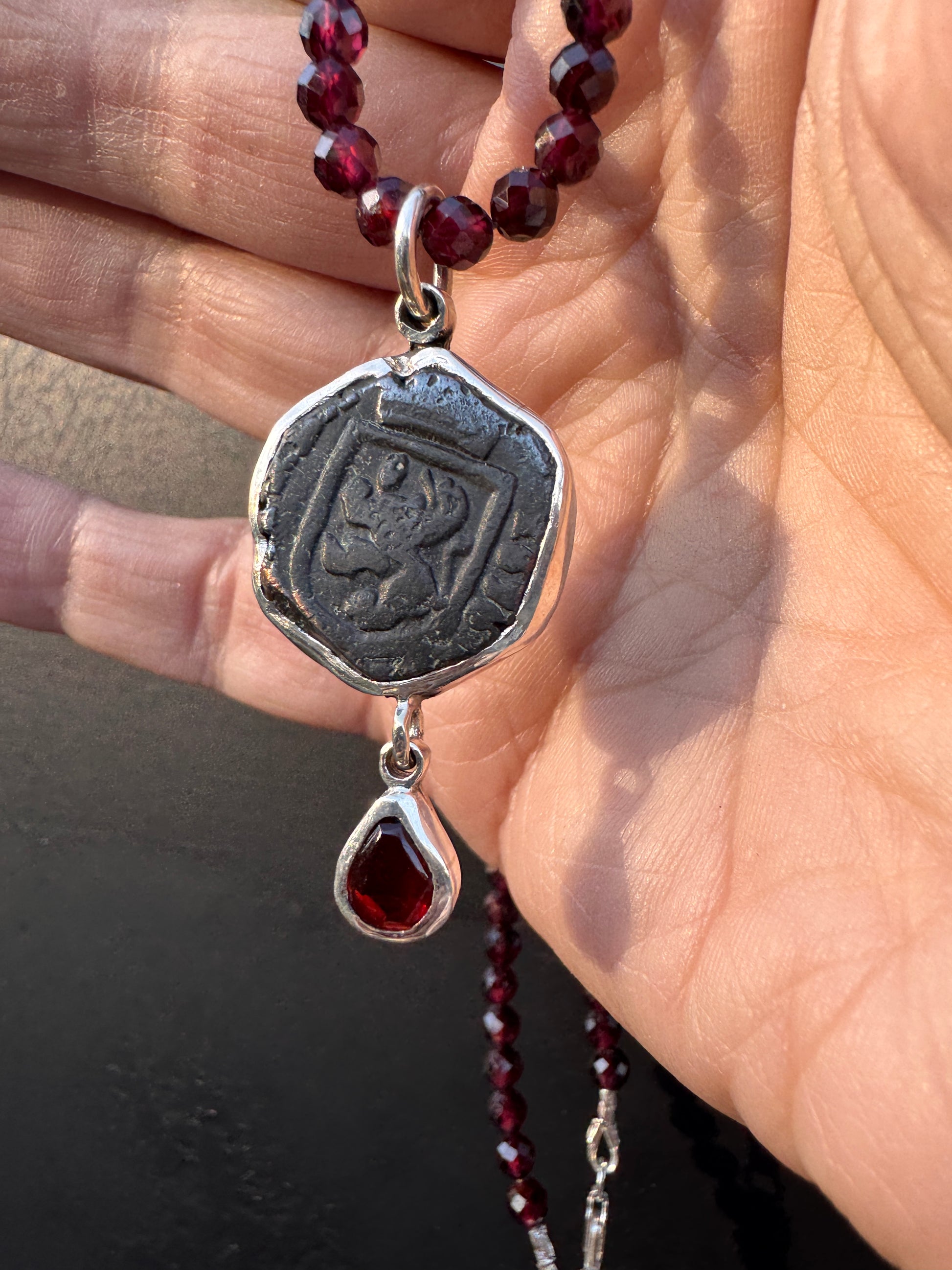 Authentic copper pirate coin from the 1600’s set in silver with garnets. Detachable garnet beads at 18 inches.