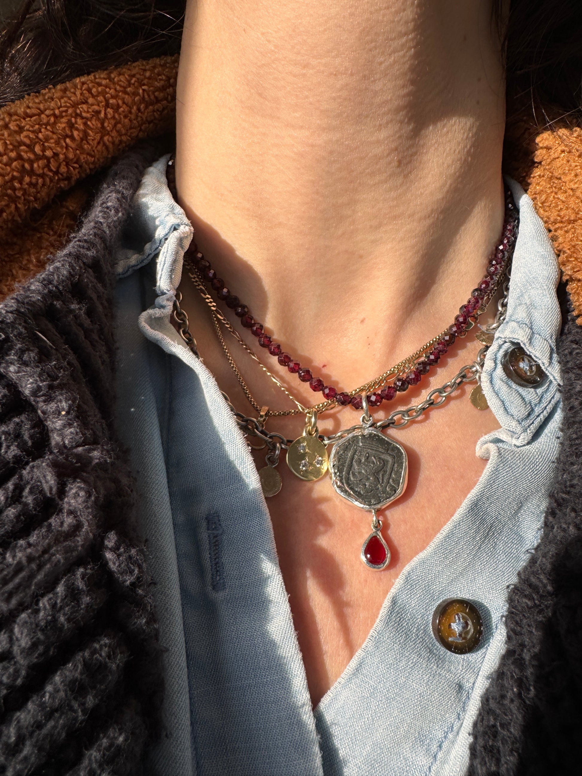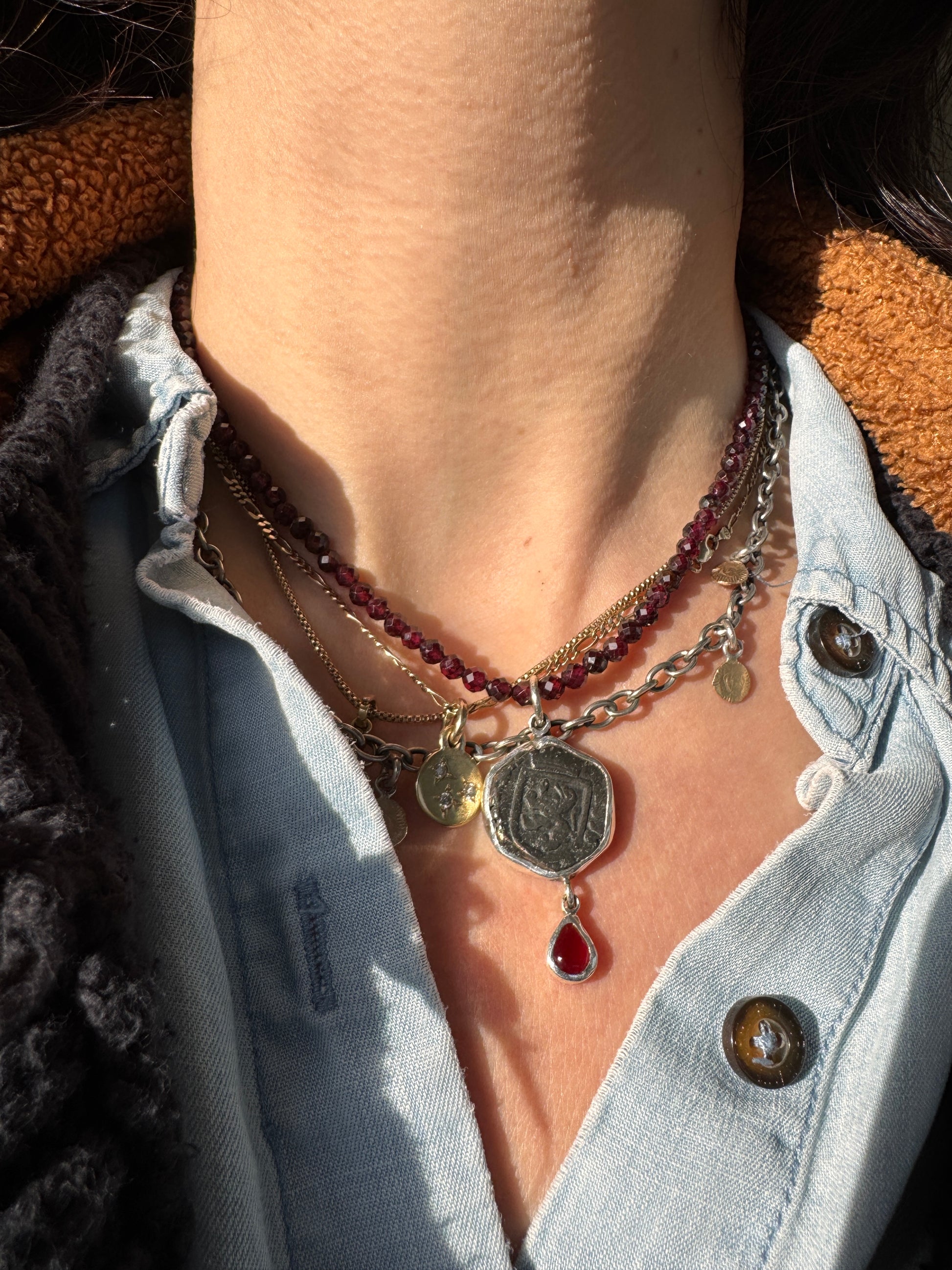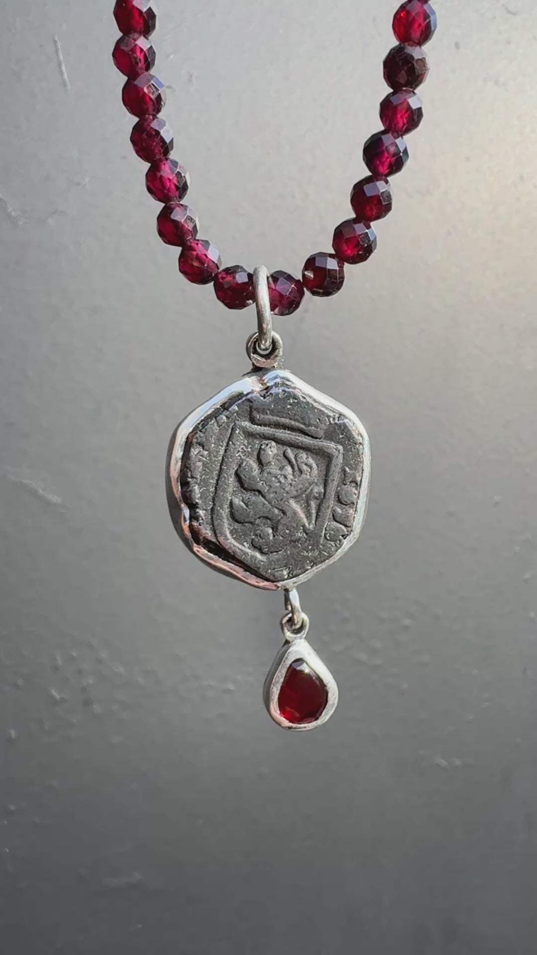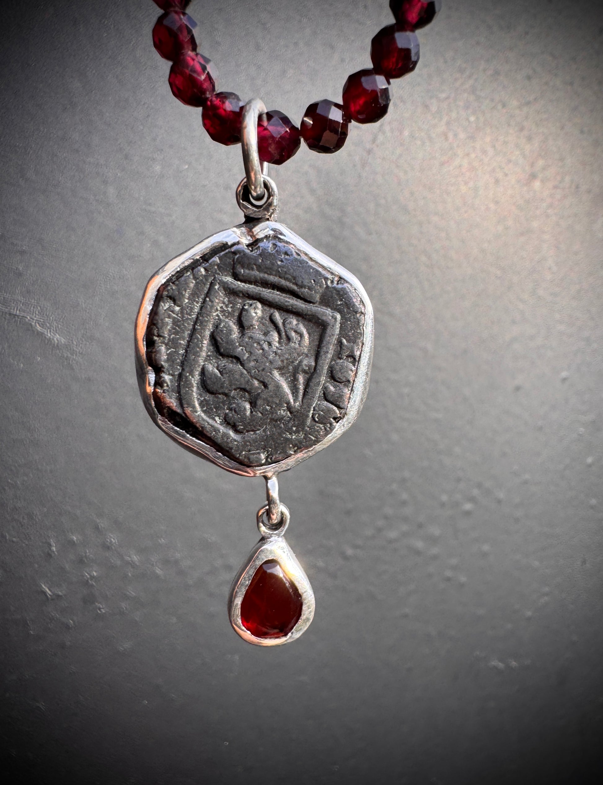 Authentic copper pirate coin from the 1600’s set in silver with garnets. Detachable garnet beads at 18 inches.