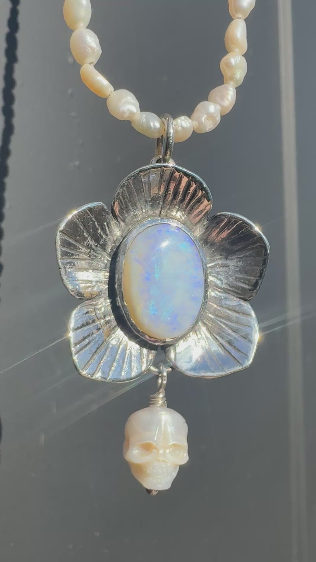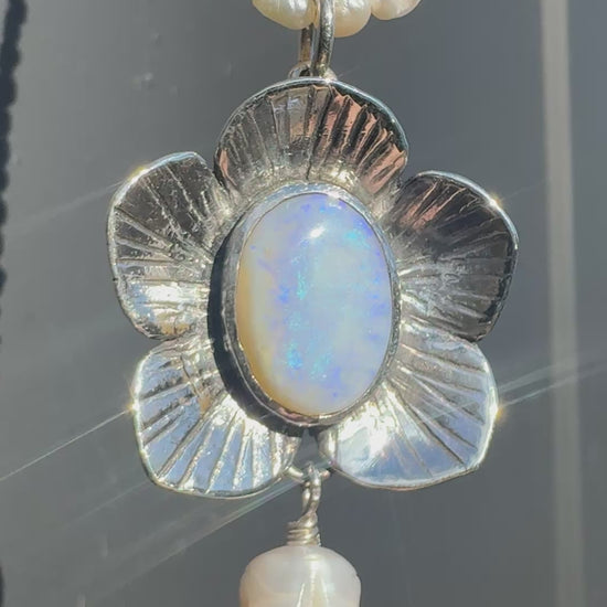 Inspired by original jewelry from the film, an Australian opal buttercup paired with pearls. Comes on 17 inch detachable freshwater pearl strand.