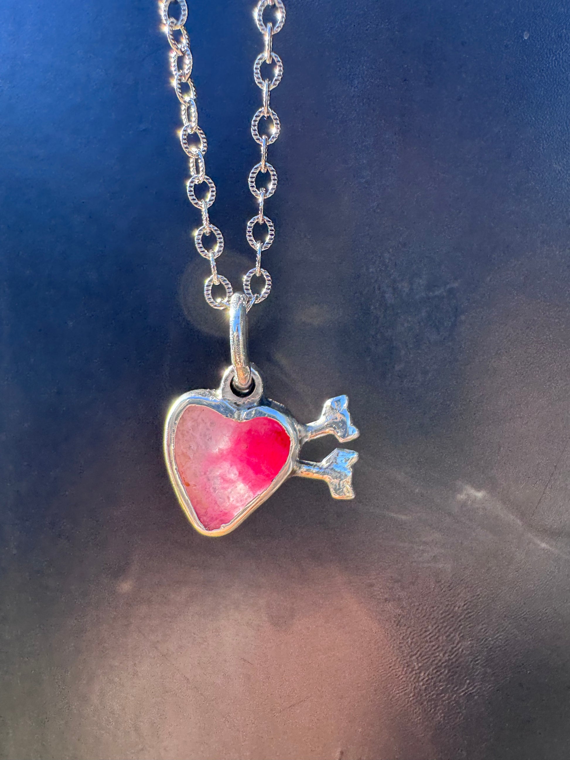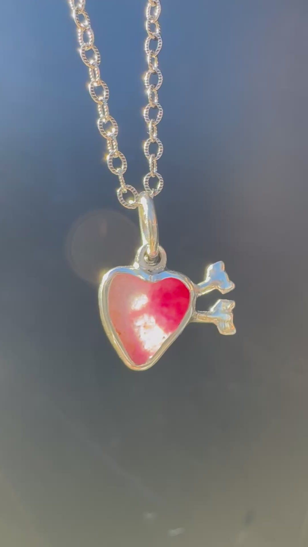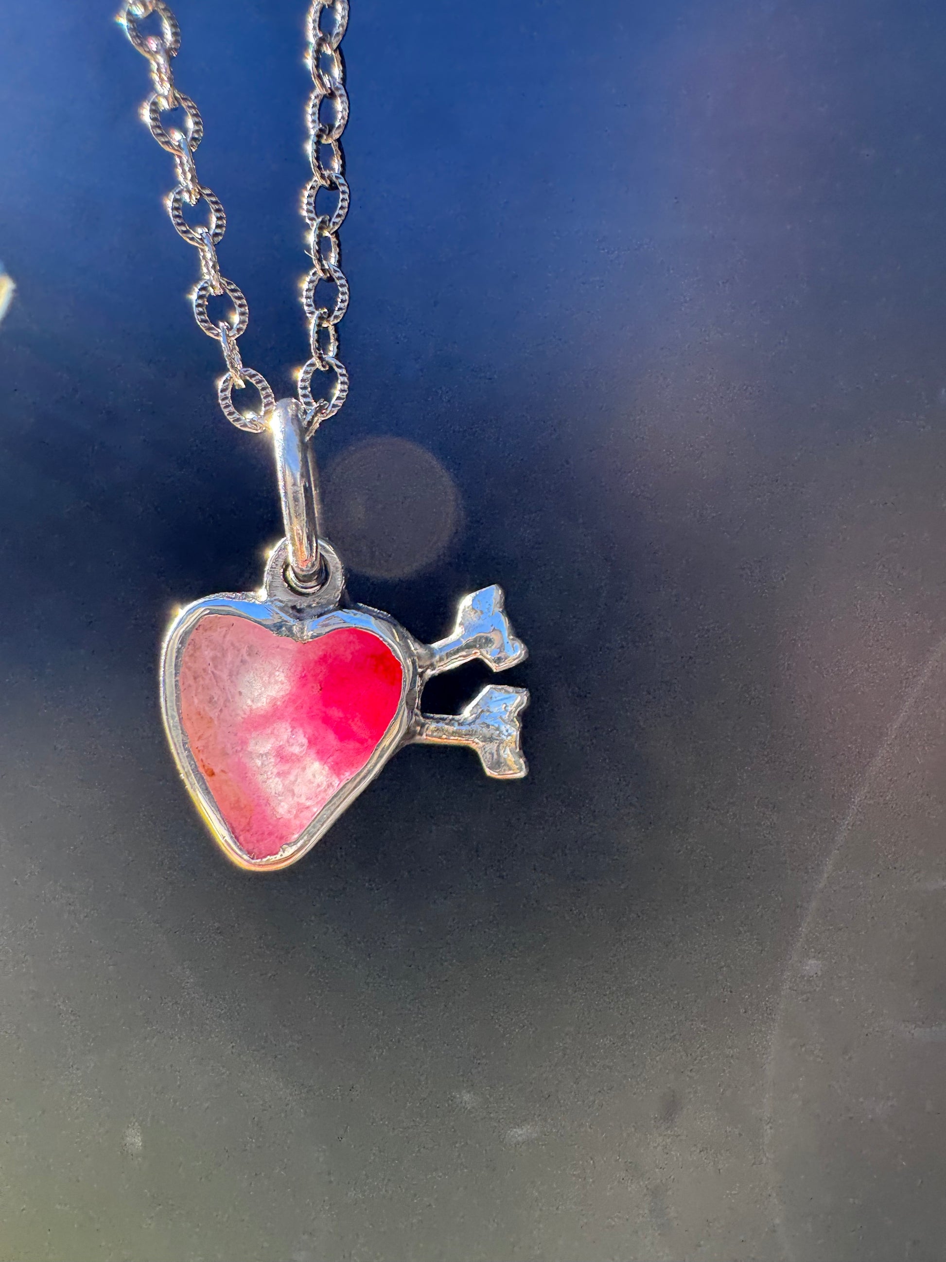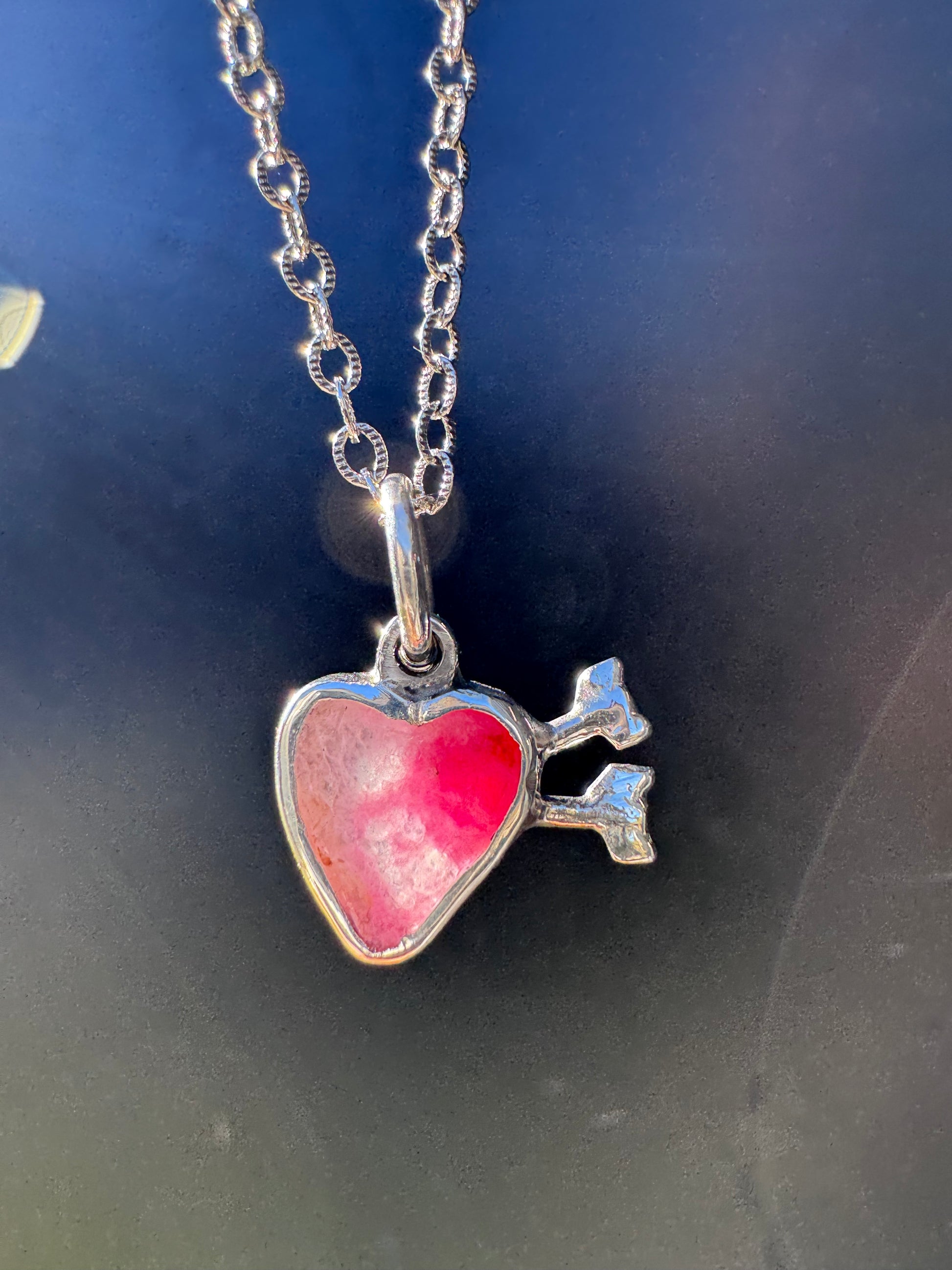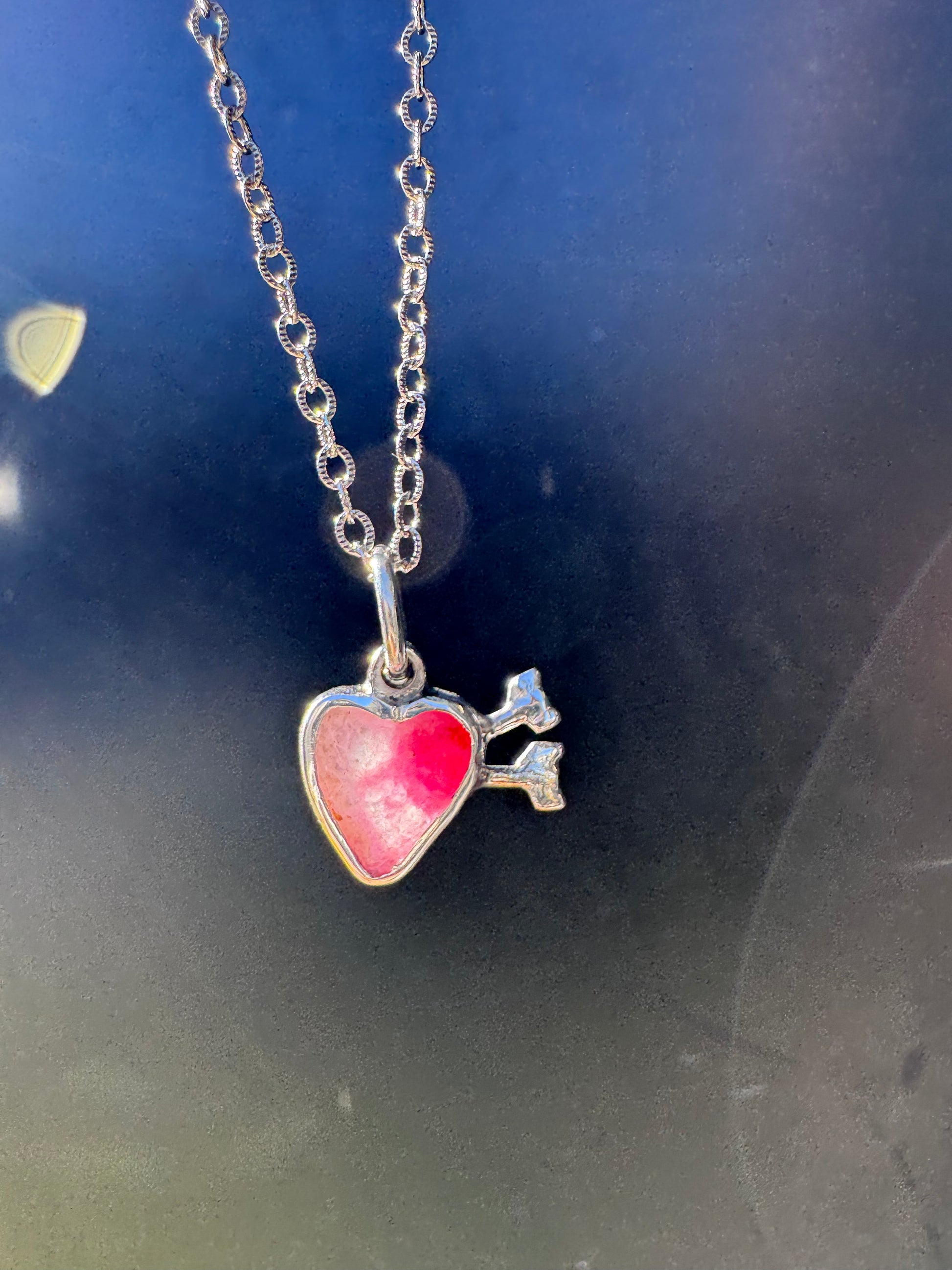 Sterling silver and hand carved UV reactive tugtupite. Comes on 18 inch oxidized sterling silver chain shown in pictures.