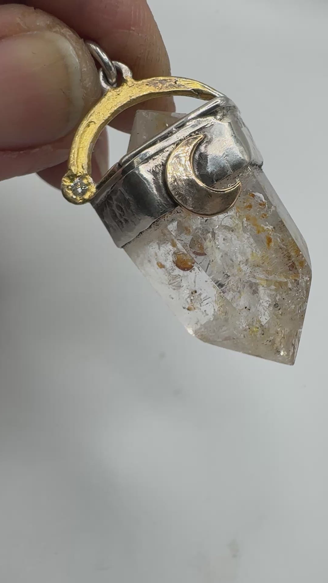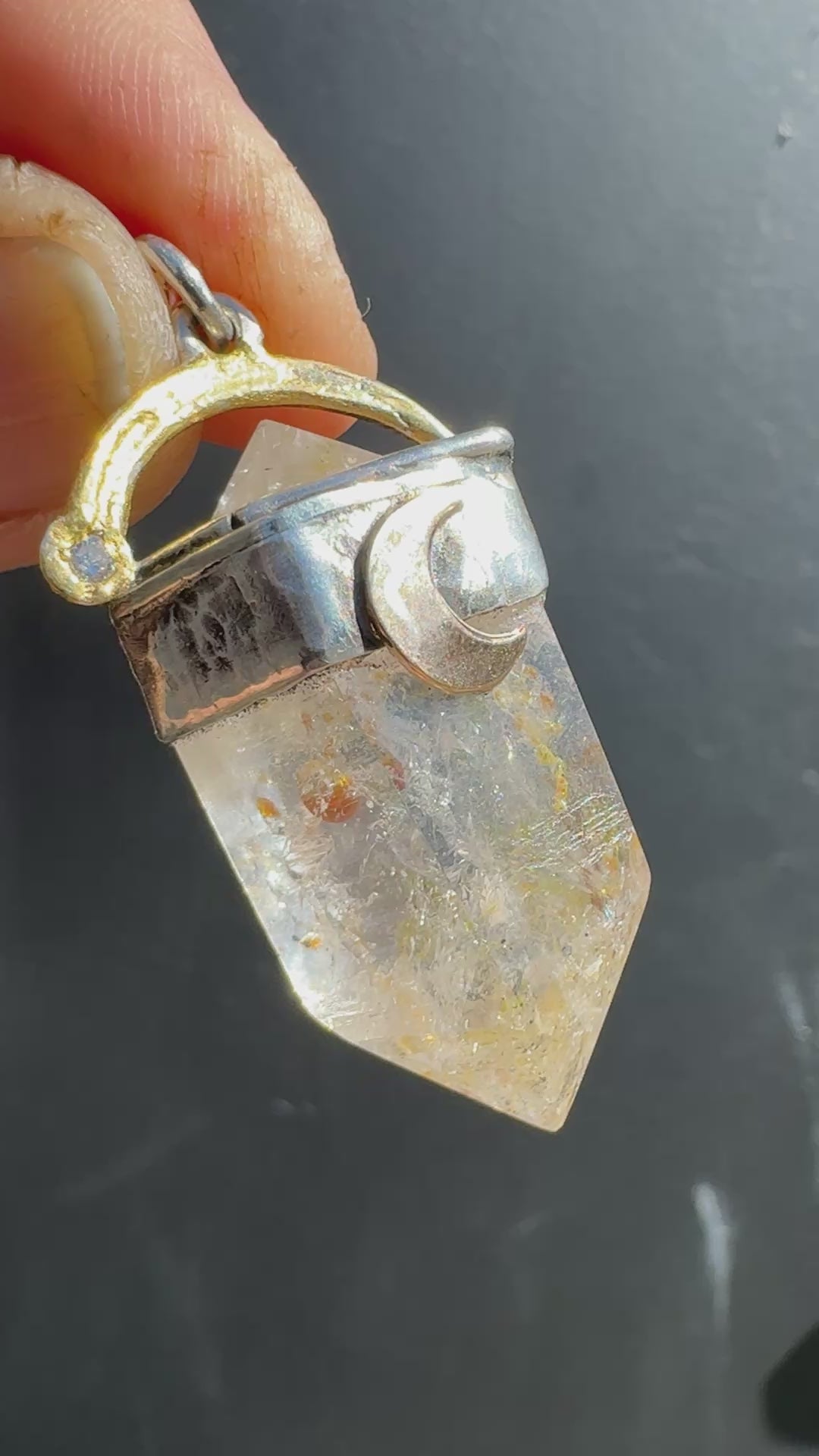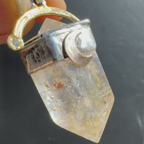 Incredible natural UV reactive petroleum included quartz crystal with moving sun bubble. Set in sterling/fine silver with 22k gold moon and fused 24k gold diamond shooting star. Comes on buyers choice in length of silver chain.