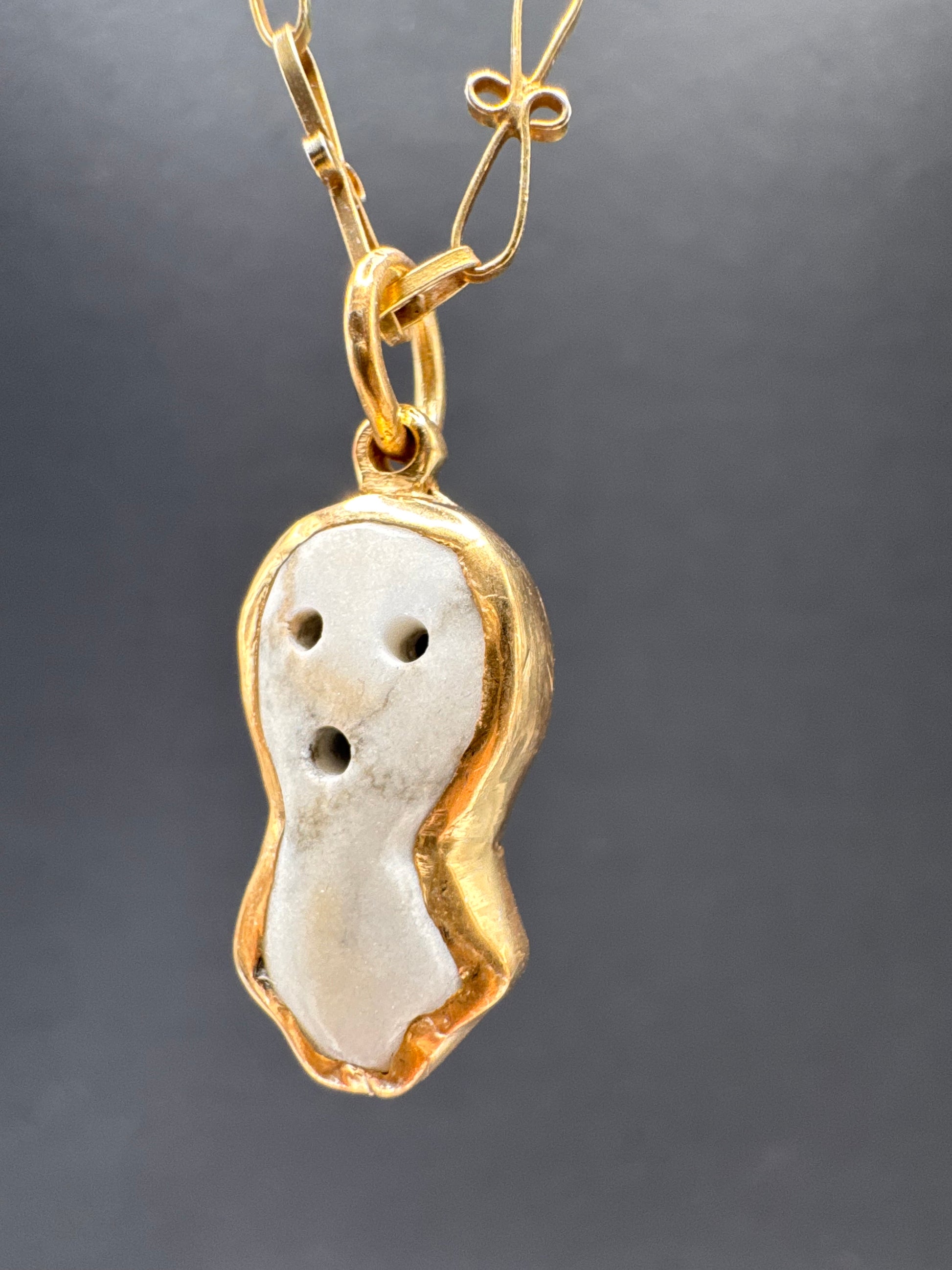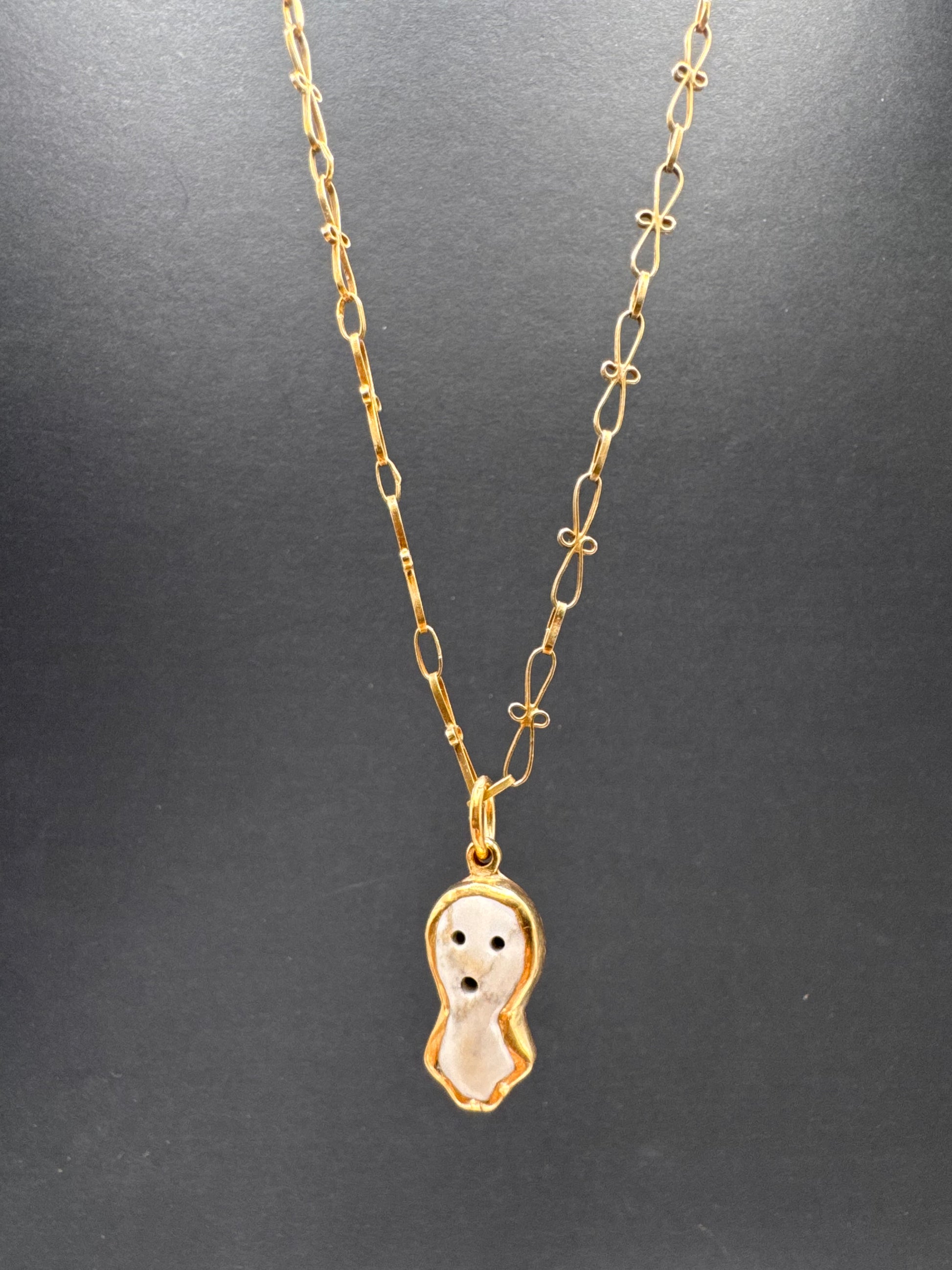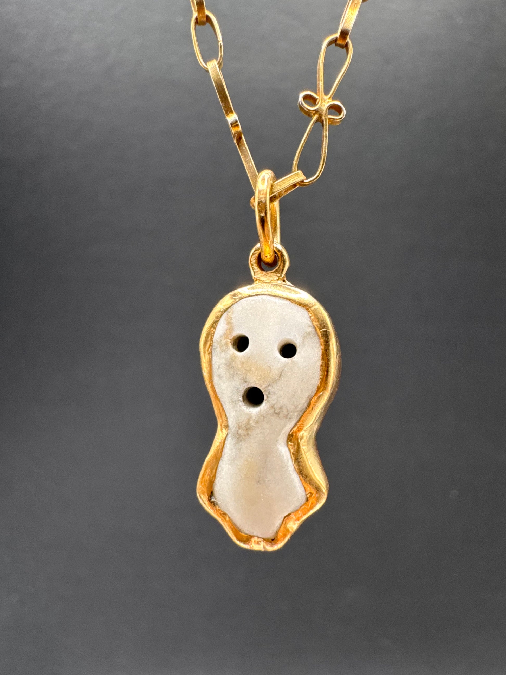 Carved howlite Kodama by Lorelei Lapidary set in gold plated silver. Comes on 24 inch gold plated vintage silver chain which may be worn separately.