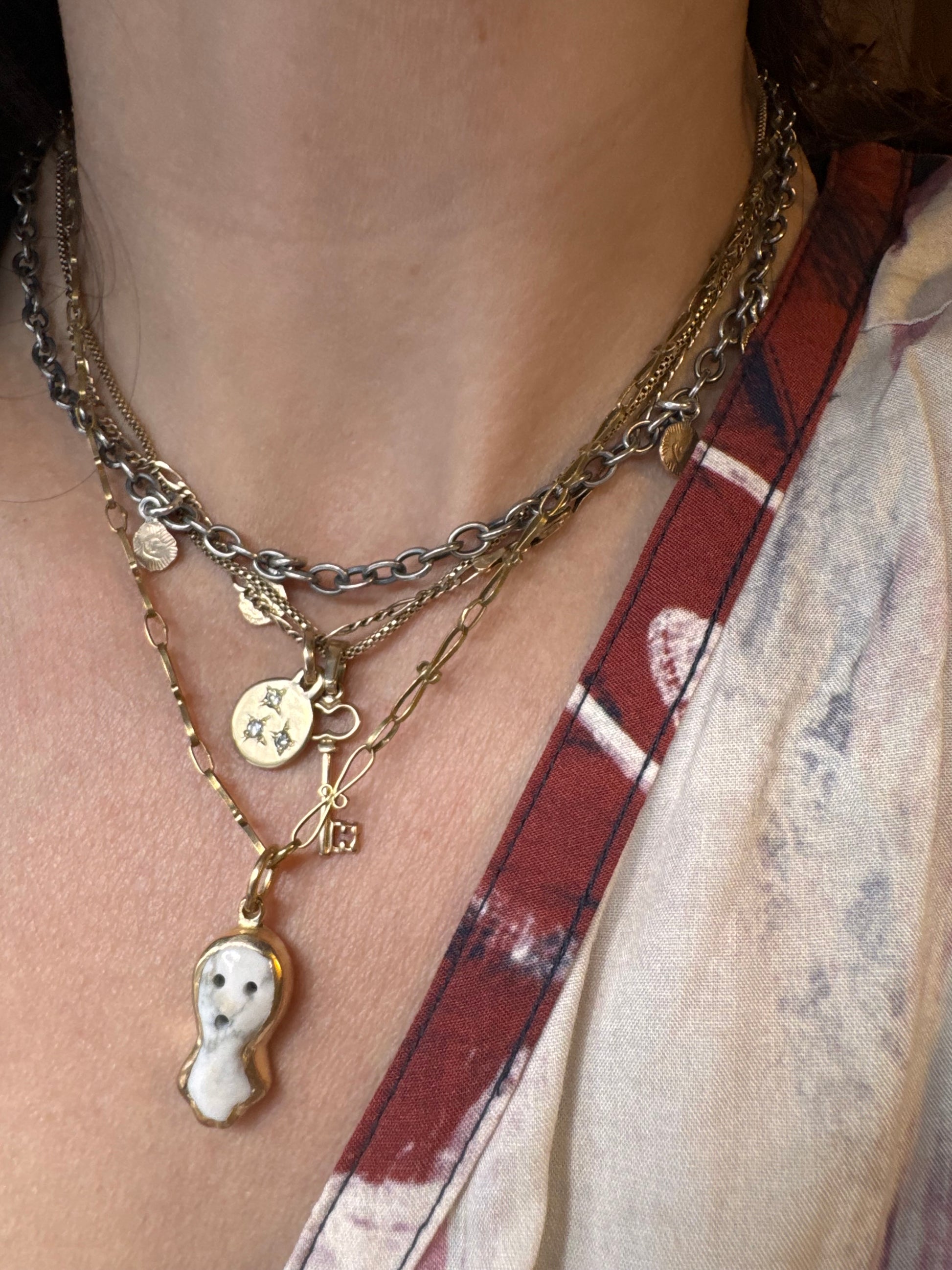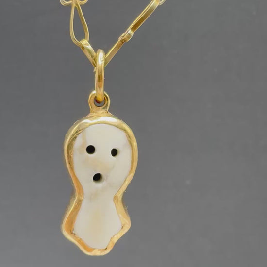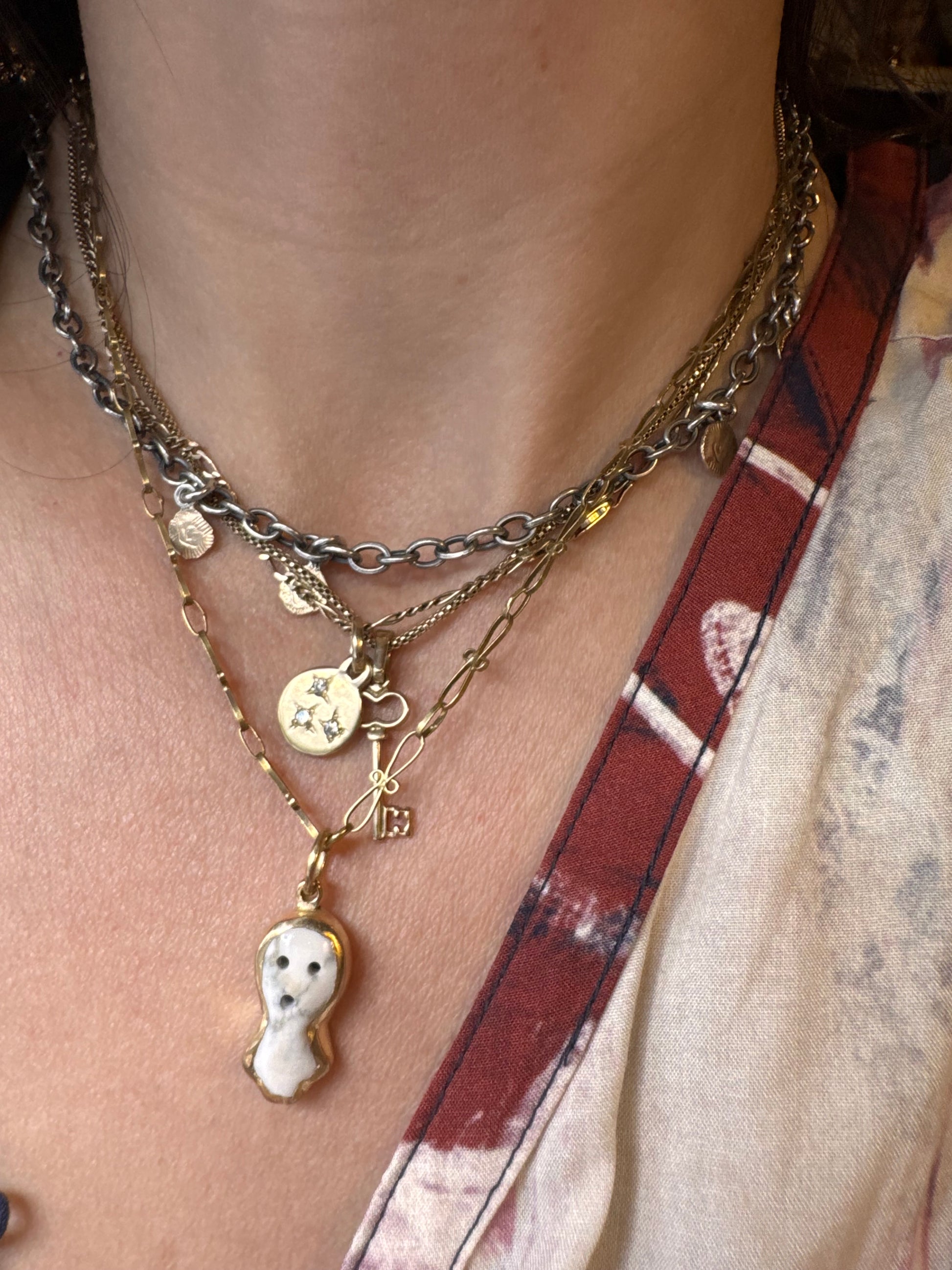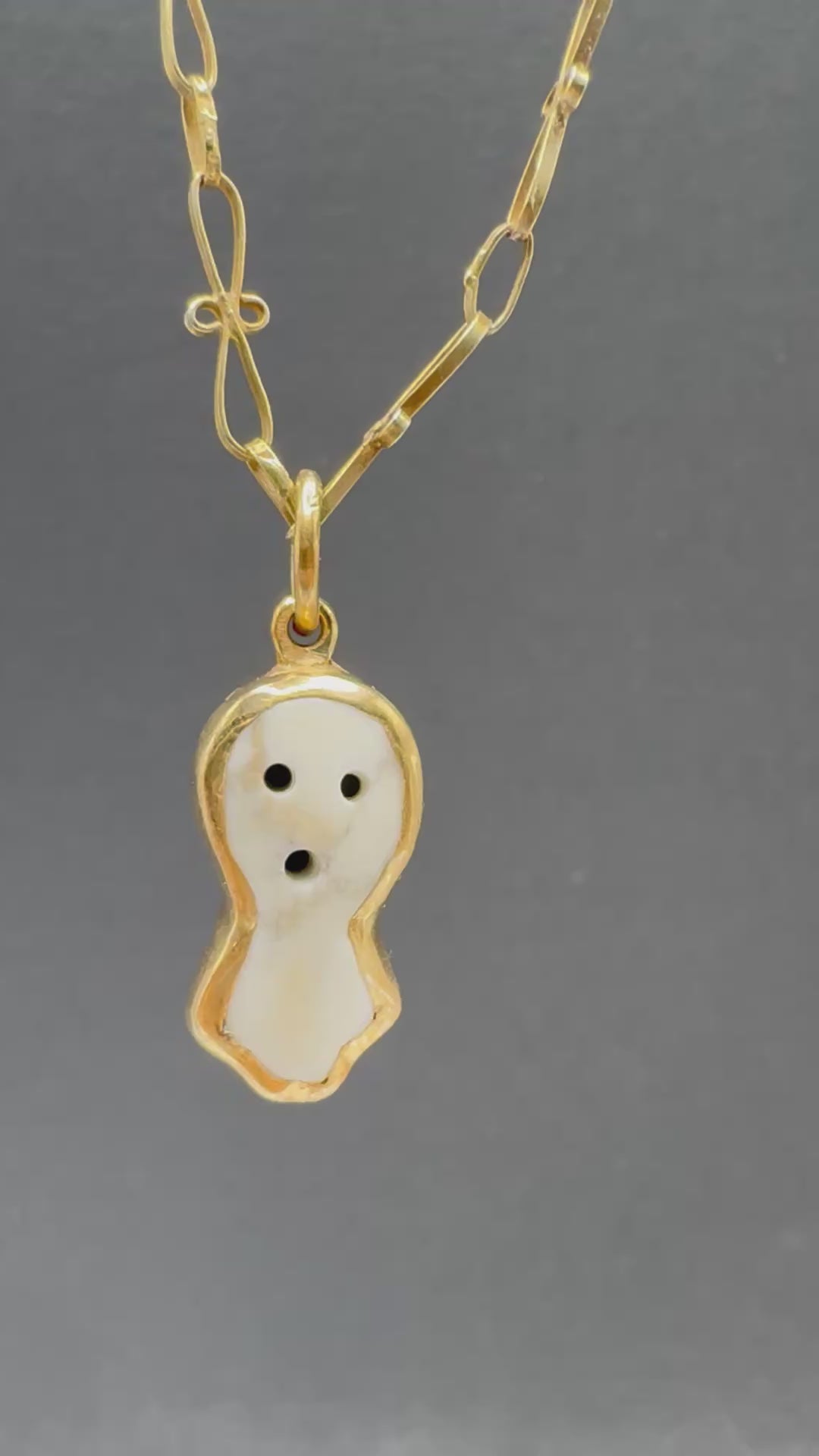 Carved howlite Kodama by Lorelei Lapidary set in gold plated silver. Comes on 24 inch gold plated vintage silver chain which may be worn separately.