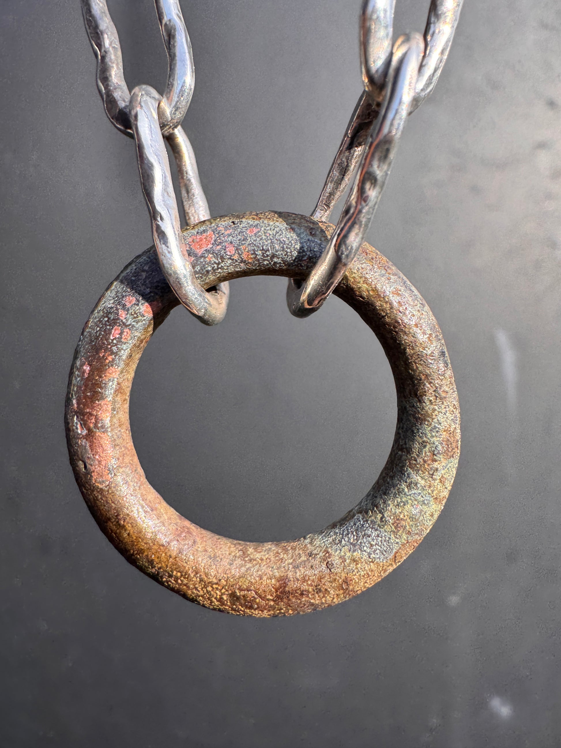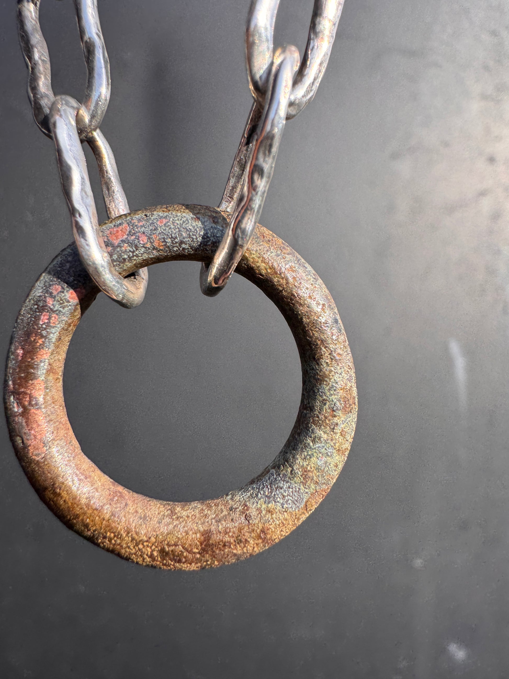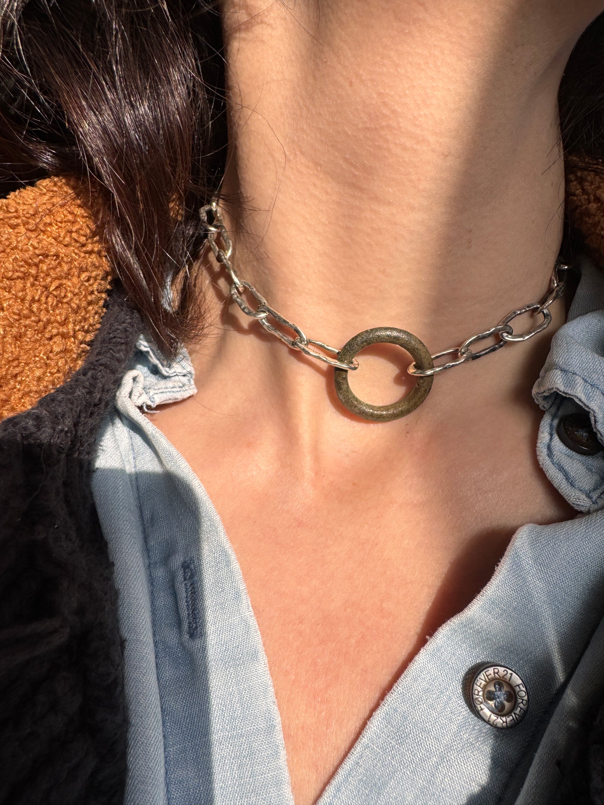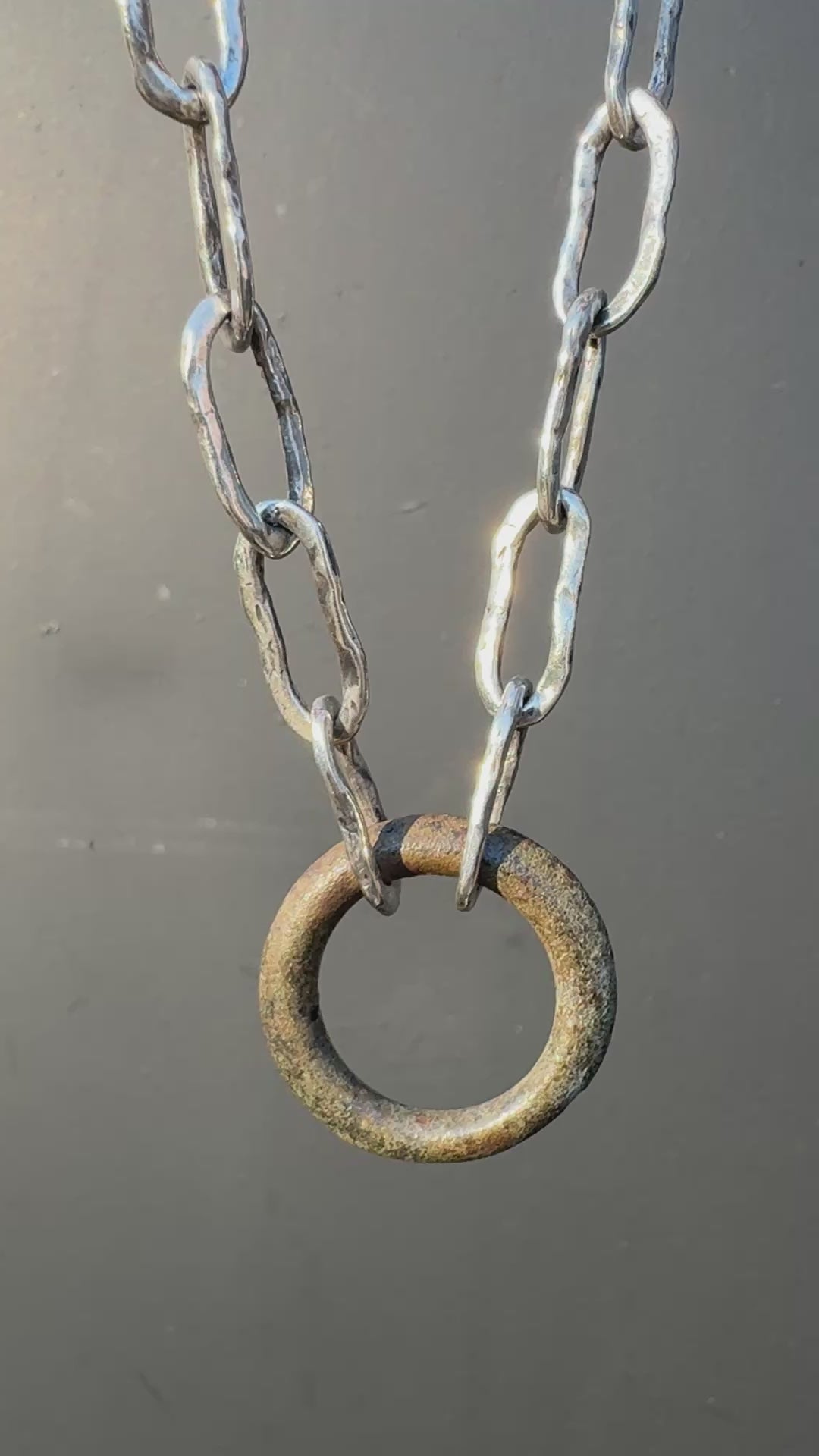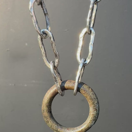 A 2000 year old ancient bronze Celtic money ring entwined with hand forged chunky sterling silver chain. These money rings are thought to be an early currency prototype, as they are found in coin like caches. They could also potentially also have multiple functional uses such as clothing fasteners. Swipe to see how This bold minimalist choker chain also doubles as a bracelet. Currently fits a medium to small neck size and measures 14.5 inches in length.