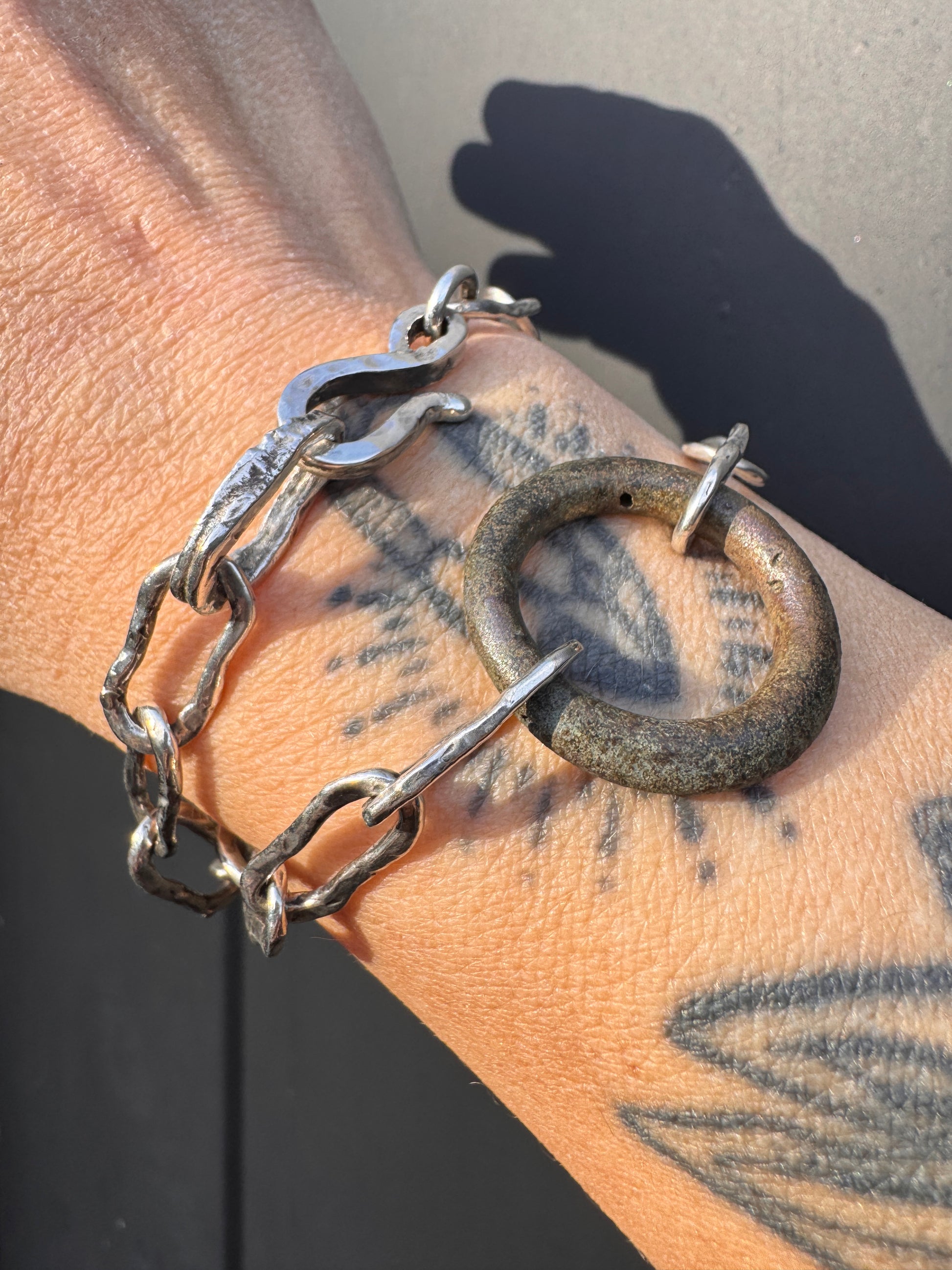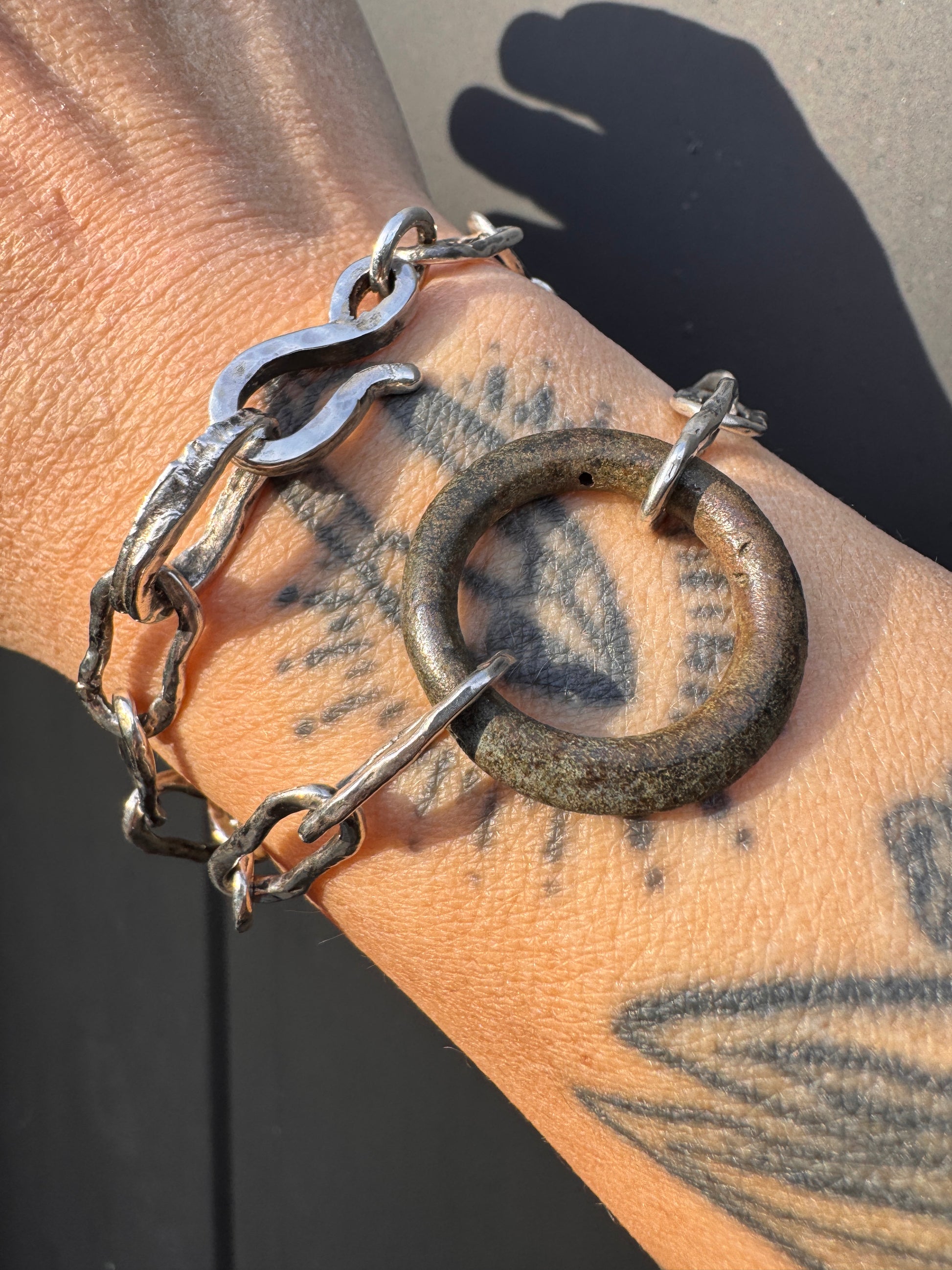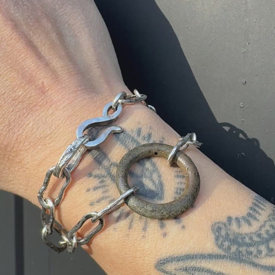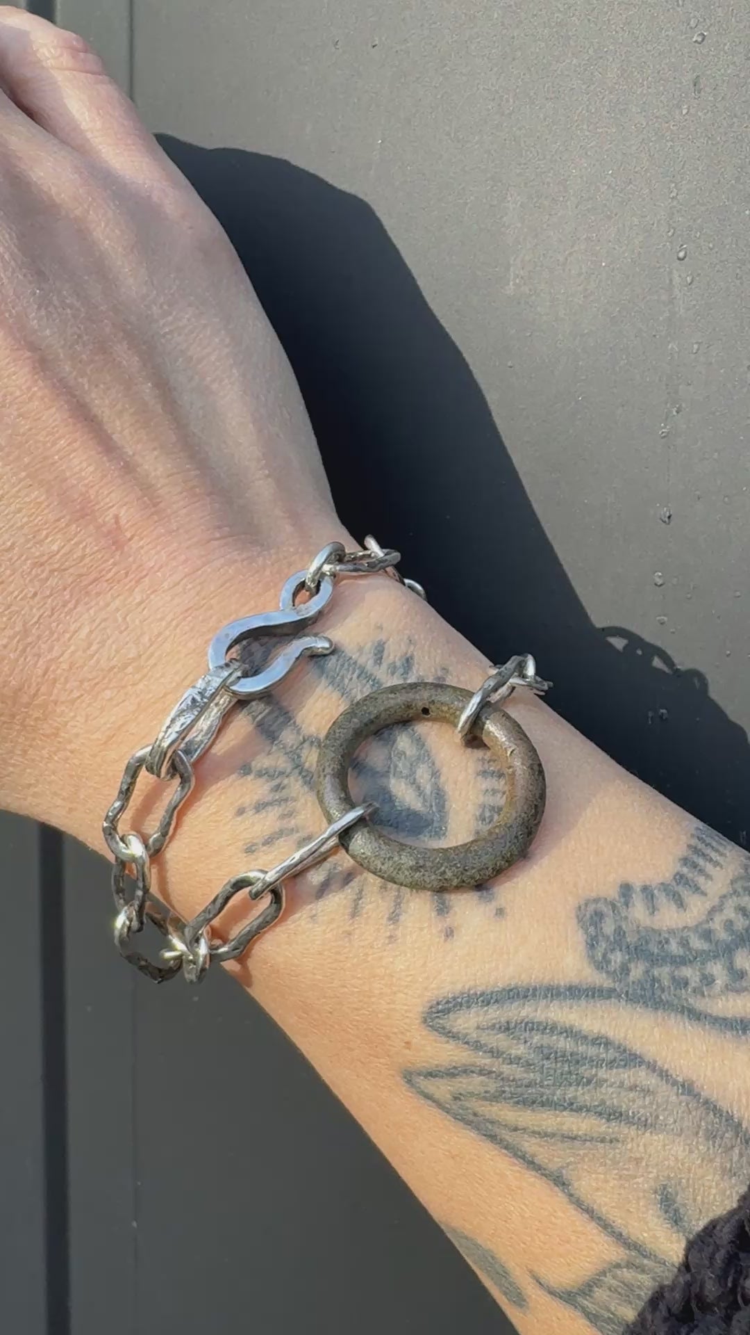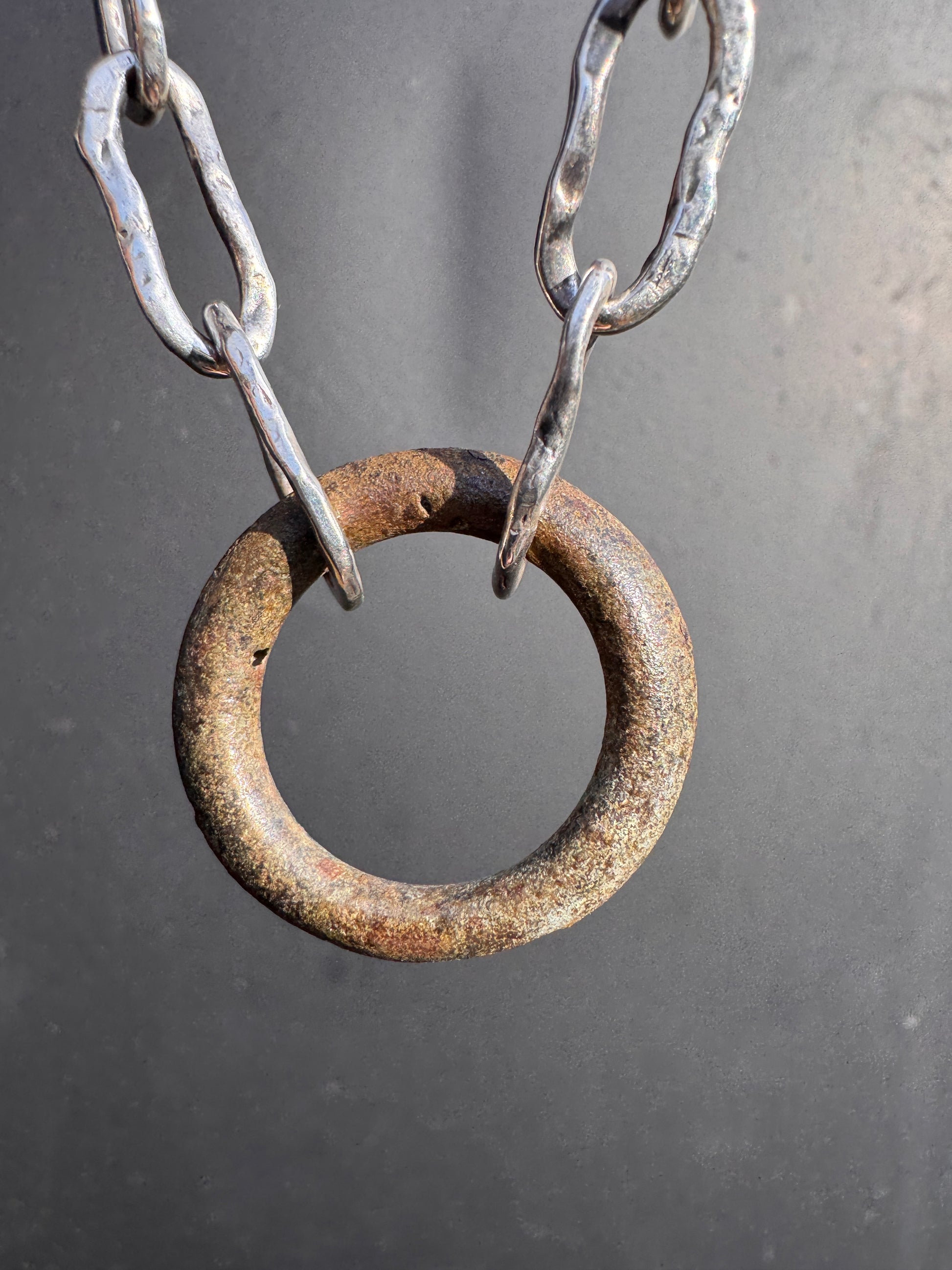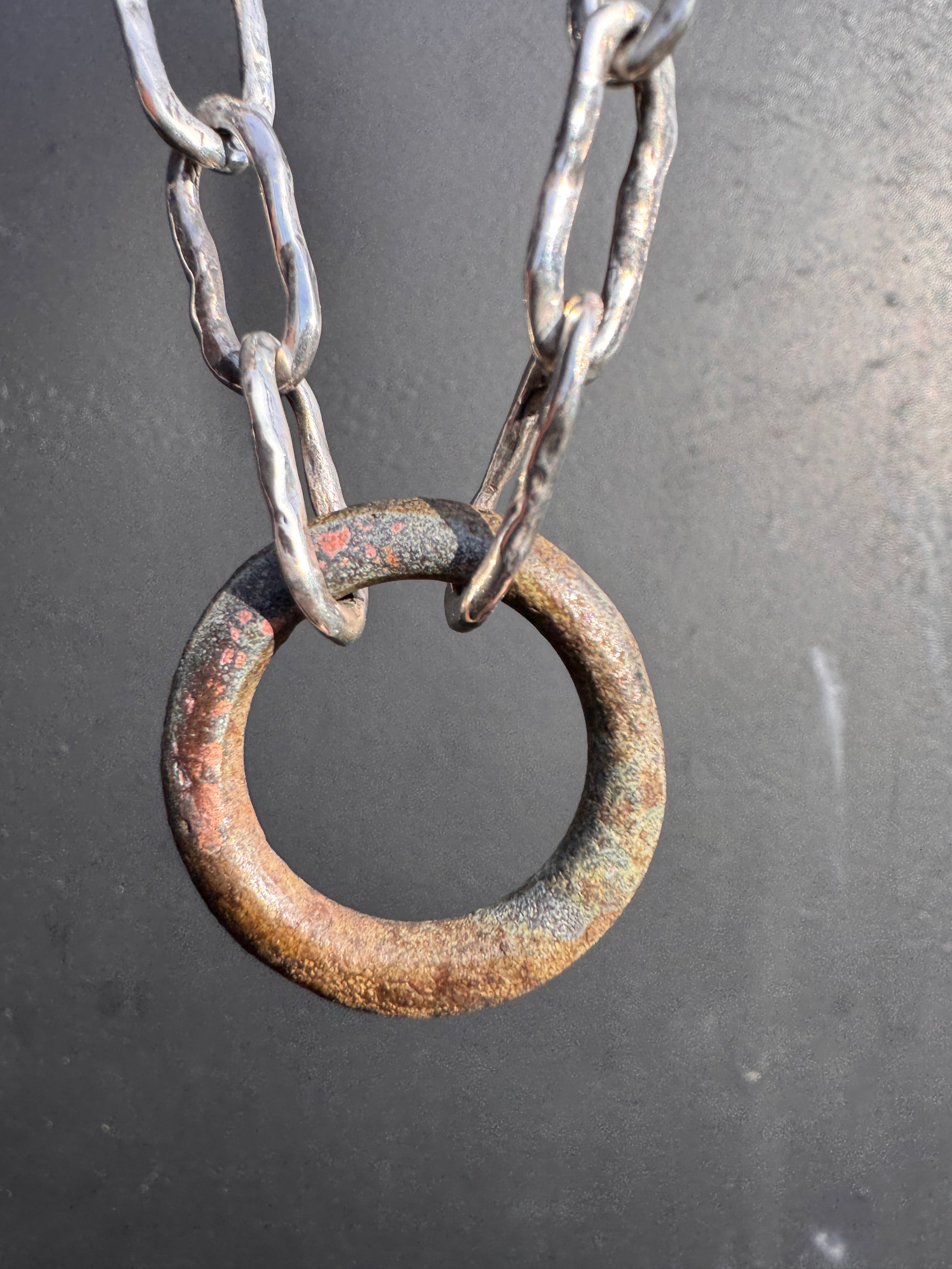 A 2000 year old ancient bronze Celtic money ring entwined with hand forged chunky sterling silver chain. These money rings are thought to be an early currency prototype, as they are found in coin like caches. They could also potentially also have multiple functional uses such as clothing fasteners. Swipe to see how This bold minimalist choker chain also doubles as a bracelet. Currently fits a medium to small neck size and measures 14.5 inches in length.
