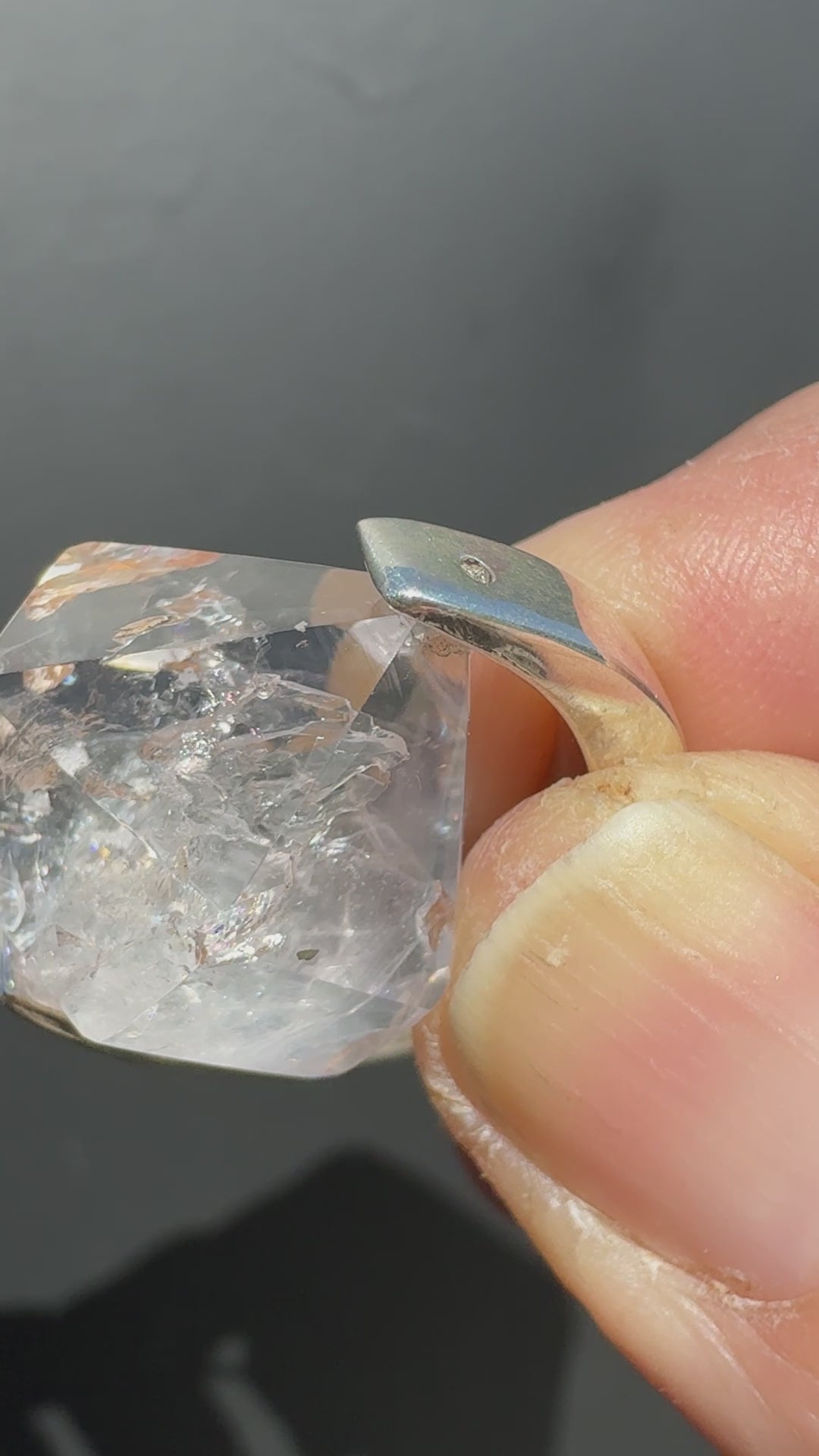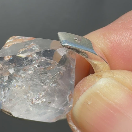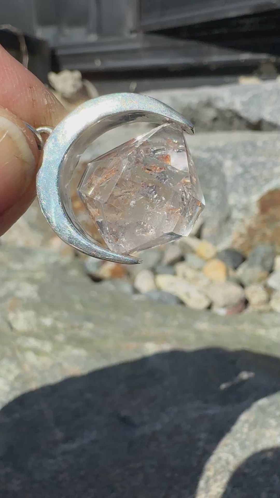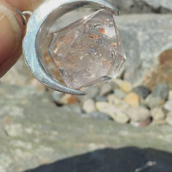Sterling silver crescent frame containing natural enhydro quartz crystal. Comes on 18 inch sterling silver chain.